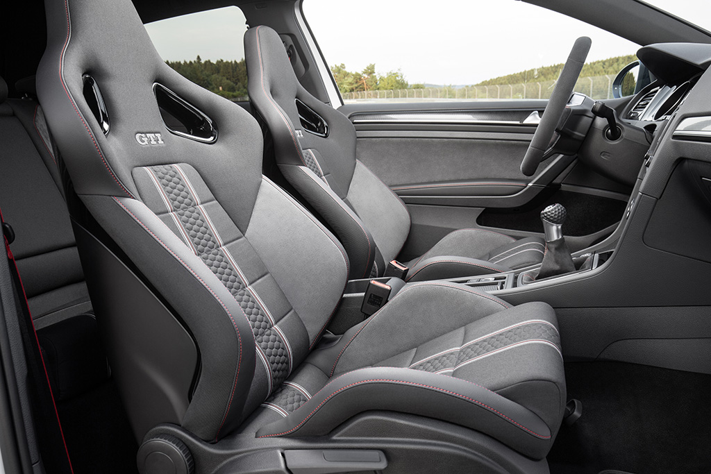 Sportovní atmosféru v interiéru umocňují ergonomická, anatomicky tvarovaná sportovní sedadla, exkluzivní prahové lišty z ušlechtilé oceli s červeným nápisem GTI, červené ozdobné prošívání, červená linie na bezpečnostních pásech, hlavice řadicí páky v novém designu a černé čalounění stropu.