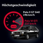 → Nejvyšší rychlost: 196 km/h (Polo II GT G40) / 237 km/h (Polo VI GTI)