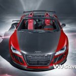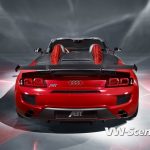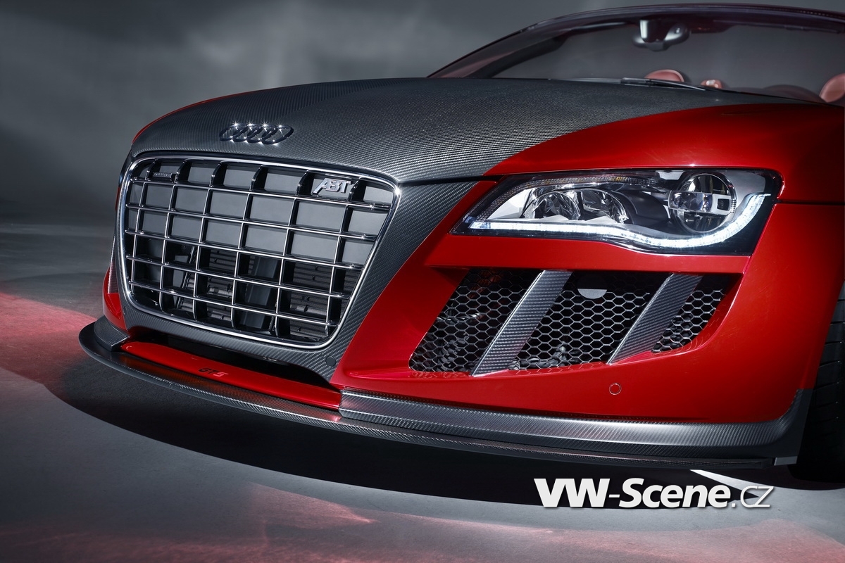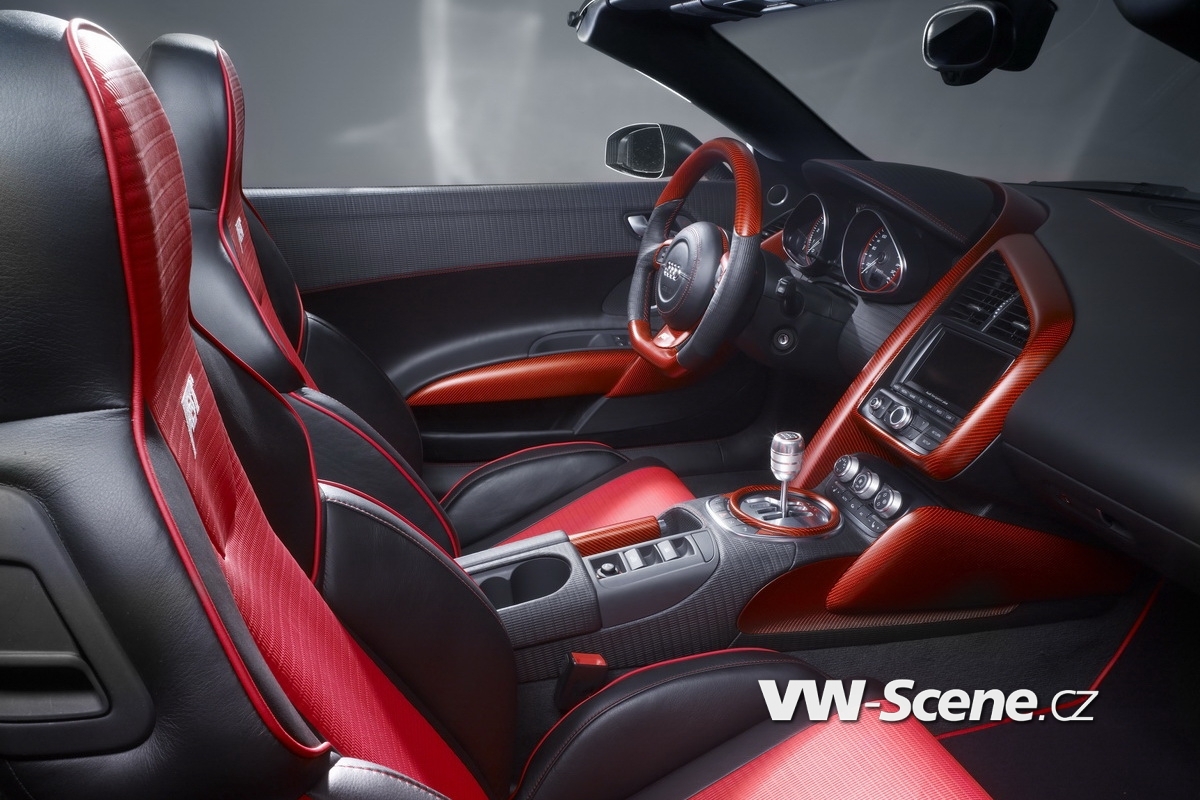 V takovém kalupu asi nikdo nebude mít moc čas si prohlédnout vizuální krásy auta, ale pokud by se někde jen na chvíli zastavilo, mohlo by celé jeho okolí prohlížet epesní dvacetipalcová kola BR vlastního designu, které opticky perfektně ladí se zbytkem auta. Je totiž dobré podotknout, že úpravce nijak nešetřil a spoustu dílů karosérie vyměnil za karbonové duplikáty. A tam, kde nebylo možné použít pravá karbonová vlákna, tam aspoň využil alternativy v podobě karbonové fólie. Pravého karbonu je na autě ale i tak požehnaně. Tak například difuzor, rozměrné přítlačné křídlo, nebo přední splitter. Už jen tento krátký výčet položek svědčí o faktu, že R8 GT S Spyder v úpravě Abt nebude nic laciného, ale na přesný ceník si budeme ještě muset počkat.