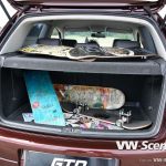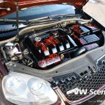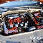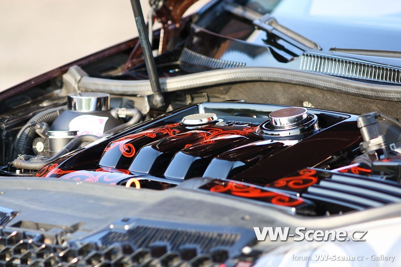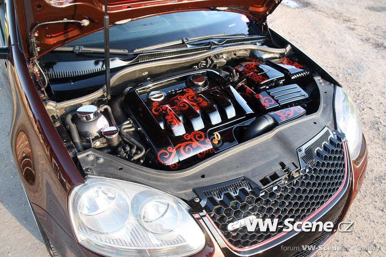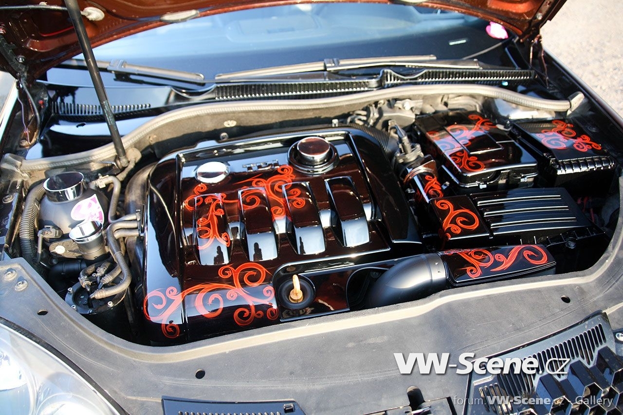 Ale nyní zpět k Baryho Golfu. I zde se pod kapotou jako u Fabie nachází vznětový čtyřválec 1,9 TDI s pohonem předních kol. Motor disponuje výkonem 127kW, k němuž pomáhá větší turbo Garett 1749 VB z Golfa IV a chip od MVOLESKA. Zároveň byl vyměněn středový a koncový díl výfuku a odstraněn katalizátor. Motorový prostor je v černém klavíru doplněný airbrushem. Vše doplňují leštěná víčka kapalin.