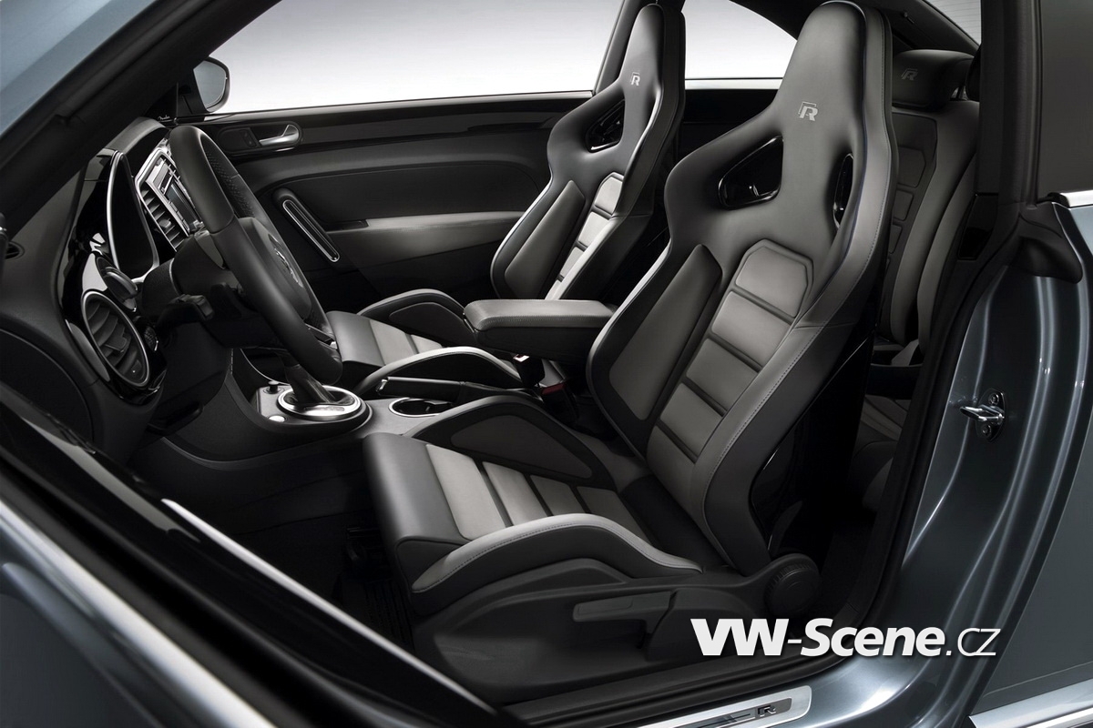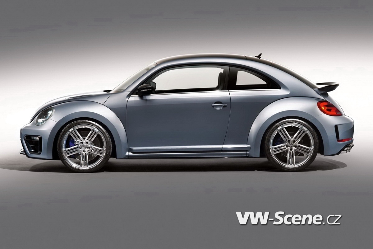 Předváděcí auto bylo vystaveno v nikterak strhující šedé Serious, ale i tak vypadá vcelku zajímavě. Především za to může skutečnost, že Beetle R Concept poněkud přibral v bocích (+30 mm vpředu i vzadu), takže využívá masivnější blatníky a členitější nárazníky se zvětšenými vstupy a výstupy vzduchu. Dále to jsou nové přední lampy s pásky z LED-diod a všechno to vrcholí pohledem z profilu, jemuž dodávají grády dvacetipalcové disky. Samo sebou nechybí ani okaté laufy výfuku s chromovanými koncovkami vykukujícími zpod difuzoru nebo větší křídlo usměrňující obtékání vzduchu. Sportovní šmrnc pak podtrhuje modifikovaný interiér s anatomickými sedadly čalouněnými kůží Nappa.