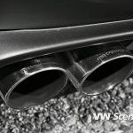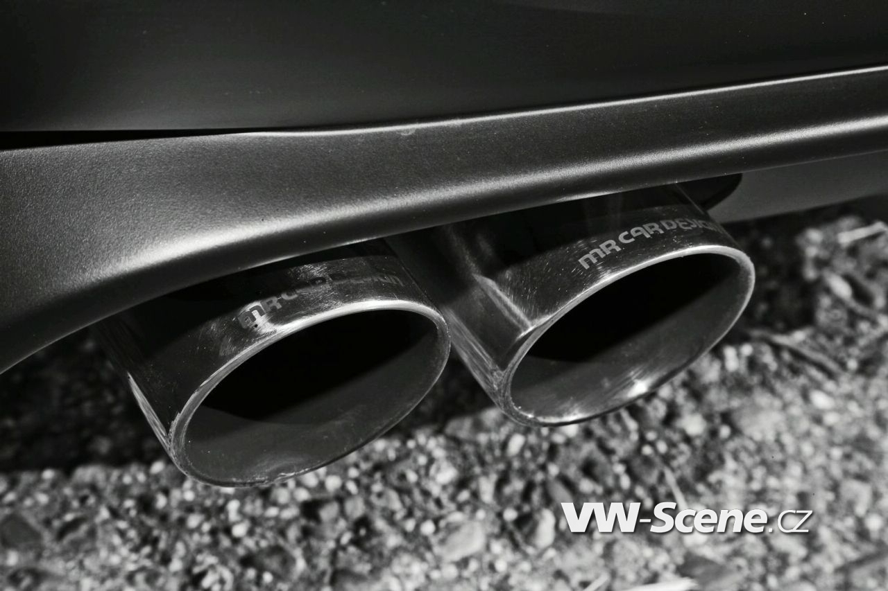 Ještě na chvíli se vrátíme zpátky pod kapotu. Ptáte se, jak dostali z dvoulitrového motoru 370 koní? Největší podíl na tom má použití nového přeplňování typu Stage 3 Turbokit dokonce i z mezichladičem. Velký podíl na tom má také optimalizace řídící jednotky motoru a celý sportovní výfukový systém, který je ukončen dvěma mohutnými agresivními dvojkoncovkami, které se tlačí do středu vozu.