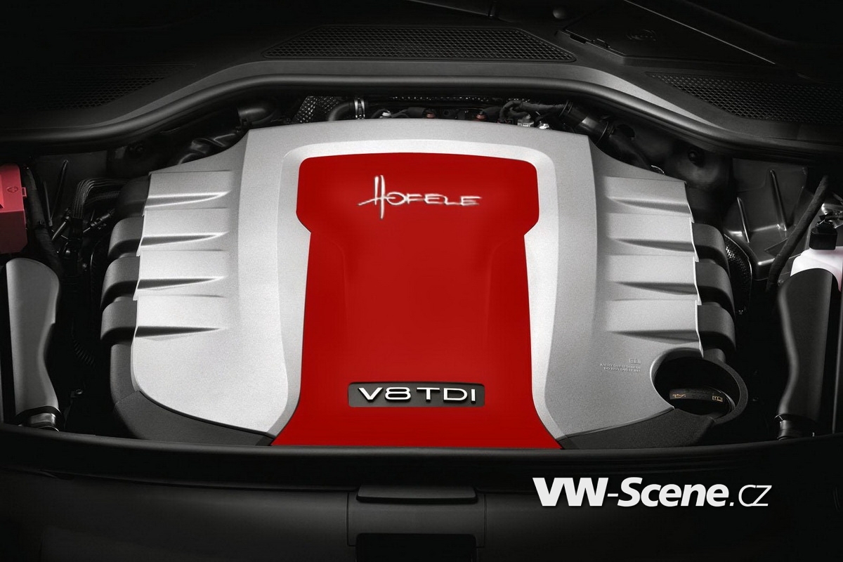 Daleko dřív si ale každý všimne obrovitých kol. Nabídka úpravce začíná průměrem dvacet palců, ale ty opravdu krásné mají rozměr 10Jx22“. Jejich cenu asi lepší nevědět, pokud o ně nemáte opravdu enormní zájem, stejně jako o elektronický podvozek ETS se 40mm rozpětím a automatickým „přikrčením“ v rychlostech nad 70 km/h. Když už jsme u té rychlosti, nabízí se otázka motorizace. Hofele Design zatím nabízí úpravy dvou agregátů: benzín 4,2l FSI upraví na 390 koňských sil stejně jako naftový 4,2l TDI CR, který navíc přidá enormní zátah 900 Nm.