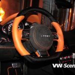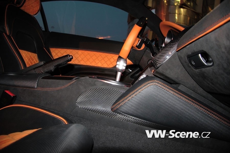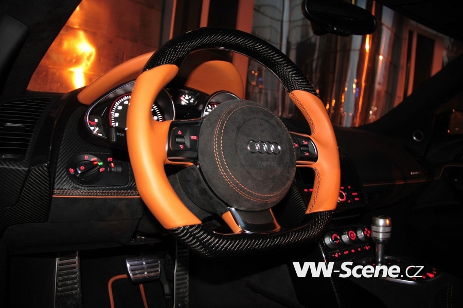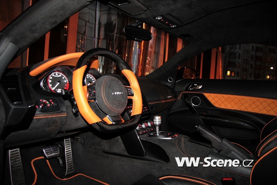 V interiéru byla použita černá Alcantara doplněná kůží ve stylu černého karbonu. Vše ještě podtrhují oranžové doplňky a prošití. Jednoduše shrnuto 589 koní, špičkový černý lak, doplněný uhlíkovými doplňky a impozantní interiér, to je Audi R8 – Black Edition.