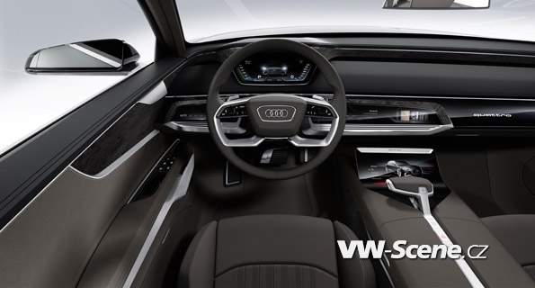 Luxusní interiér byl navržen v tmavých barvách. I v něm nabízí studie nové zážitky. Přímočaré uspořádání je v dokonalém souladu s konceptem zobrazování a ovládání. Konzistentně navržené čelo přístrojové desky je sestaveno ze tří dotykových displejů. Kromě toho mohou řidič a až tři spolucestující vzájemně digitálně komunikovat prostřednictvím dvou displejů OLED z organických elektroluminiscenčních diod. Extrémně štíhlé, odnímatelné displeje OLED v zadní části interiéru – upravená verze systému Audi tablet z nového Audi Q7* – přinášejí cestujícím podle potřeby informace nebo zábavu.