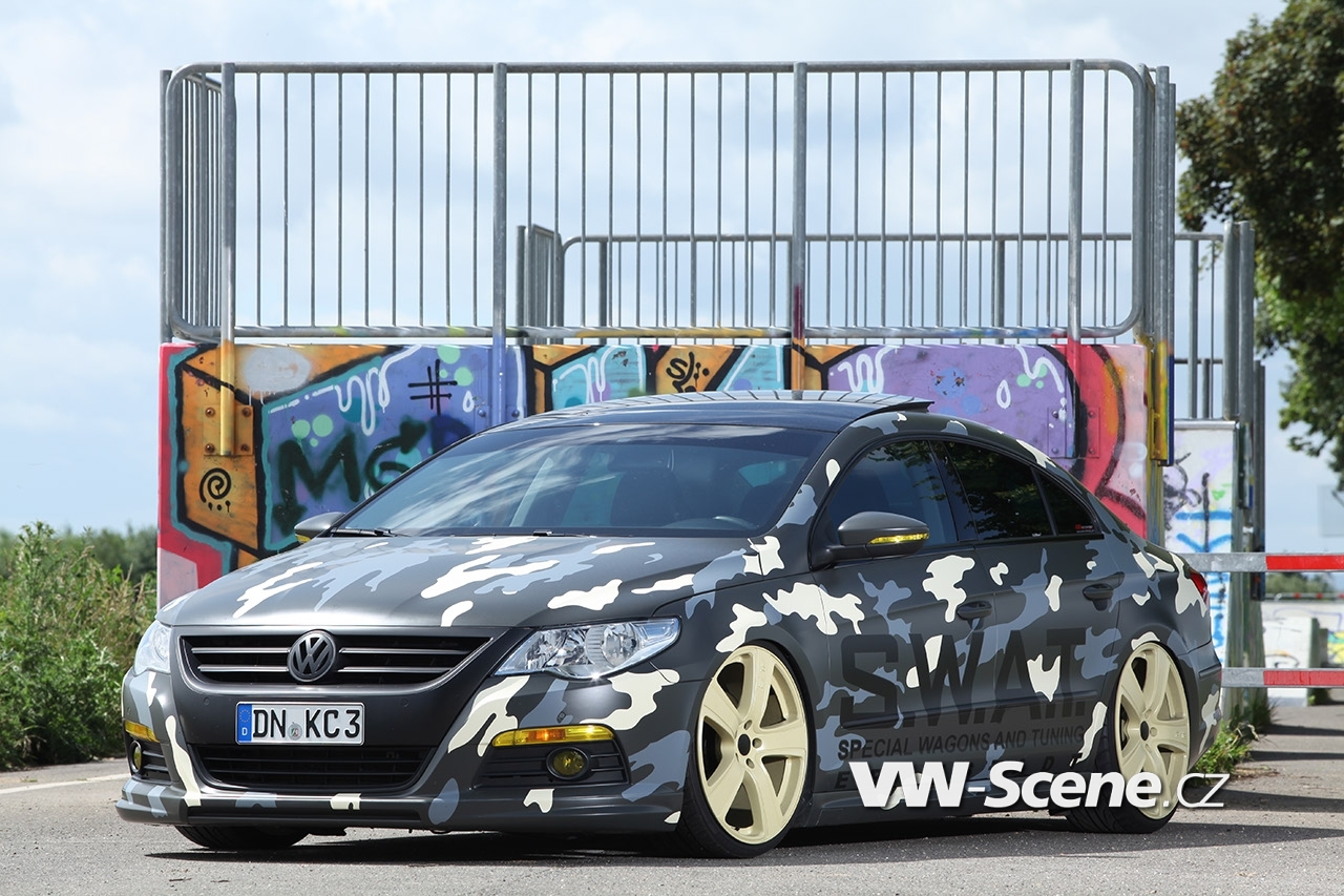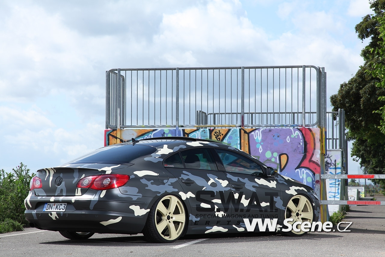 Volkswagen Passat CC byl původně neatraktivně olivově šedý. Ale během nákladného procesu maskování, dostal zbarvení, které známe spíše u armády. Na boku vozu je ještě velký nápis S.W.A.T. – Special Wagons And Tuning. Upřímně řečeno, kdo by si nechal ujít pohled na takové auto?