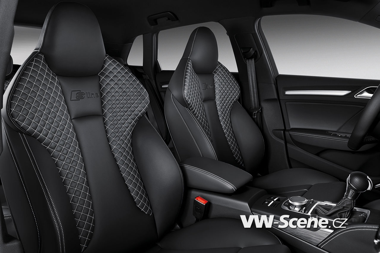 Sportovní paket S line, dodávaný pro A3 Sportback Ambition, ponoří interiér kompletně do černé barvy. Sportovní sedadla jsou potažena kombinací tkaniny Biathlon a kůže. Ušlechtilým prvkem jsou stříbrné kédry a stehování na podlahových rohožích. Ozdobné lišty jsou vyrobeny z matného kartáčovaného hliníku nebo se lesknou černou barvou v 3D designu. Paket završuje hlavice řadicí páky obšitá perforovanou kůží a speciální sportovní volant s věncem obšitým kůží.