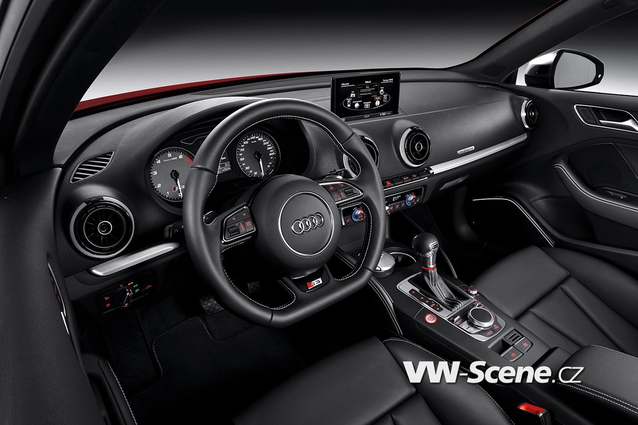 Interiér modelu S3 je včetně čalounění stropu černý a zvýrazněný kontrastním stehováním. Alternativně se dodává dvoubarevné provedení Audi design selection v odstínech černá/červená korso. Na prahových lištách, volantu, hlavici řadicí páky/páky voliče a na přístrojích jsou loga S. Komfortní dvouzónová automatická klimatizace a paket odkládacích schránek patří k sériové výbavě modelu Audi S3.