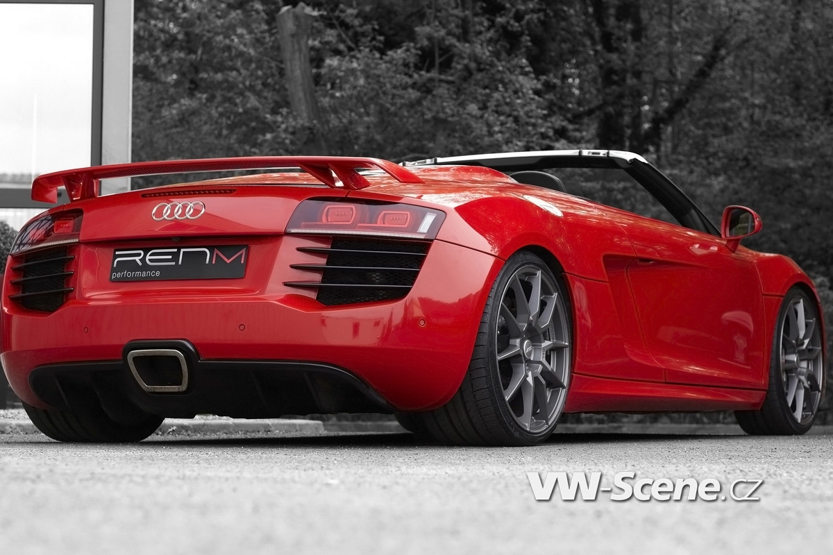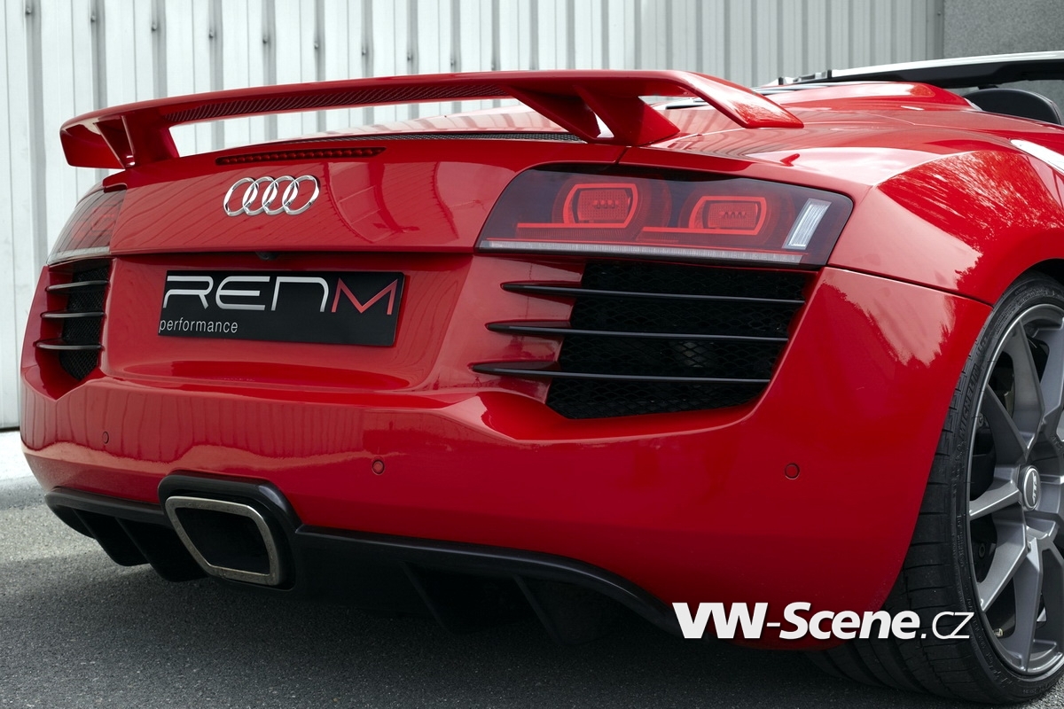 Proto na masku putoval nový gril kombinující karbon s kevlarem, do nárazníku přibyly náporové kanály směřující vzduch k brzdám, nárazník samotný dostal splitter, a zadní difuzor má jiný tvar. Podle tvrzení úpravce byly všechny zásahy vedené tak, aby měly reálný (a především kladný) vliv na vylepšení jízdní dynamiky – ovladatelnost, přítlak, vztlak, včetně vyvážení mezi nápravami. Aby toho nebylo málo, nabízí RENM Performance na auto dva druhy obutí. Prvním jsou 20“ disky pro běžné ježdění a k nim 19“ alternativa pro jízdu na okruhu. Oboje disky prý vznikly v úzké spolupráci s fabrikou ATS a mají vynikat opravdu nízkou hmotností. Jak se zdá, RENM Performance to myslí s R8 V10 smrtelně vážně, ale evropští matadoři se asi ohroženi cítit nemusí…