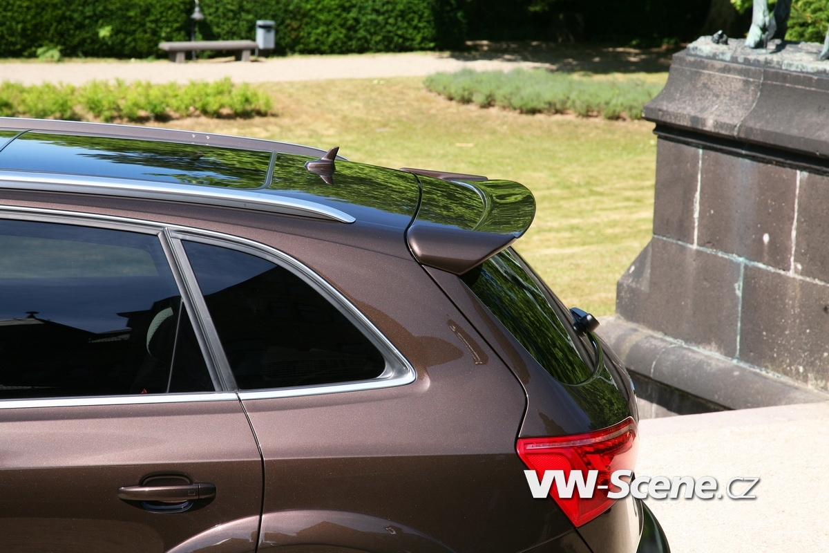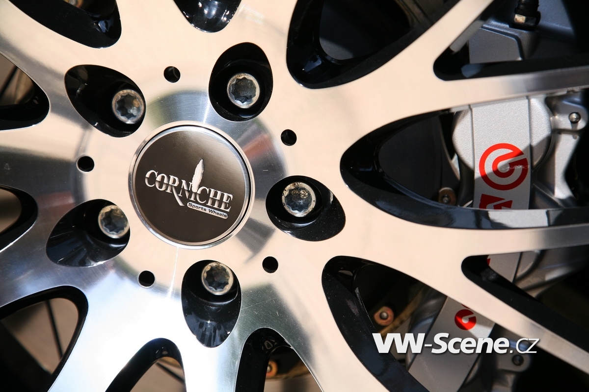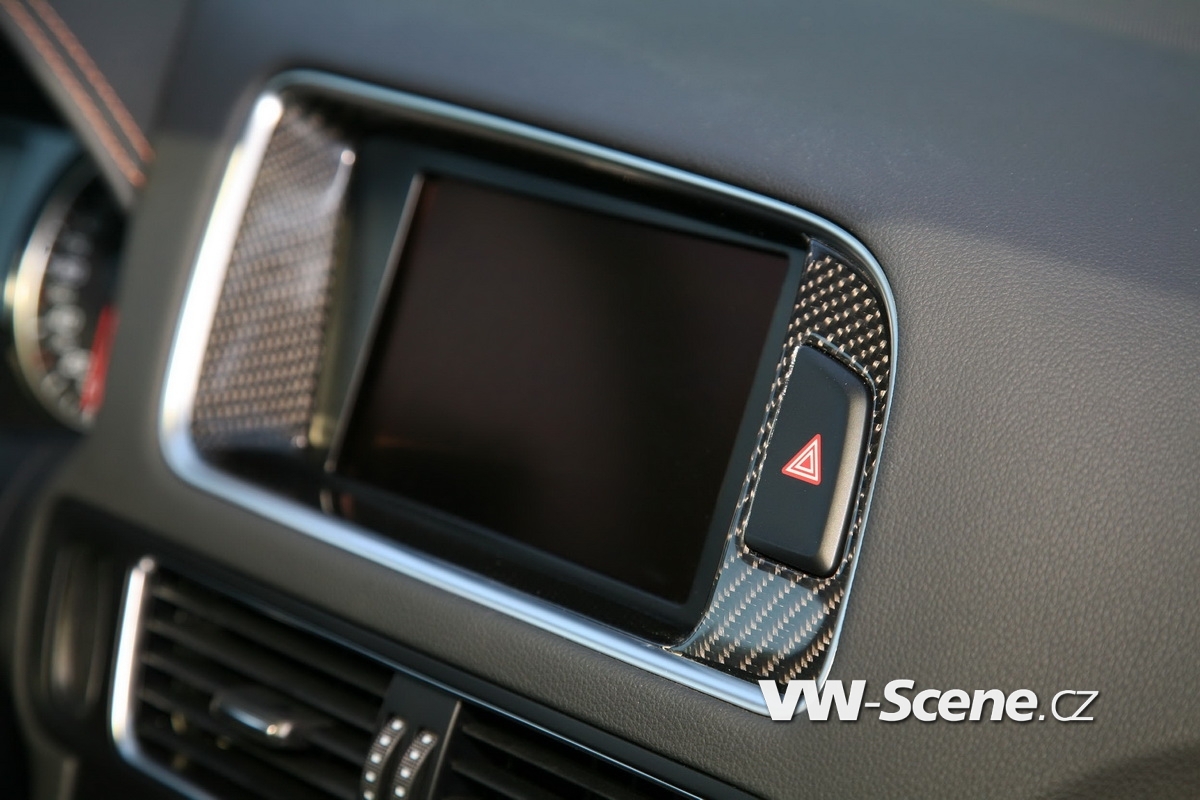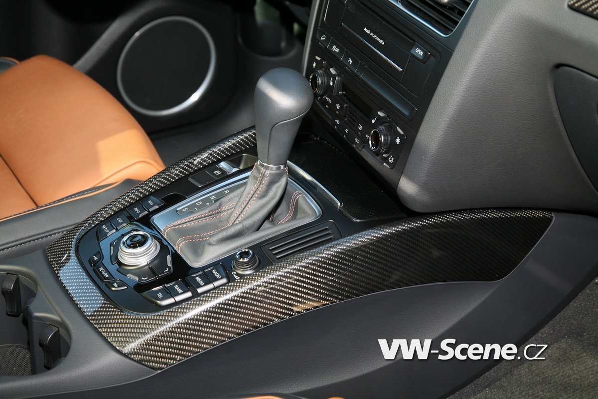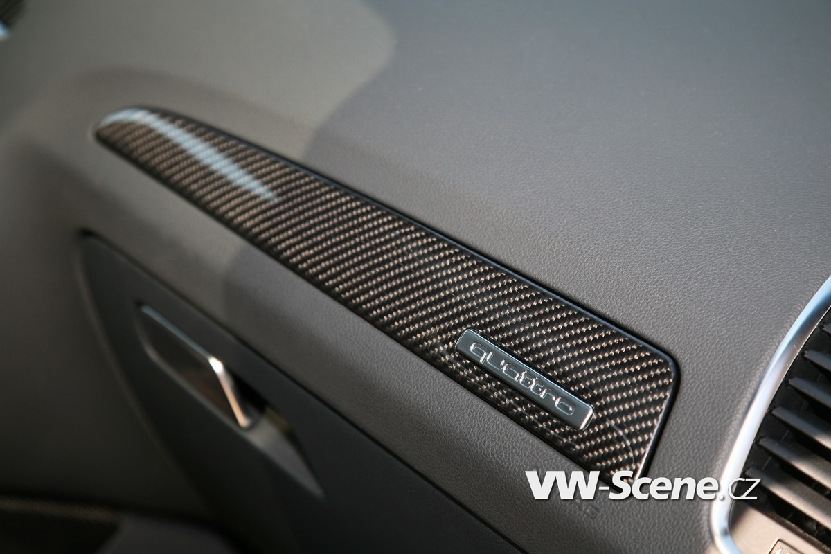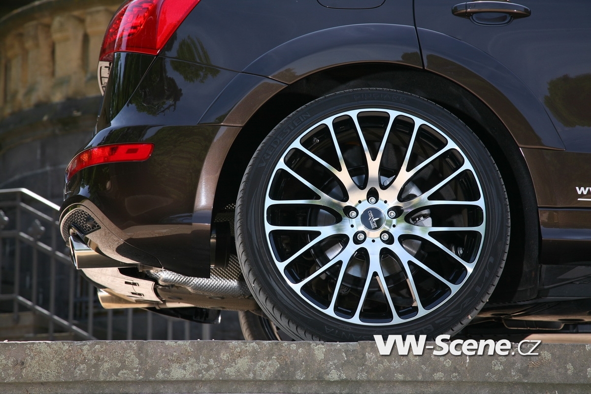 Techniku zastupují nijak skromné brzdy Brembo na přední nápravě. Jejich třmeny pracují s šesticí pístků na každé straně, přičemž svírají masivní kotouče průměru 380 mm. Velké jsou i koncovky laděného výfuku, které si ze zadního nárazníku ukrojily po 100 mm na každé straně. Korunu optice nasadila nádherná dvaadvacetipalcová kola, která by se z fleku mohla rovnat staršímu bratrovi Q7 W12. Šířku deseti palců zakrývají pneumatiky 265/35 R22 a mezera mezi nimi a podběhy se díky kratším pružinám (-45 mm vpředu a -40 mm vzadu) smrskla na minimum.
