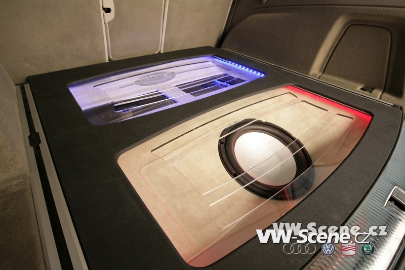 Interiér je jako ze škatulky. Světlá kůže je dokonalá, ale nejvíce zaujme obklad z pravého červeného karbonu. Ten se objevil na obkladech dveří, středové konzoly a štítku přístrojů. Tahle sranda stojí ale 3.317,-€. Trochu drahá sranda. Hifi komponenty rozmístěné v interiéru ale stojí třikrát více. Jak by také ne, vždyť se skládá jen z těch nejlepších komponentů. Harman Kardon Drive & Play 2 – iPOD s barevným displej, Harman Kardon CA 470 – 4kanálový zasilovač) pro přední a zadní část vozu, Harman Kardon CA 1500 M – Mono zesilovač (360 Watt RMS při 4 Ohm, 600 Watt RMS při 2 Ohm), Infinity Frontsystem, Infinity Hecksystem, Infinity Kappa Perfect VQ: 12″ (30cm) Subwoofer a Rockford Fosgate 3sixty signálový procesor.