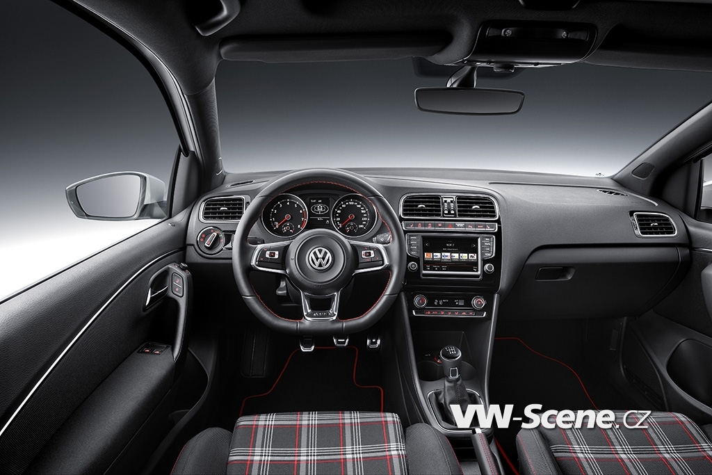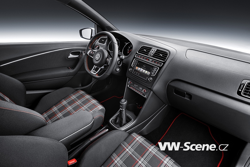 Typické GTI. Červená barva GTI strhává na sebe pozornost i ve sportovně navrženém interiéru. Kůží obšitý sportovní volant, převzatý z Golfu GTI, má červené kontrastní stehování stejně jako řadicí páka nebo páka ruční brzdy. Podlahové rohože mají červené lemování. Pro řidiče a spolujezdce jsou připravena výškově nastavitelná a vyhřívaná sportovní sedadla, jejichž prostřední plochy jsou potaženy exkluzivní tkaninou Clark (vnější plochy jsou černé s červeným kontrastním prošíváním). Sportovní sedadla s kostkovaným vzorkem patří od prvního GTI z roku 1976 k základní výbavě této sportovní ikony. Středová loketní opěrka vpředu (s odkládací schránkou), sdružené přístroje v designu GTI, černé čalounění stropu a kryty pedálů se vzhledem hliníku završují exkluzivní, dynamickou atmosféru.