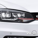 Čelní partie GTI. Polo GTI může být poprvé na přání vybaveno světlomety s diodami LED pro funkce tlumených a dálkových světel. Diody LED v tomto případě zajišťují také funkci světel pro denní svícení. Mezi typické znaky modelu Polo GTI patří červené linie, které ohraničují masku chladiče s voštinovou strukturou, která je pro modely GTI typická. Maska chladiče je v novém Polu GTI protažena až do světlometů. Spodní, výrazně větší otvor pro přívod vzduchu dostal rovněž nově tvarovanou mřížku s voštinovou strukturou. Tento otvor je po stranách rámován sériově dodávanými mlhovými světlomety (včetně funkce odbočovacích světel) a spoilerem, inspirovaným motoristickým sportem.