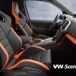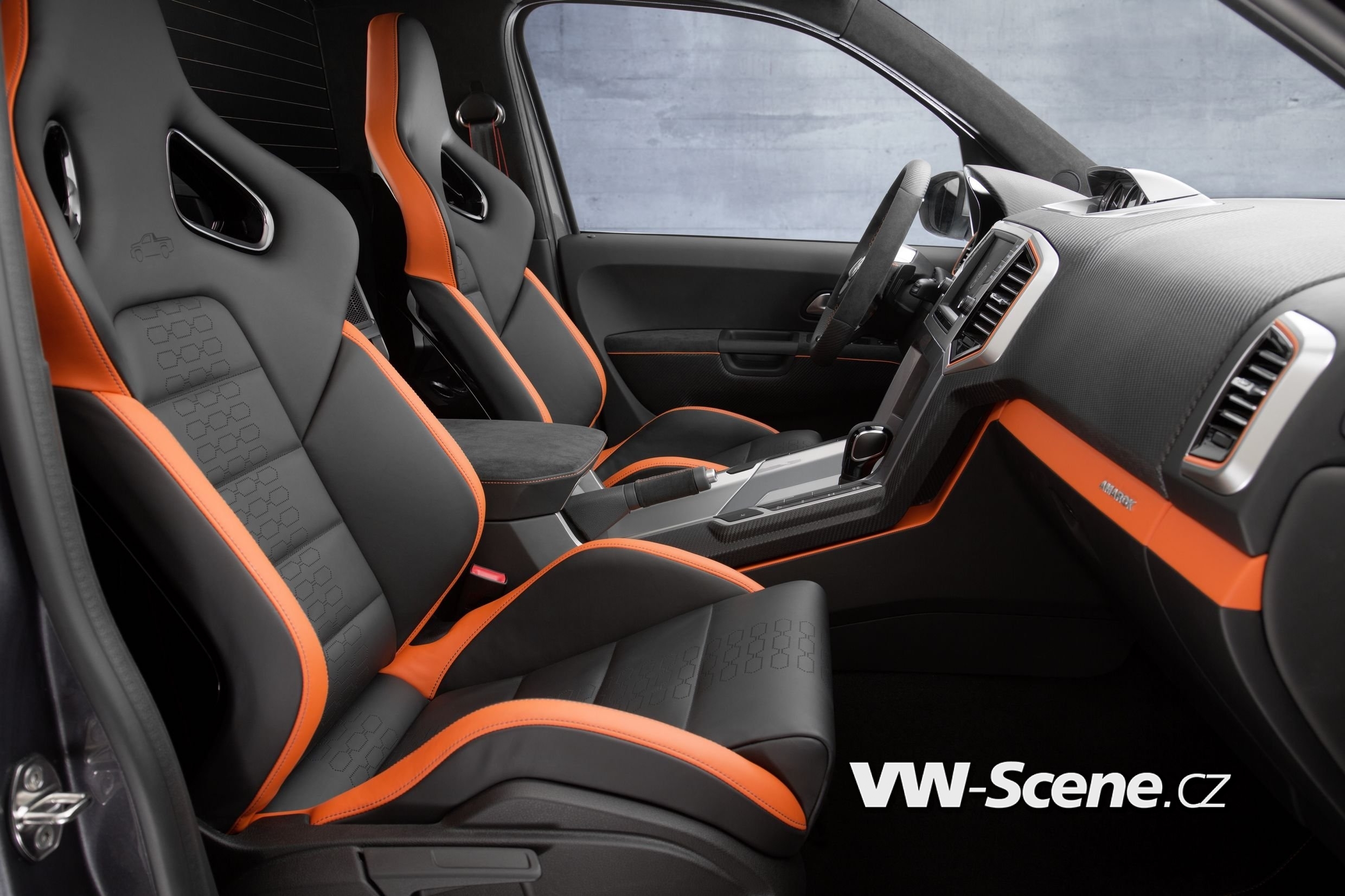 Atmosférou technické vytříbenosti dýchá také interiér, v němž zaujme kombinace ušlechtilé kůže Nappa v odstínech černá a „orange power“, velmi kvalitní kůže na přístrojové desce, jejíž povrchová úprava napodobuje strukturu uhlíkového kompozitu, a černé Alcantary na volantu, skořepinových sedadlech a výplních dveří. Mimořádnou pozornost věnovanou detailům dokládá také vzorek perforování potahů sedadel, v němž se opakuje voštinový motiv z masky chladiče. Do kůže pod integrovanou opěrkou hlavy je laserem vyrytá silueta Amaroku.