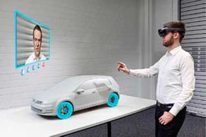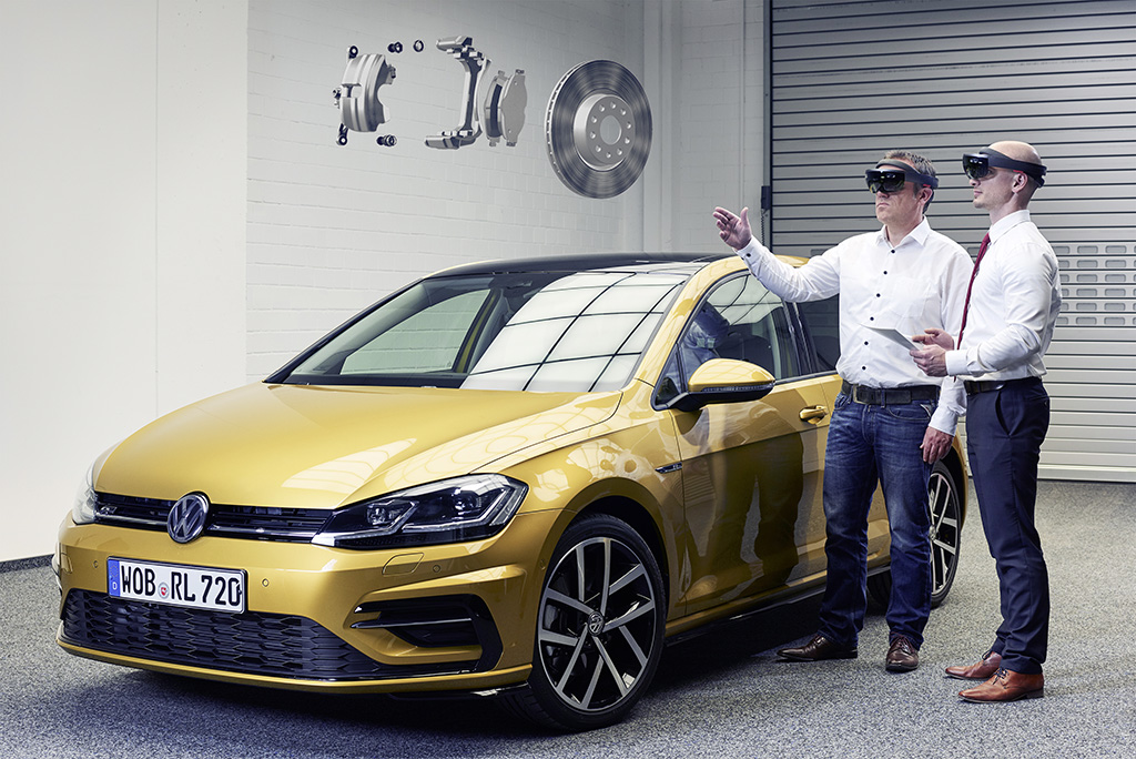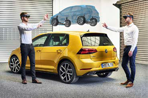 Ostermann má nasazeny brýle pro smíšenou realitu, tzv. HoloLens. Přenosný počítač, vyvinutý společností Microsoft, promítá virtuální zobrazení na fyzický objekt podle pokynů gest a hlasových povelů. Stačí, aby Ostermann ukázal prstem, a HoloLens okamžitě „oblékne“ model Golfu do odlišné barvy laku, pak mu „namontuje“ jiná kola a změní nárazníky.