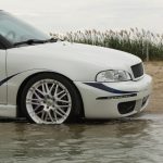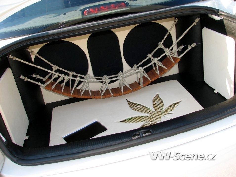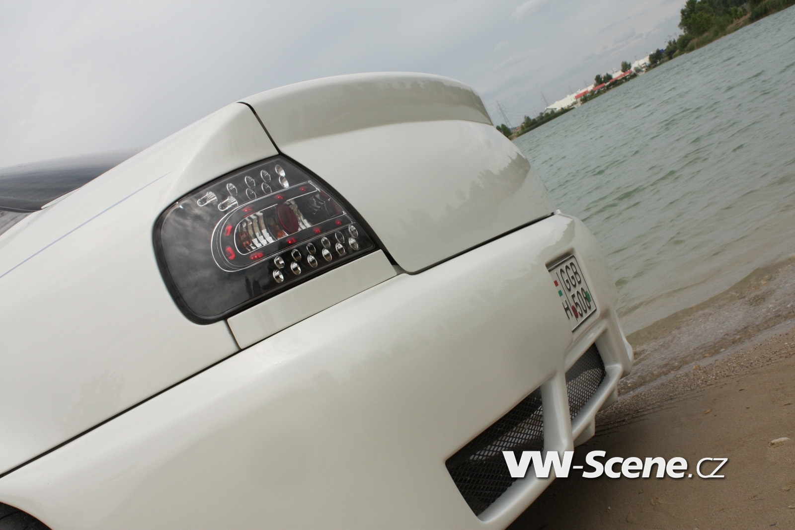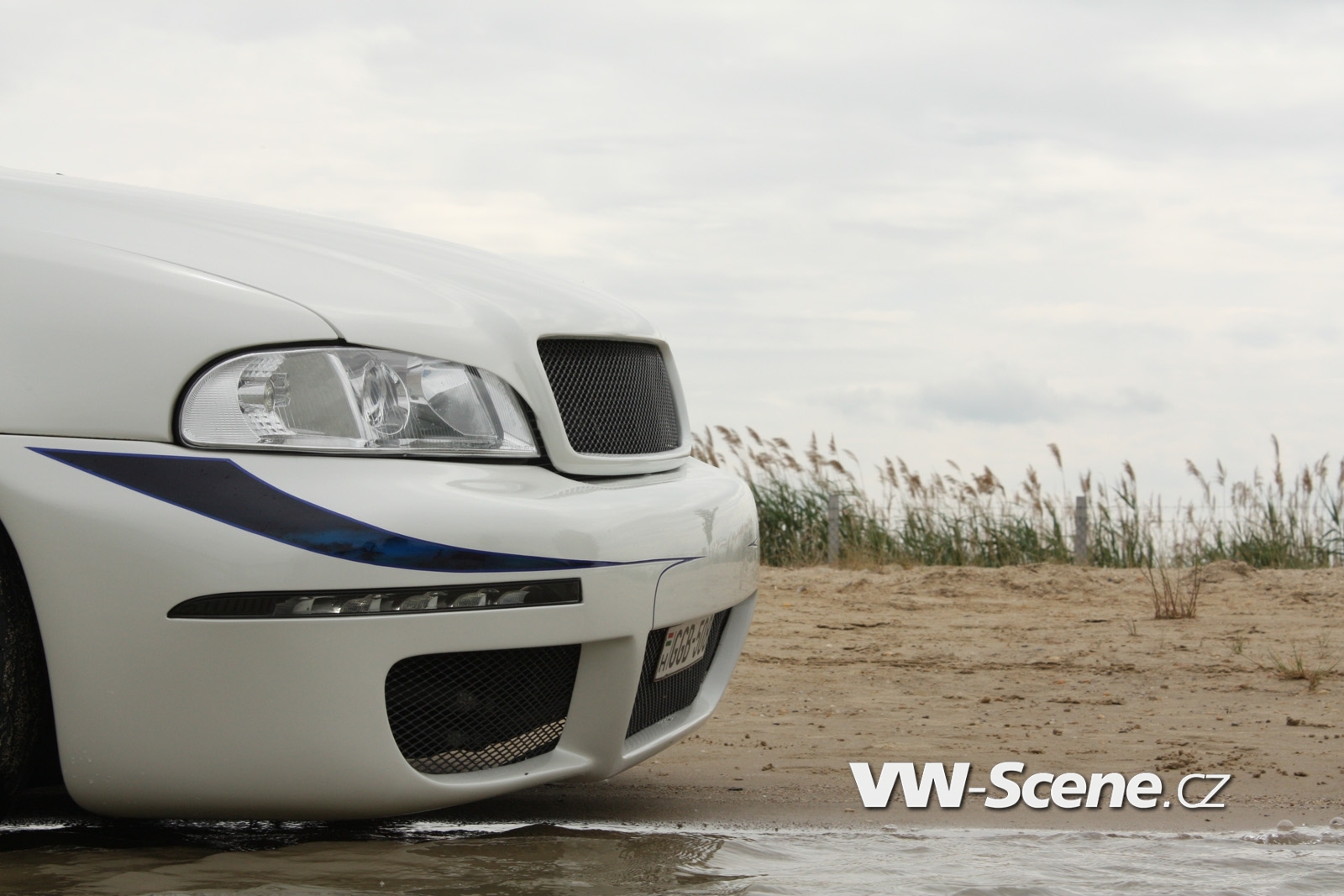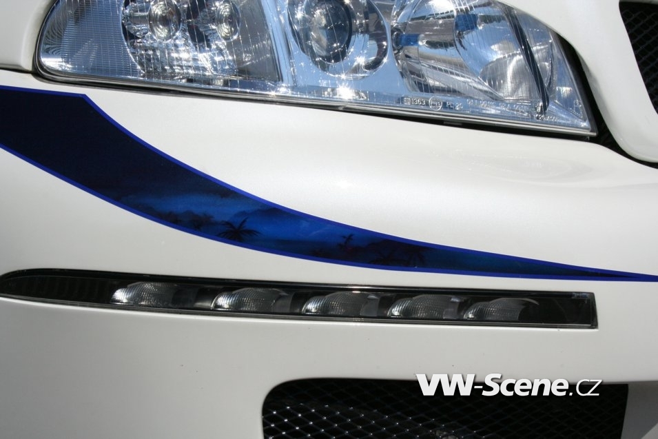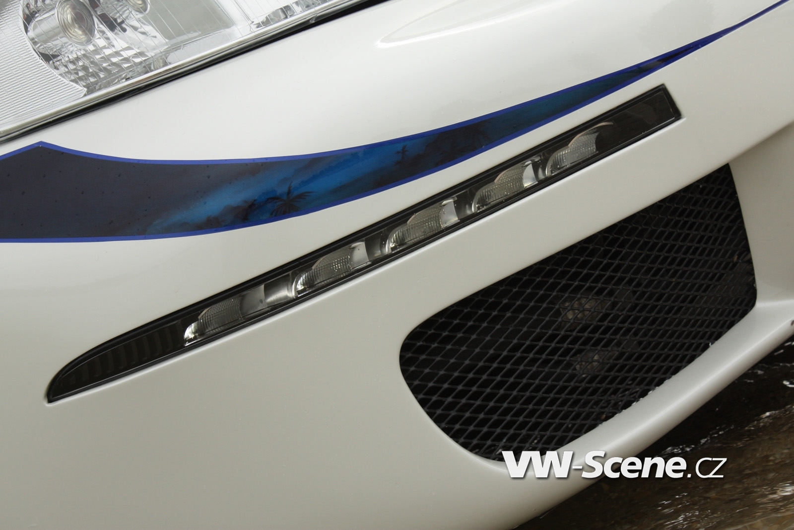 Pokud se podíváte z dálky, tak je vůz bílý z modrými doplňky, ale jak přijdete blíž, tak zjistíte, že tyto doplňky nejsou leda jaké, jelikož jsou v nich malé obrázky ve stylu pláže, které museli dát hodně velkou práci. Celý vůz zdobí 18ti palcová kola od Oxigin 14, na kterých jsou obuty pneumatiky značky Yokohama o rozměrech 225/40 R18, což sice není moc, ale nic se nemá přehánět. Pod těmito koly nalezneme brzdy D2 8PoT s kotoučem o velikosti 330mm. V předním nárazníku úplně přibylo denní svícení, které je z Audi S6. Oba nárazníky byli upraveny a v zadních světlech nechybí LED. Co se týče kapoty, tak ta dostala sportovnější nádech a víko kufru zůstalo stejné. Když už jsme u toho kufru, tak ten je poněkud zajímavý, jelikož zde nalezneme obrovskou reprobednu, ale také parádní ozdobu, která vypadá dobře, ale moc praktická asi nebude. Pokud se vrátíme k podvozku, tak zde jsou ještě nové tlumiče od společnosti KONI, které se dají nastavovat dle potřeby.