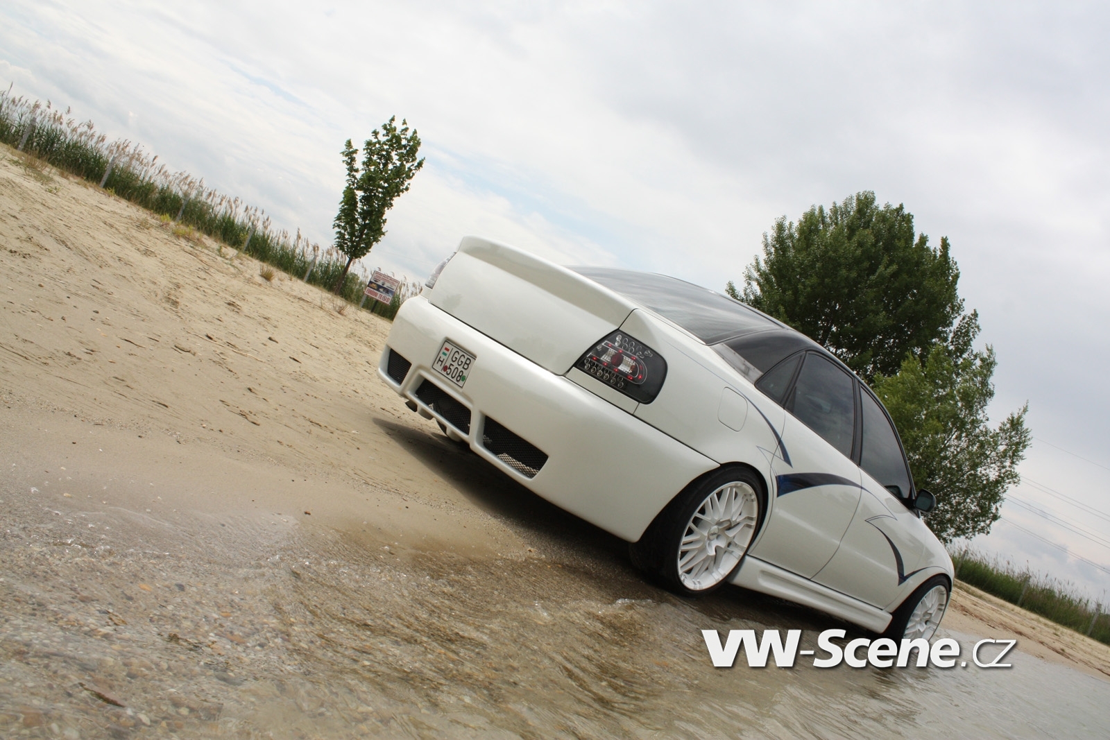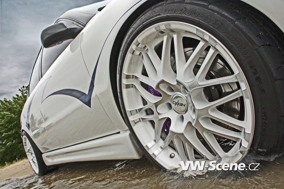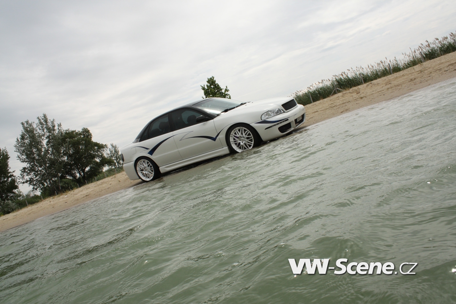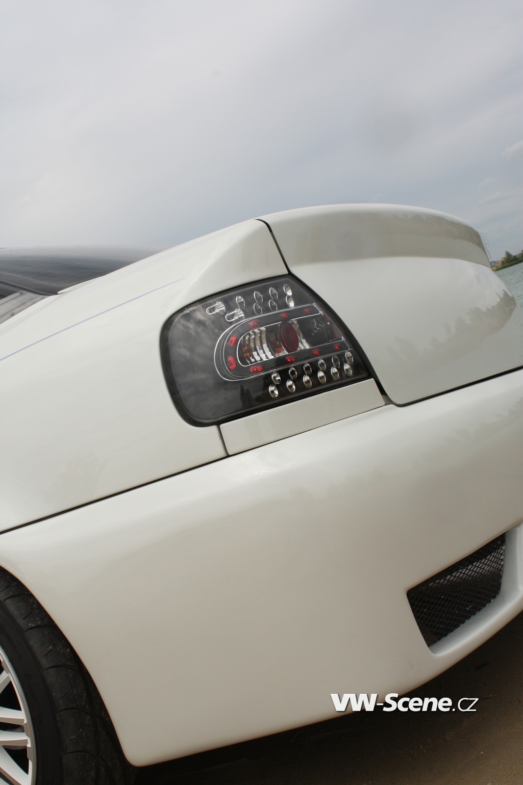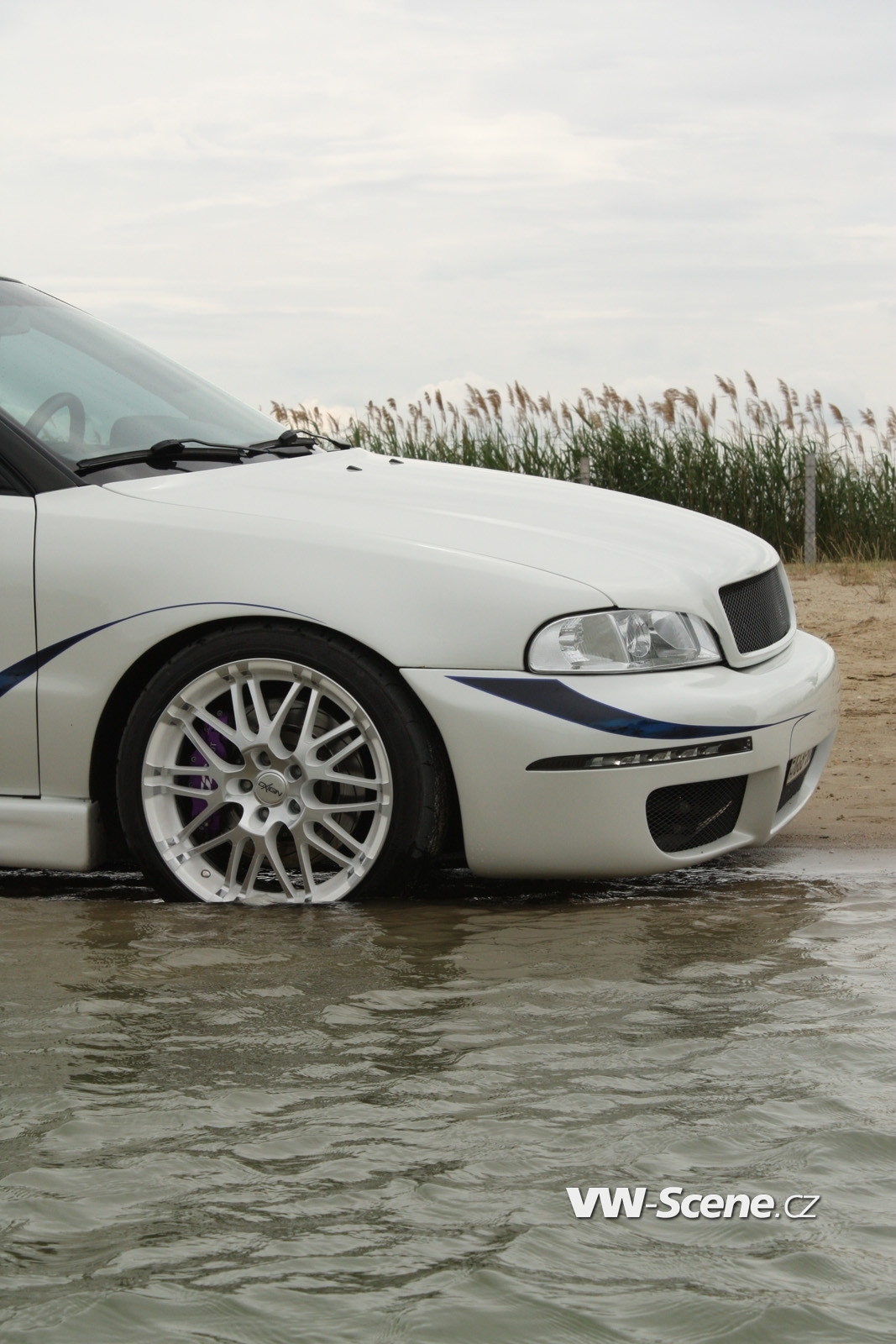Pokud se podíváte z dálky, tak je vůz bílý z modrými doplňky, ale jak přijdete blíž, tak zjistíte, že tyto doplňky nejsou leda jaké, jelikož jsou v nich malé obrázky ve stylu pláže, které museli dát hodně velkou práci. Celý vůz zdobí 18ti palcová kola od Oxigin 14, na kterých jsou obuty pneumatiky značky Yokohama o rozměrech 225/40 R18, což sice není moc, ale nic se nemá přehánět. Pod těmito koly nalezneme brzdy D2 8PoT s kotoučem o velikosti 330mm. V předním nárazníku úplně přibylo denní svícení, které je z Audi S6. Oba nárazníky byli upraveny a v zadních světlech nechybí LED. Co se týče kapoty, tak ta dostala sportovnější nádech a víko kufru zůstalo stejné. Když už jsme u toho kufru, tak ten je poněkud zajímavý, jelikož zde nalezneme obrovskou reprobednu, ale také parádní ozdobu, která vypadá dobře, ale moc praktická asi nebude. Pokud se vrátíme k podvozku, tak zde jsou ještě nové tlumiče od společnosti KONI, které se dají nastavovat dle potřeby.