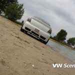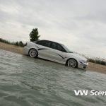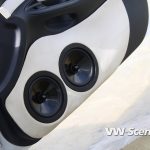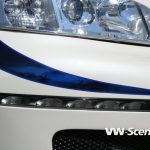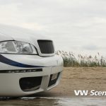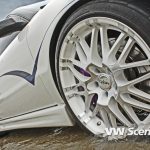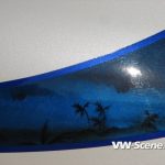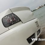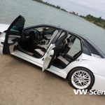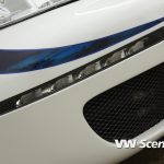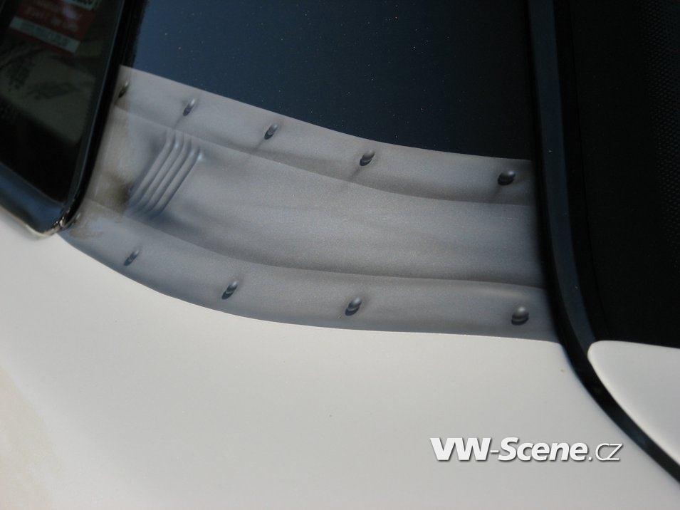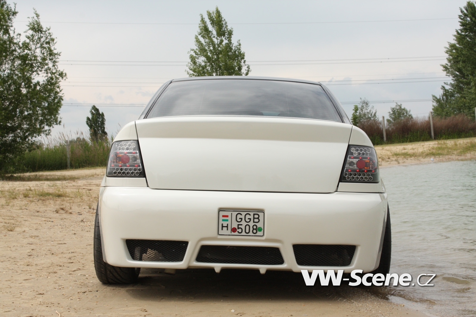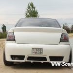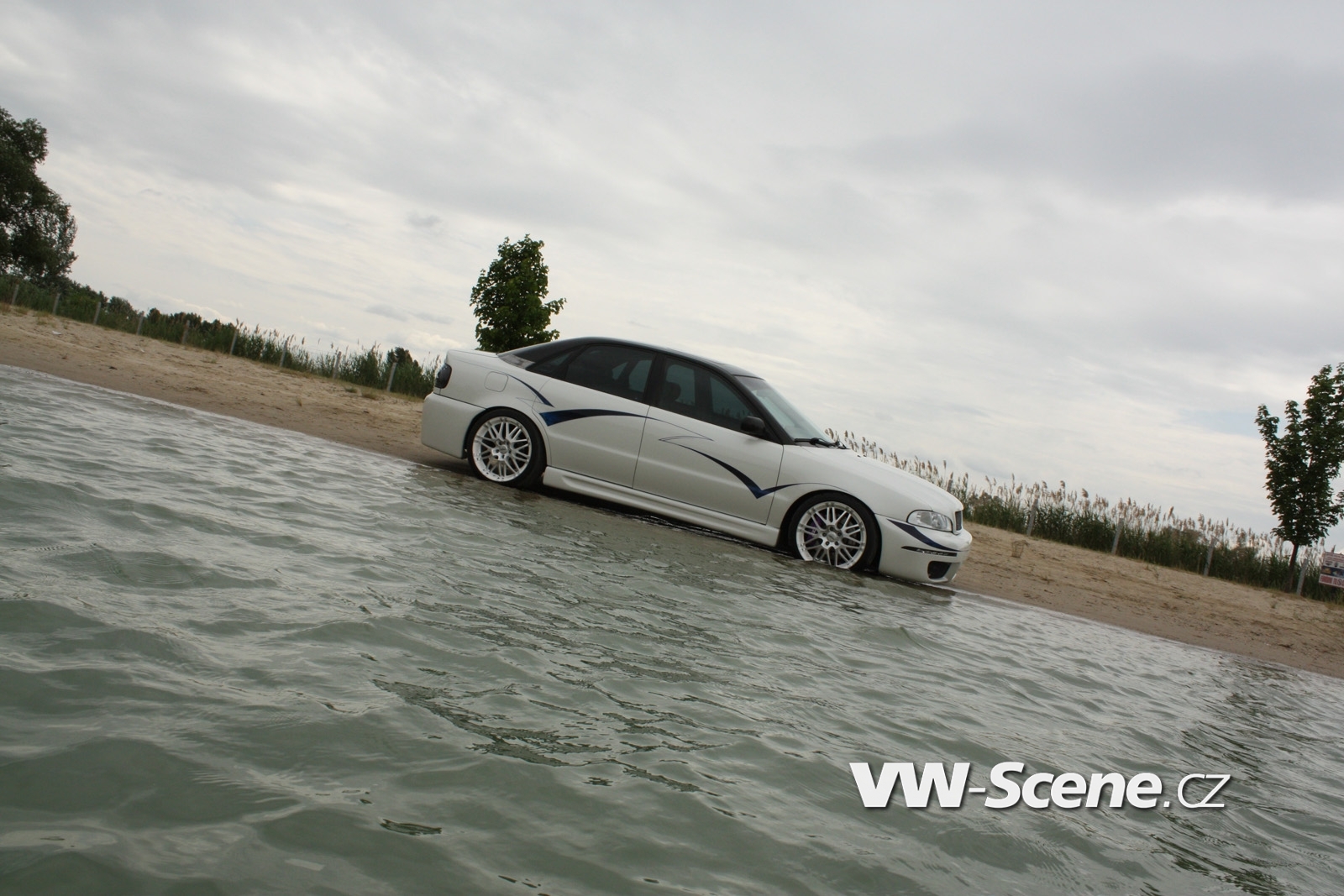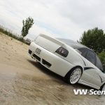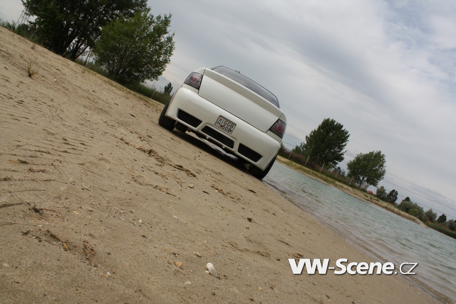 Pokud se podíváte z dálky, tak je vůz bílý z modrými doplňky, ale jak přijdete blíž, tak zjistíte, že tyto doplňky nejsou leda jaké, jelikož jsou v nich malé obrázky ve stylu pláže, které museli dát hodně velkou práci. Celý vůz zdobí 18ti palcová kola od Oxigin 14, na kterých jsou obuty pneumatiky značky Yokohama o rozměrech 225/40 R18, což sice není moc, ale nic se nemá přehánět. Pod těmito koly nalezneme brzdy D2 8PoT s kotoučem o velikosti 330mm. V předním nárazníku úplně přibylo denní svícení, které je z Audi S6. Oba nárazníky byli upraveny a v zadních světlech nechybí LED. Co se týče kapoty, tak ta dostala sportovnější nádech a víko kufru zůstalo stejné. Když už jsme u toho kufru, tak ten je poněkud zajímavý, jelikož zde nalezneme obrovskou reprobednu, ale také parádní ozdobu, která vypadá dobře, ale moc praktická asi nebude. Pokud se vrátíme k podvozku, tak zde jsou ještě nové tlumiče od společnosti KONI, které se dají nastavovat dle potřeby.