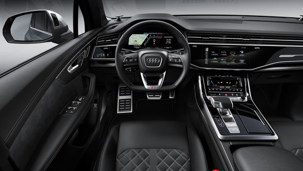 Interiér modelu Audi SQ7 TDI** je čalouněn kombinací tmavé kůže a Alcantary. Ozdobná obložení jsou vyrobena z matného kartáčovaného hliníku nebo na přání z uhlíkových kompozitů, a umocňují tak sportovní vzhled. Na přání osvětluje hlavní stylistické linie a plochy v interiéru třiceti nastavitelnými barvami světla paket dekoračního osvětlení a osvětlení kontur. Kromě sportovních sedadel jsou součástí sériové výbavy také osvětlené prahové lišty s hliníkovými doplňky a vpředu s nápisem S. Pedály, opěrka pro levou nohu a ochranná lišta prahu zavazadlového prostoru jsou vyrobeny z ušlechtilé oceli.