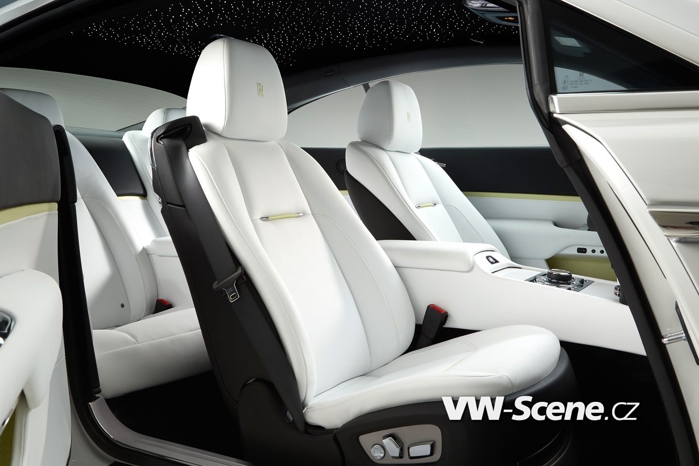 Ovšem nejdůležitější roli hraje samozřejmě interiér vozu. Tomu, dominuje bílá barva v kombinaci s černou. Bílou barvu nalezneme na sedačkách, volantu, dveřích a dalších místech. Černý lak je dominantou části palubní desky, obložení dveří, zadní straně sedadel i hvězdném stropu, kterým je Wraith tak proslulý.