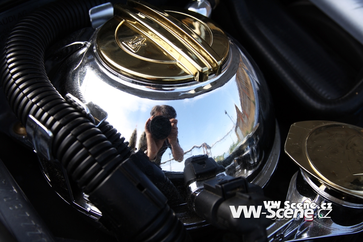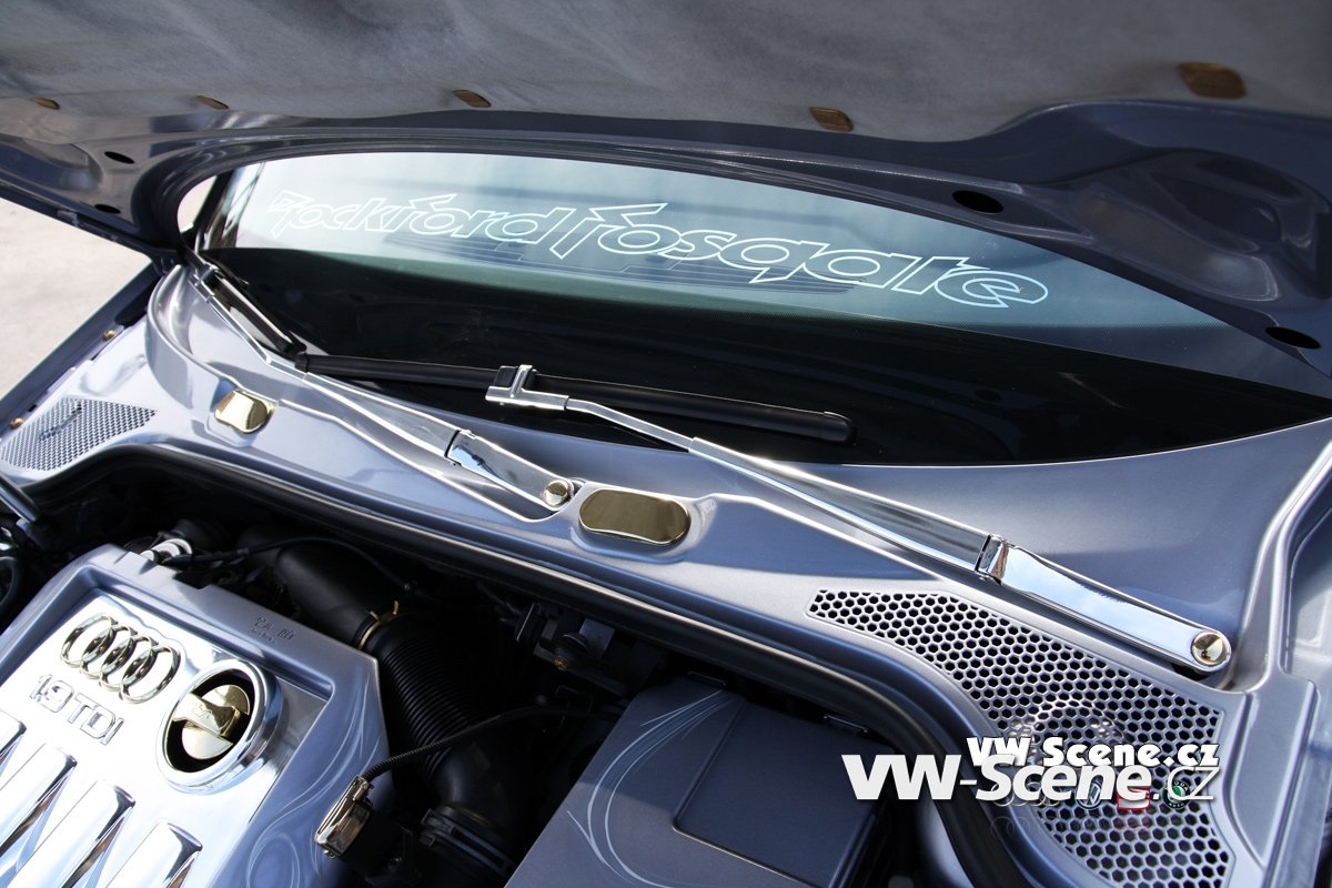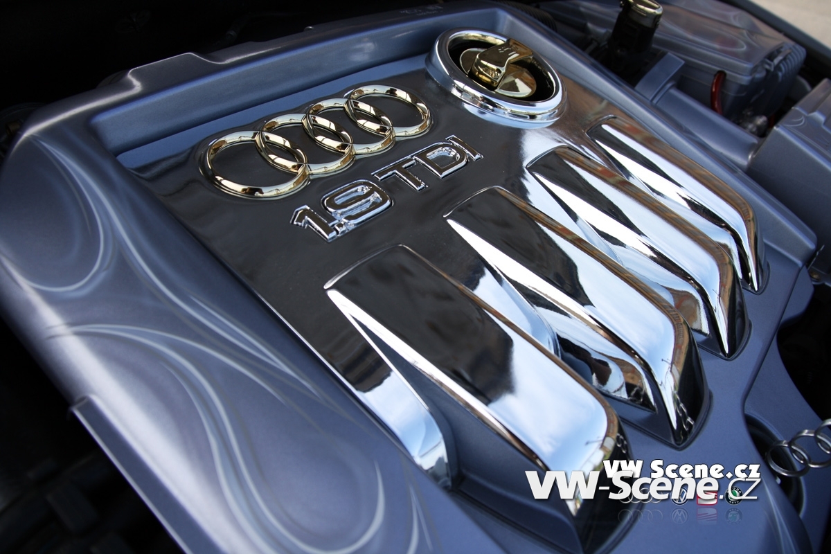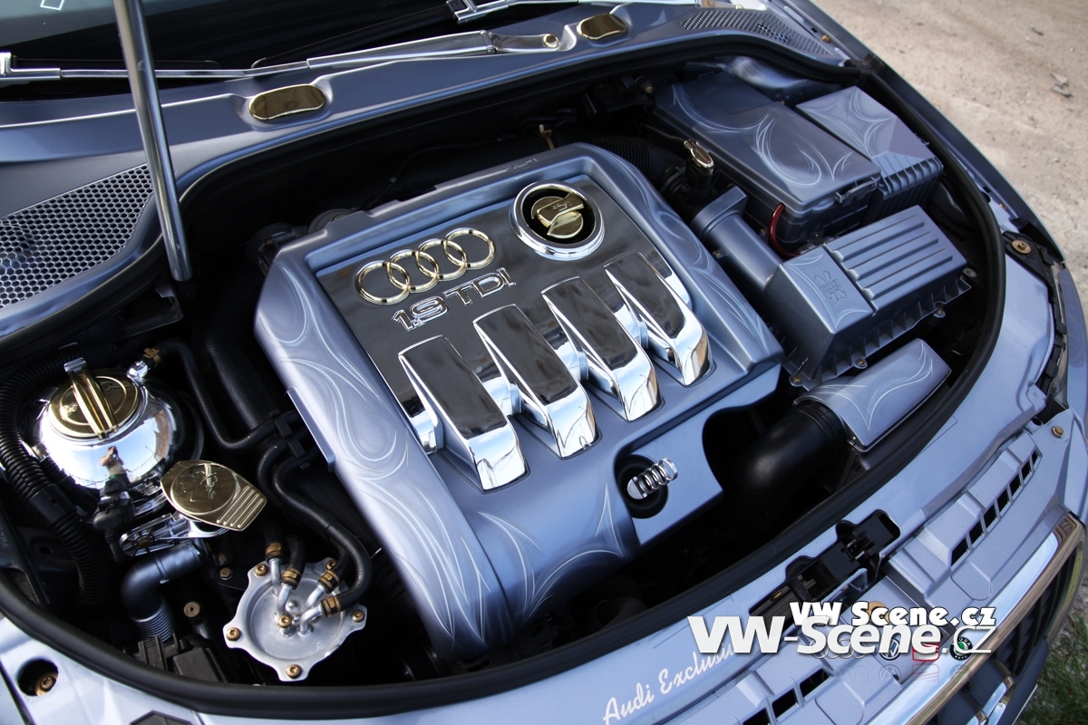 Pod kapotou se ukrývá oblíbený dieselový agregát se sériovým výkonem 105 koní. Na zvýšení jeho výkonu se největší měrou podílelo přeprogramování řídící jednotky firmou Bitpower, která dokázala vyladit motor na 150 koní. Pomáhá i sportovní vzduchový filtr. Po technické stránce je to vše a opět přichází ke slovu estetika. Nepřehlédnutelné je bohaté lakování plastů, doplněné o airbrush i všudypřítomné chromování a zlacení. Unikátní je hliníková měrka oleje ve znaku Audi. Vše uzavírá spodní kryt kapoty potažený šedým mikroplyšem.
