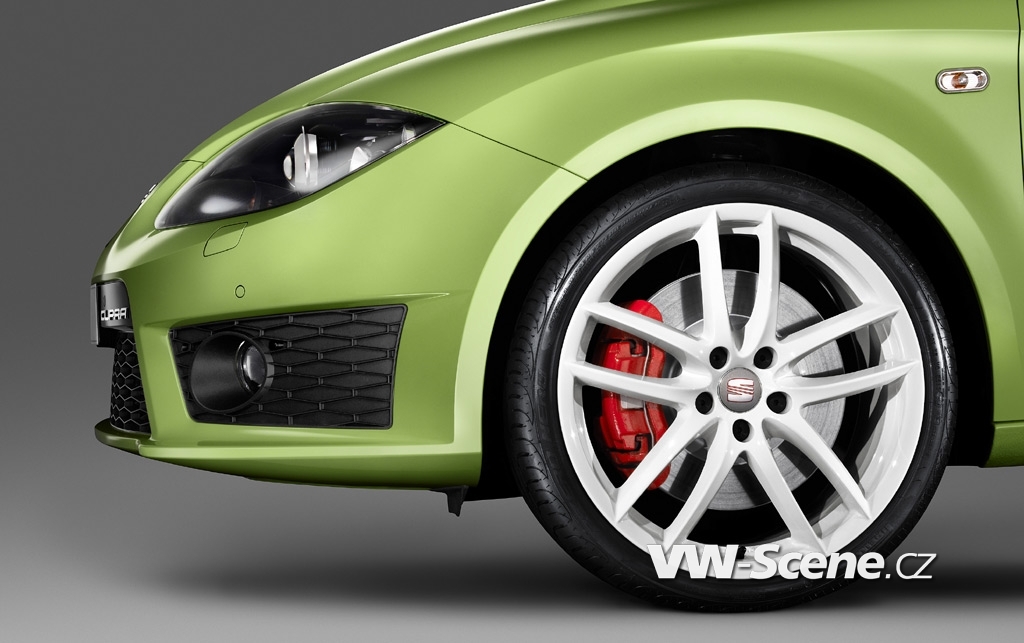Dalším výrazným prvkem, který podtrhuje Cupra R jsou přitažlivá 19ti palcová kola. Můžeme na nich vidět pět zdvojených slitinových paprsků. Kola jsou obuta do pneumatik s ultra nízkým profilem 235/35. Rozměr kol umožnil použití velkoryse dimenzované brzdové soustavy. Vpředu jsou 17ti palcové brzdové kotouče 345 x 30 mm a vzadu 16ti palcové brzdové kotouče 286 x 12 mm, abychom dosáhli větší brzdné kapacity.
