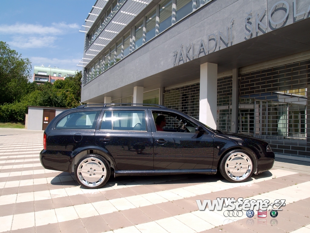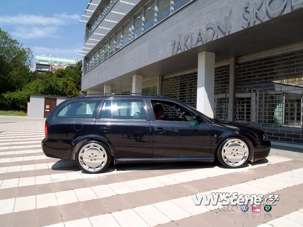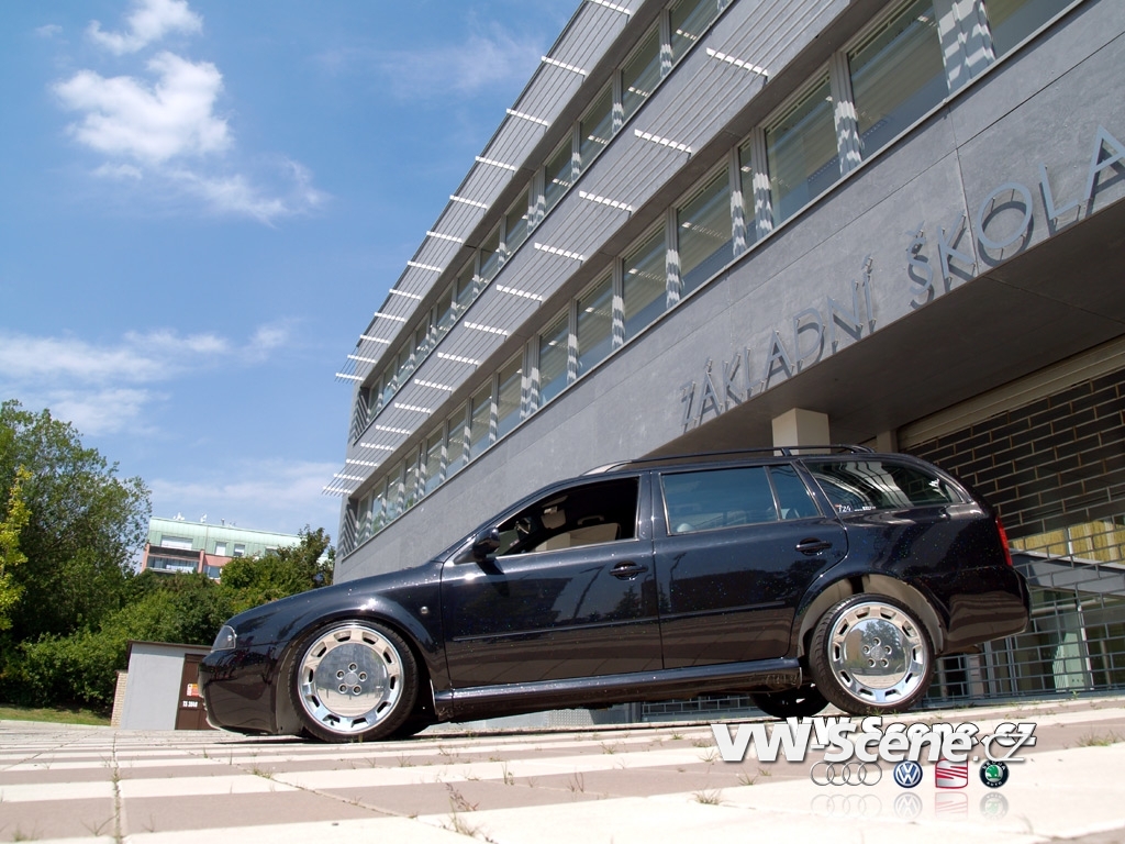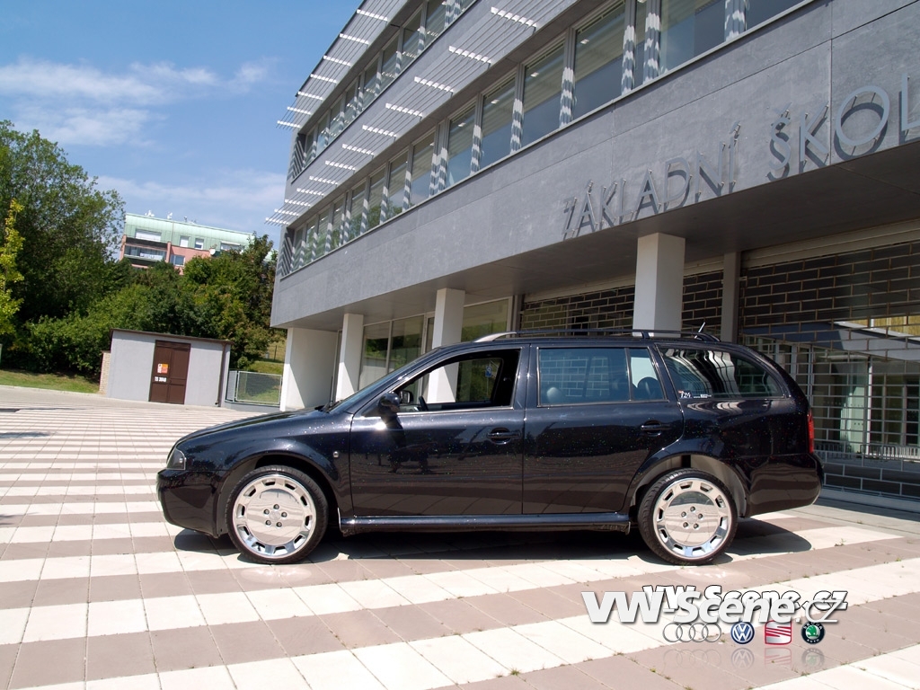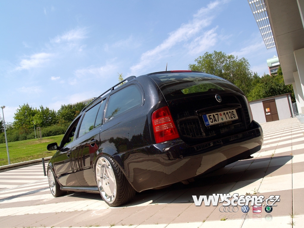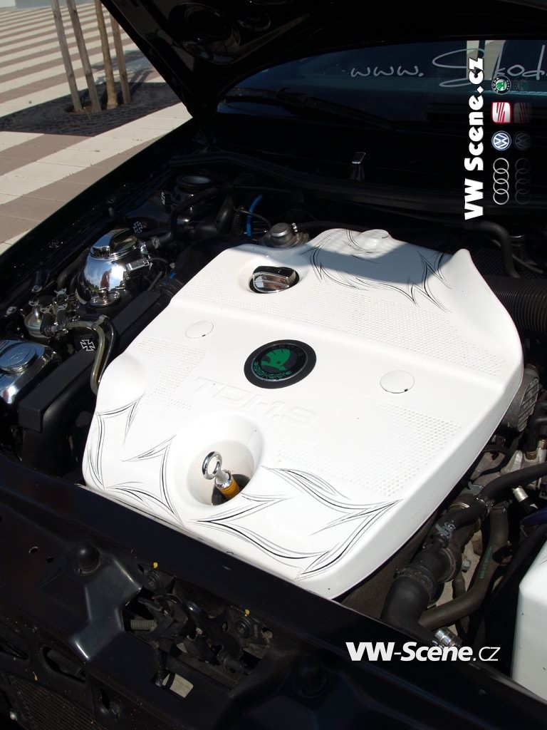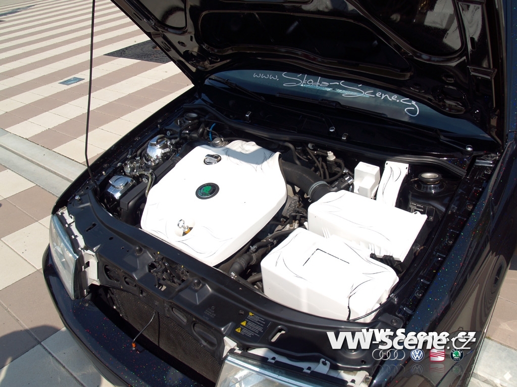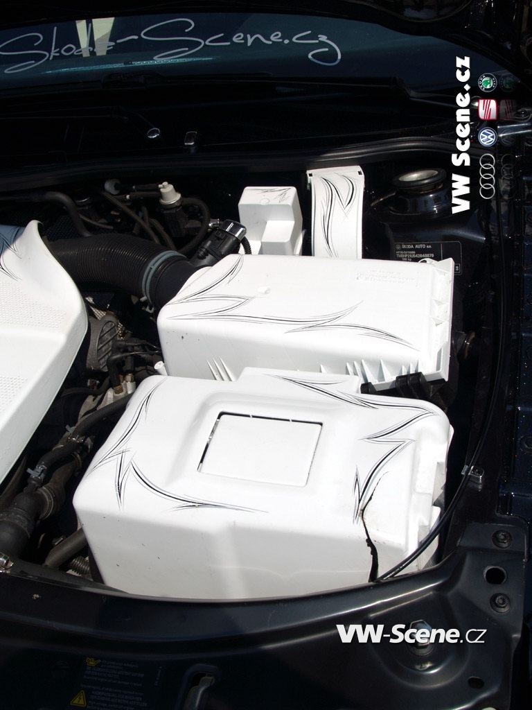 erné přední a boční blinkry a bok již nechrání otěrové lišty. Nesmím zapomenout na chromovaný uzávěr nádrže, doplněný o ornament v pinstripingu na jeho víčku. Zadní nárazník opět prošel zahlazením a lišta nad zadní RZ přišla o zámek. Zmizel i zadní stěrač. Vše je zabaleno do odstínu Black Magic Perl s větším perleťovým efektem. Naopak kontrastní bílou úpravce pokryl plastové podběhy a části brzdové soustavy. Nepřehlédnutelná, ručně leštěná, kola jsou originálem z Audi A8. Jejich 18“ je doplněno o nízkoprofilové pneumatiky o rozměru 215/40 R18. Díky vzduchovému podvozku Viair v kombinaci s tlumiči Koni se štelovatelnou tuhostí si Octavia dokáže pěkně lehnout na zem. A v případě jízdy po nerovném terénu si zvětší svou světlou výšku klidně až o 20 cm. Celkově tedy decentně provedený tuning s luxusními koly a zajímavou technikou podvozku.