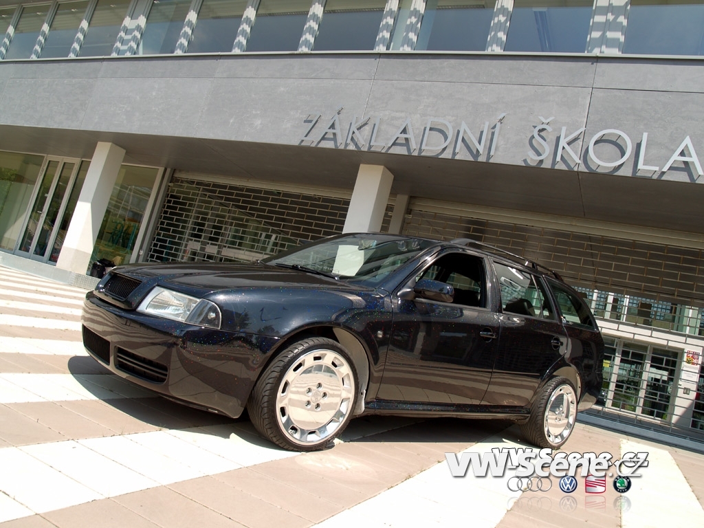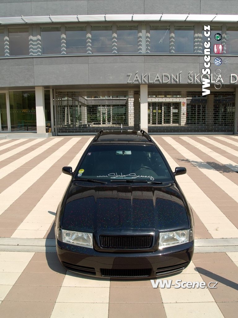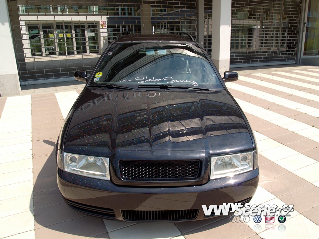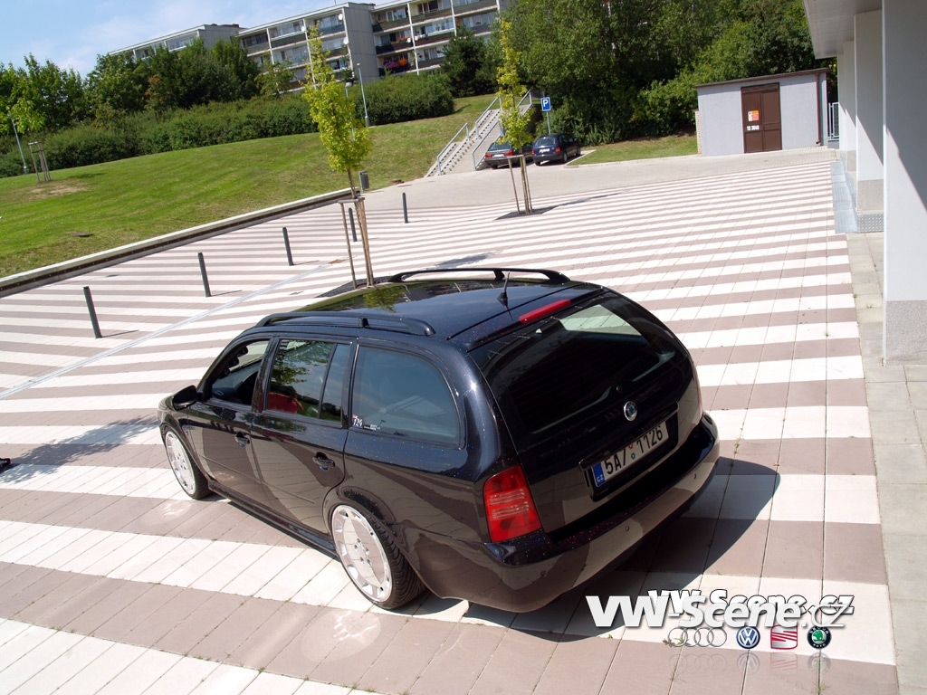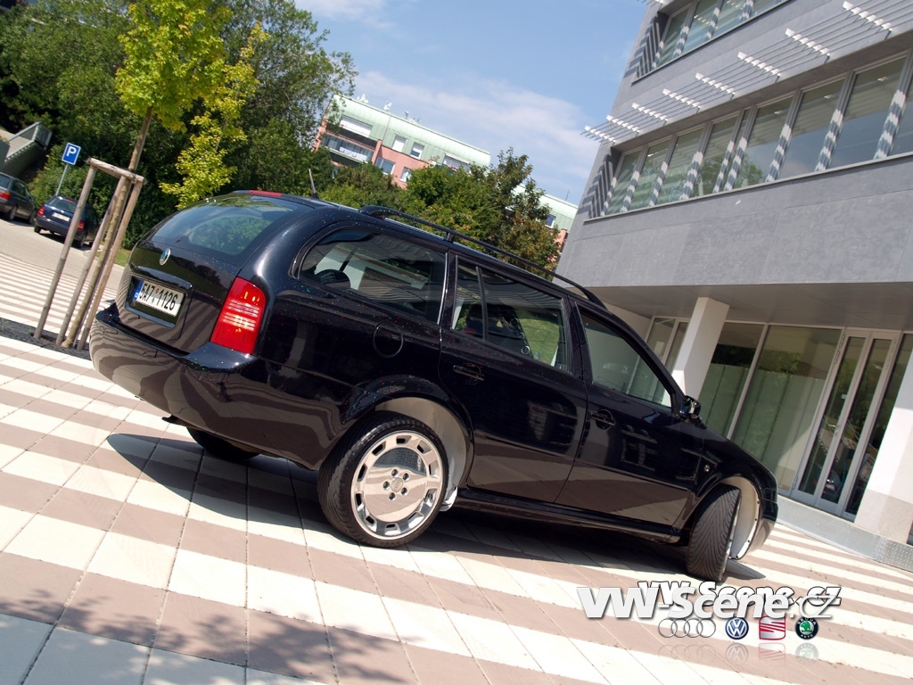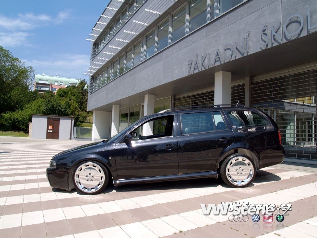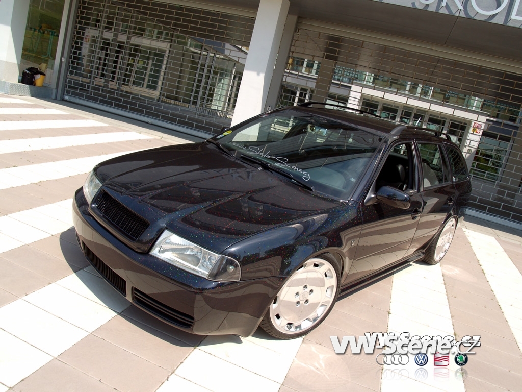 erné přední a boční blinkry a bok již nechrání otěrové lišty. Nesmím zapomenout na chromovaný uzávěr nádrže, doplněný o ornament v pinstripingu na jeho víčku. Zadní nárazník opět prošel zahlazením a lišta nad zadní RZ přišla o zámek. Zmizel i zadní stěrač. Vše je zabaleno do odstínu Black Magic Perl s větším perleťovým efektem. Naopak kontrastní bílou úpravce pokryl plastové podběhy a části brzdové soustavy. Nepřehlédnutelná, ručně leštěná, kola jsou originálem z Audi A8. Jejich 18“ je doplněno o nízkoprofilové pneumatiky o rozměru 215/40 R18. Díky vzduchovému podvozku Viair v kombinaci s tlumiči Koni se štelovatelnou tuhostí si Octavia dokáže pěkně lehnout na zem. A v případě jízdy po nerovném terénu si zvětší svou světlou výšku klidně až o 20 cm. Celkově tedy decentně provedený tuning s luxusními koly a zajímavou technikou podvozku.