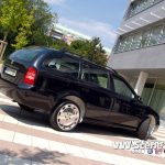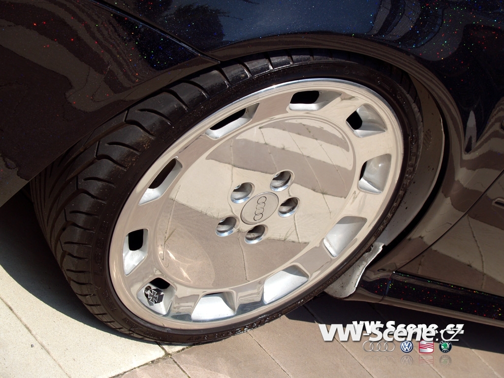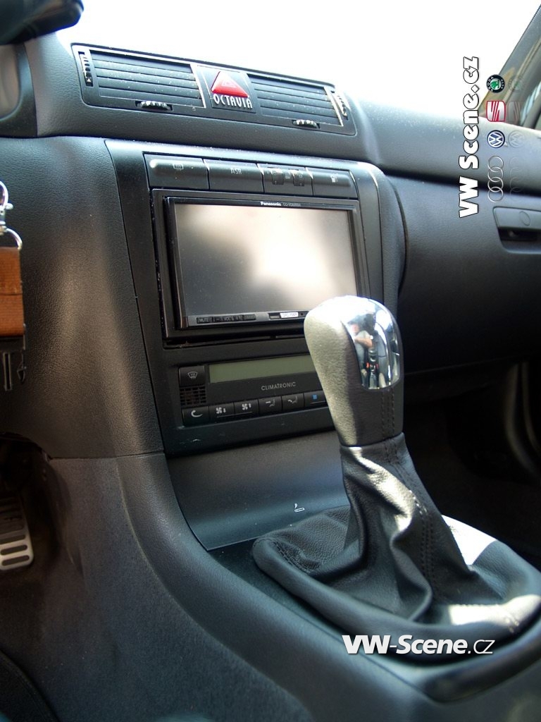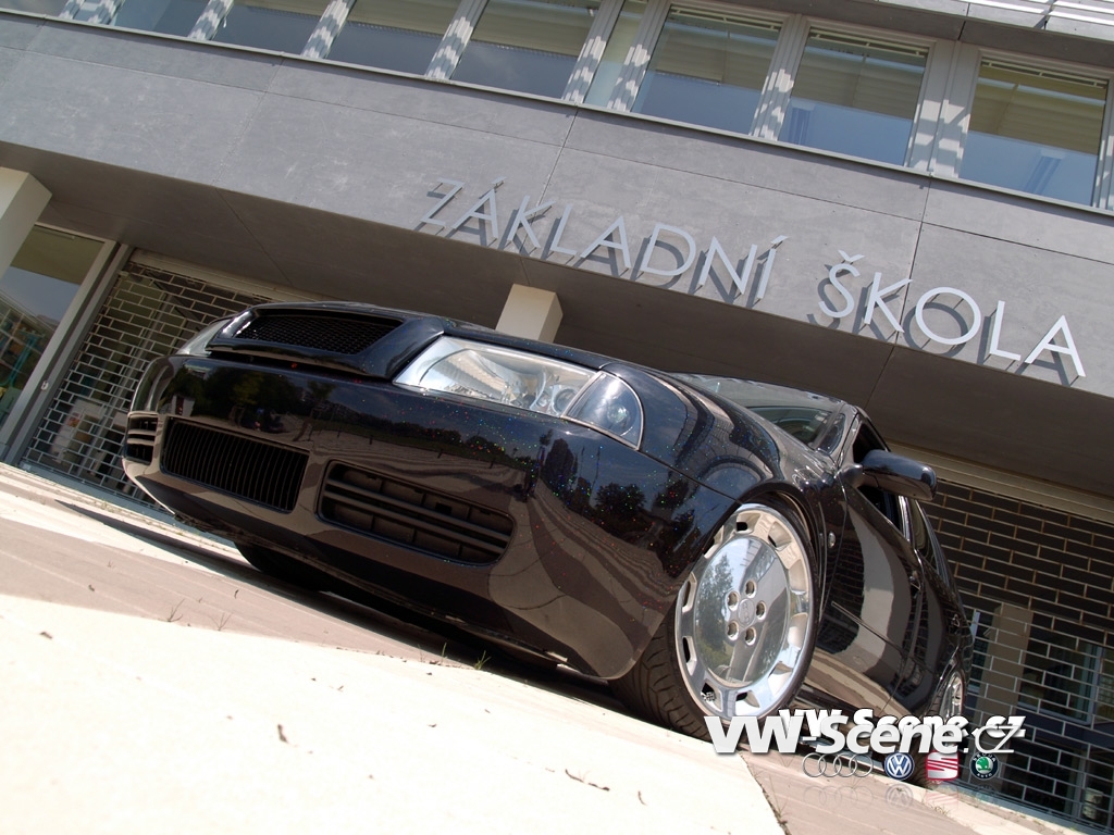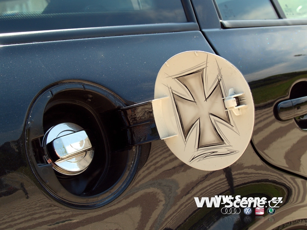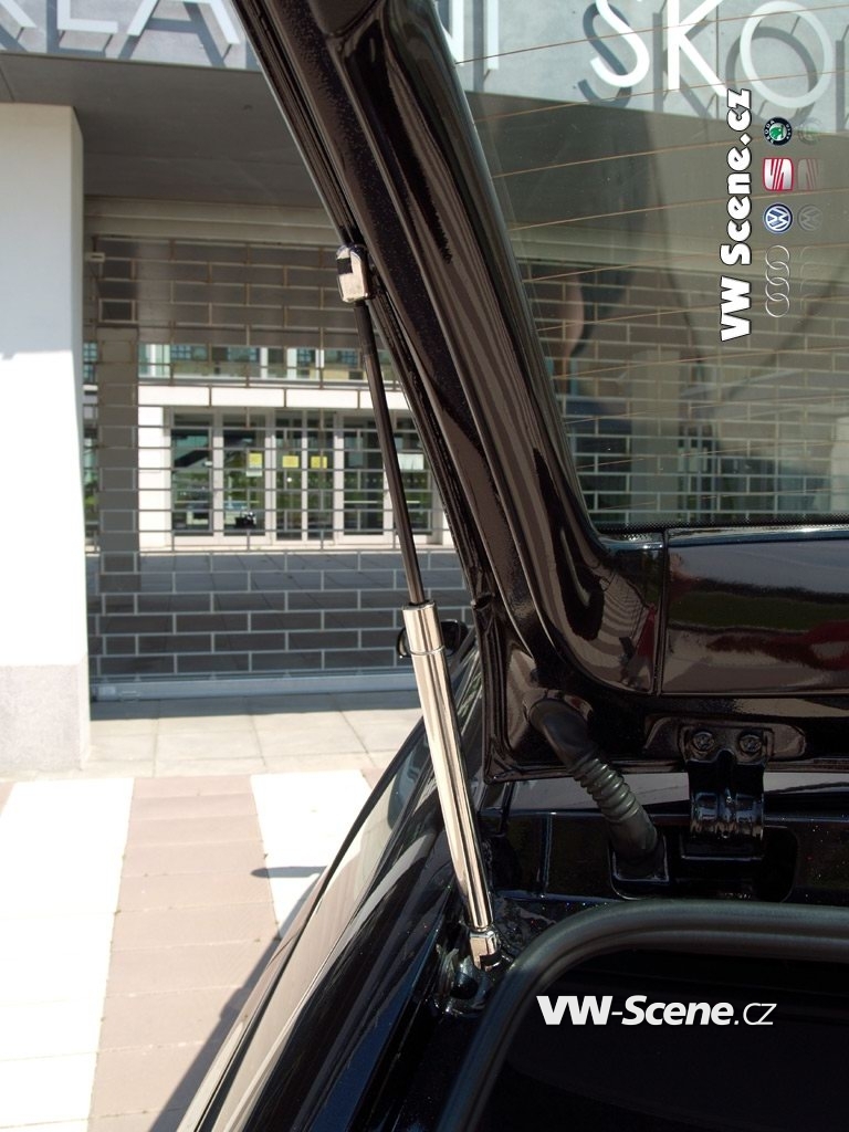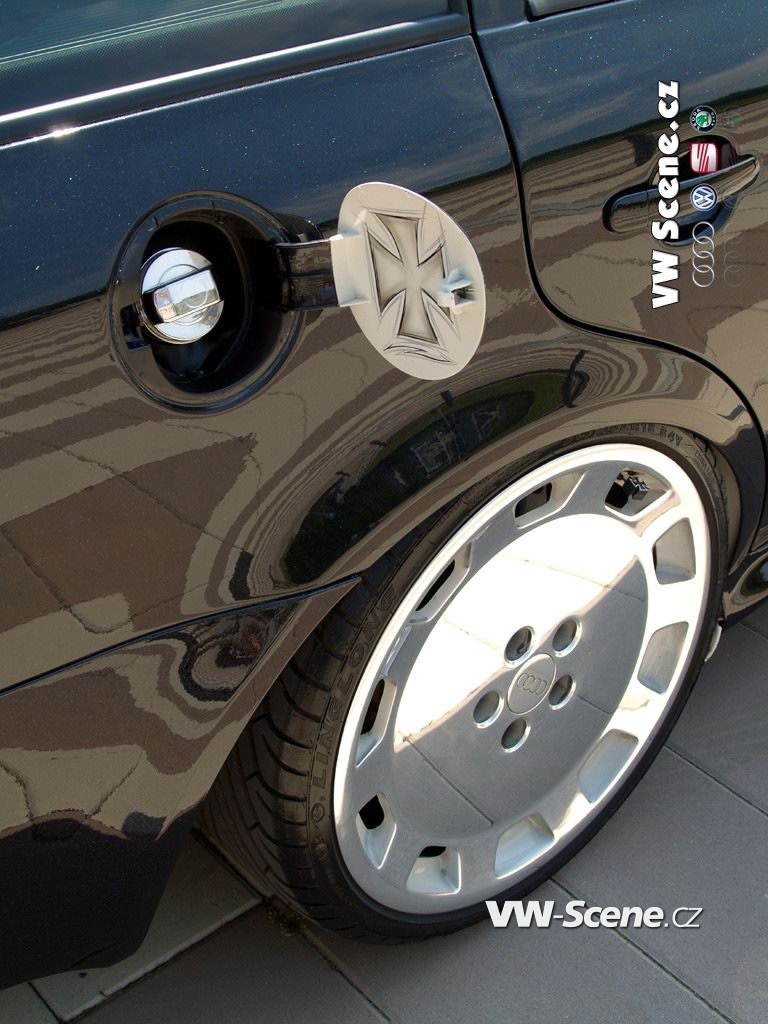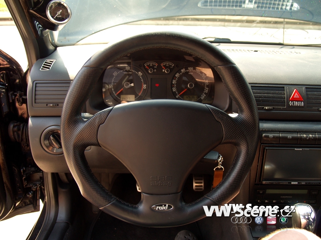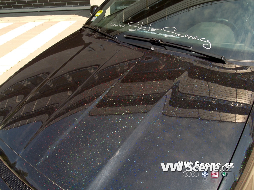 erné přední a boční blinkry a bok již nechrání otěrové lišty. Nesmím zapomenout na chromovaný uzávěr nádrže, doplněný o ornament v pinstripingu na jeho víčku. Zadní nárazník opět prošel zahlazením a lišta nad zadní RZ přišla o zámek. Zmizel i zadní stěrač. Vše je zabaleno do odstínu Black Magic Perl s větším perleťovým efektem. Naopak kontrastní bílou úpravce pokryl plastové podběhy a části brzdové soustavy. Nepřehlédnutelná, ručně leštěná, kola jsou originálem z Audi A8. Jejich 18“ je doplněno o nízkoprofilové pneumatiky o rozměru 215/40 R18. Díky vzduchovému podvozku Viair v kombinaci s tlumiči Koni se štelovatelnou tuhostí si Octavia dokáže pěkně lehnout na zem. A v případě jízdy po nerovném terénu si zvětší svou světlou výšku klidně až o 20 cm. Celkově tedy decentně provedený tuning s luxusními koly a zajímavou technikou podvozku.