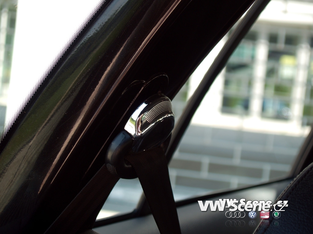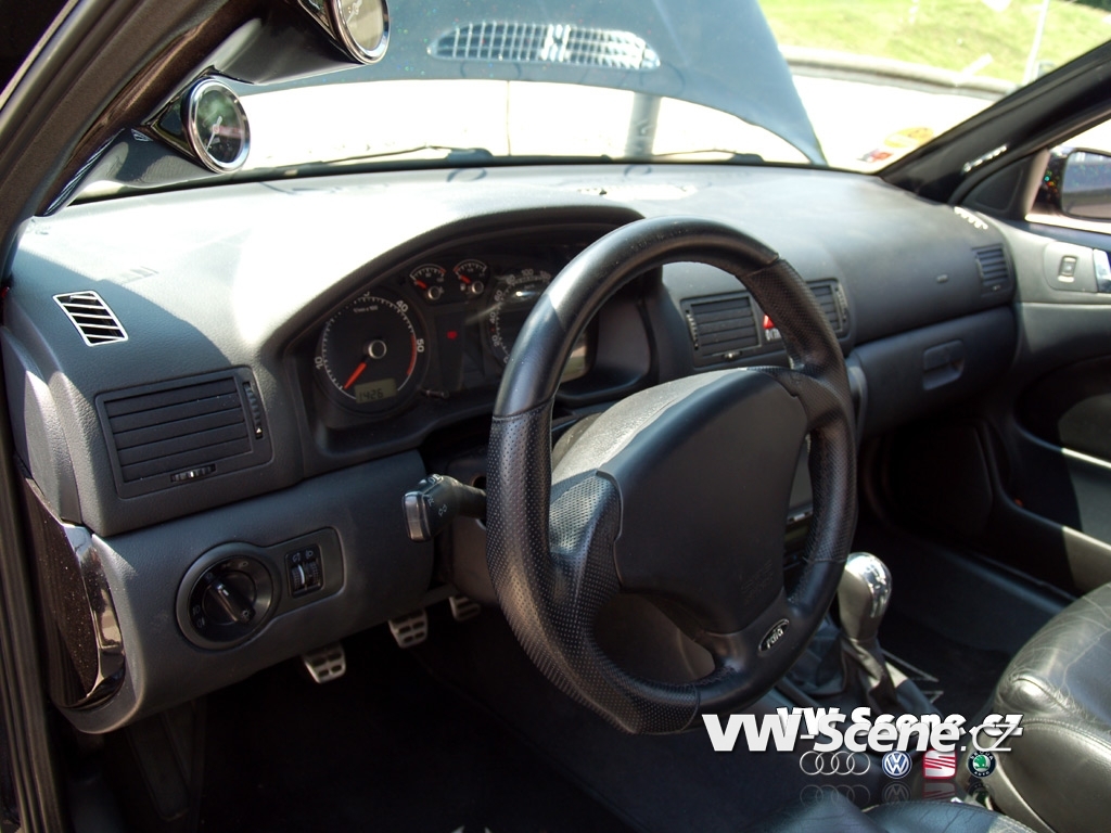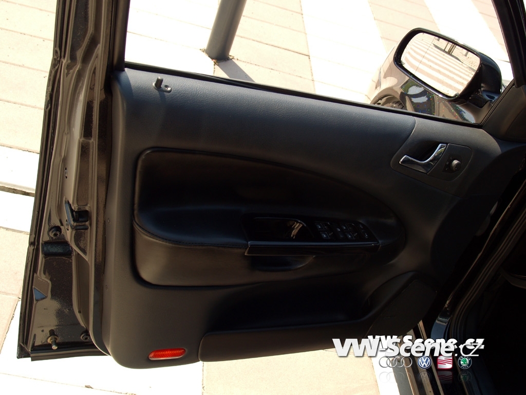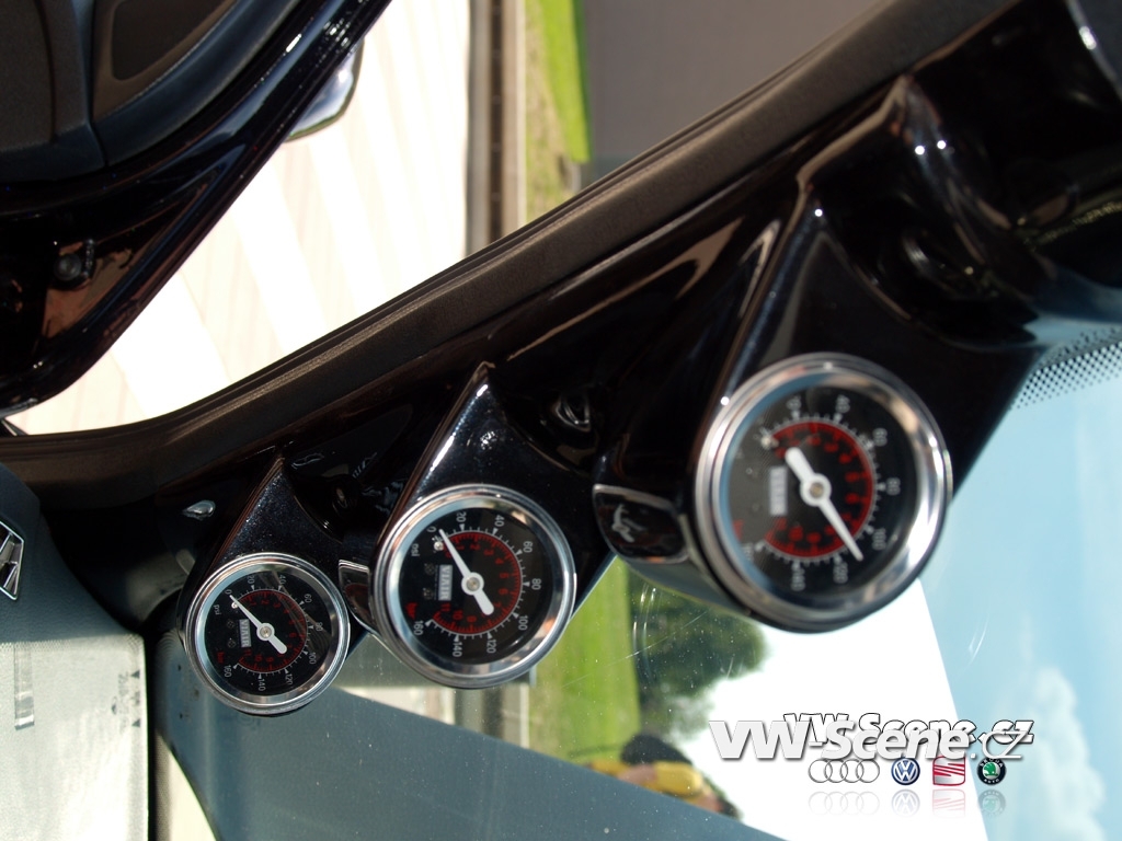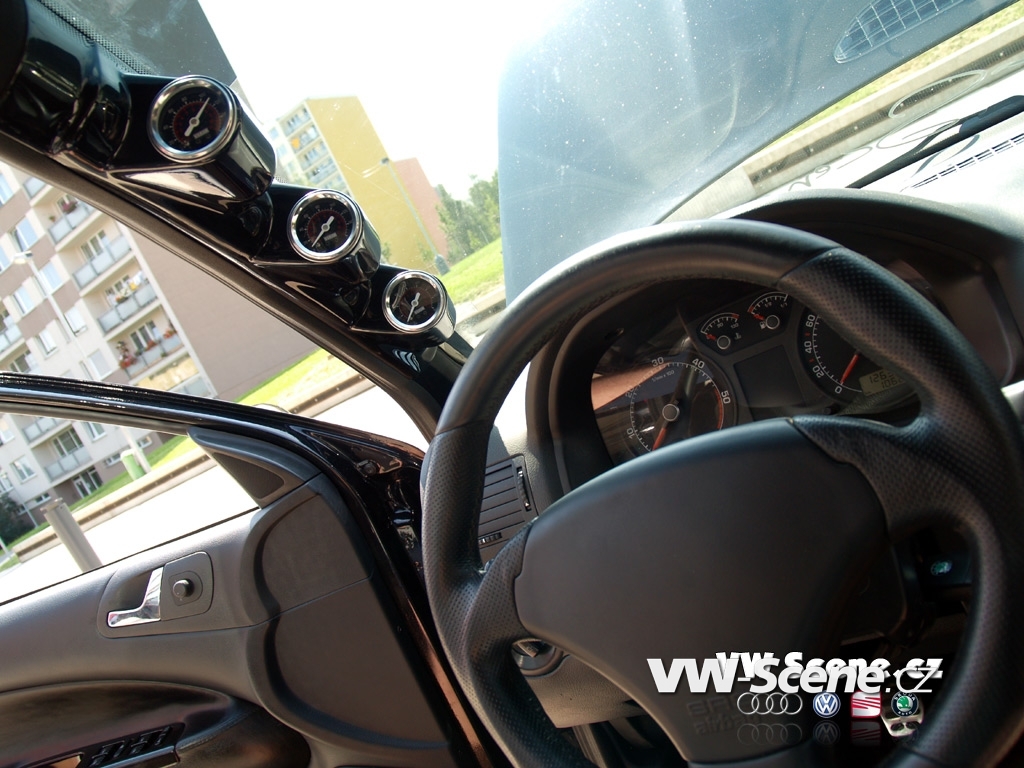 Interiér je minulé přestavbě dosti vzdálený a to nejen svou barvou, ale i materiálem. Bílá koženka šla ven a na její místo nastoupil kompletní černý kožený interiér z Golfu čtvrté generace s výraznějším bočním vedením sedadel. Černočernou kombinaci rozbíjejí chromované a zlacené detaily. Pochvalu získává úpravce za sportovnější tříramenný volant HP Raid, který v sobě skrývá airbag a tak je bezpečnost posádky zaručena. Na levém A-sloupku přibyla trojice přídavných budíků, které signalizují stav v systému vzduchové podvozku. Rozhodně neobvyklá je i výměna ručiček budíků v kapličce přístrojů za model Golf GTI. Audiosestavu sdružuje čelní jednotka Panasonic CQ-VD5005N, doplněná o 10,4 palcový stropní monitor. O audiosignál se starají sériové reproduktory, doplněné o zástavbu 25 cm subwooferu Dragter. Sílu mu dodává dvoukanálový zesilovač Carpower HPB 602. Pro slušný poslech, podpořený vydatnějšími basovými tóny, to rozhodně stačí.