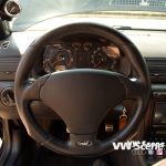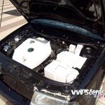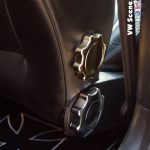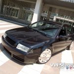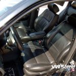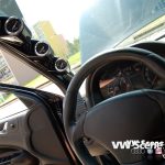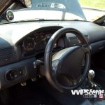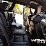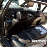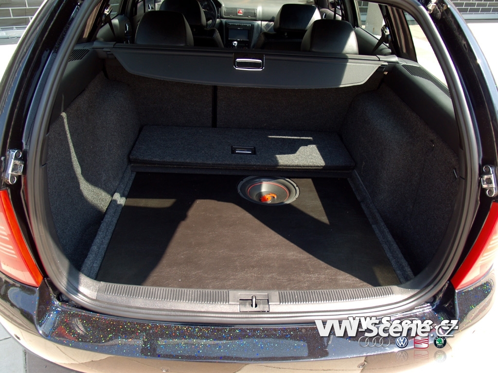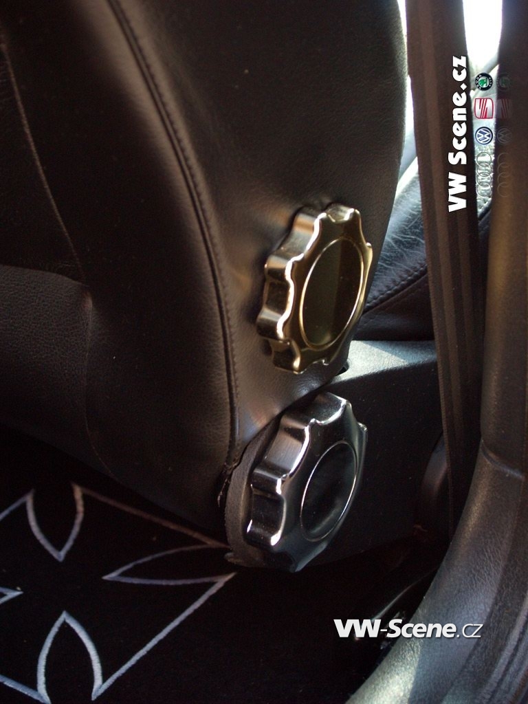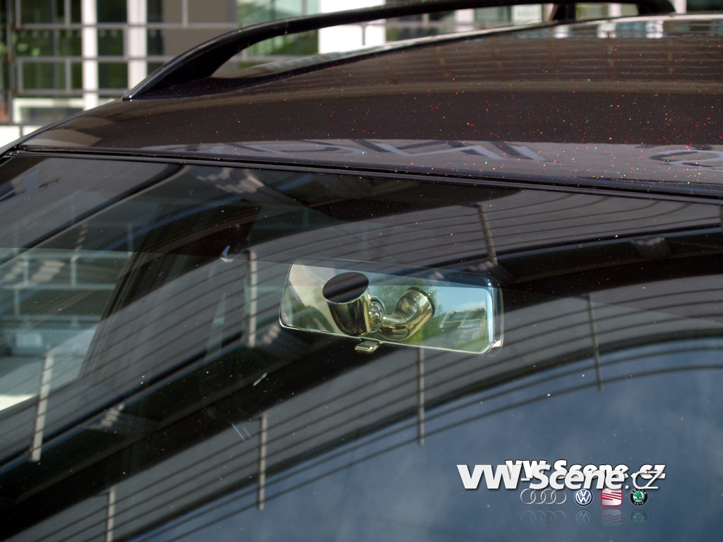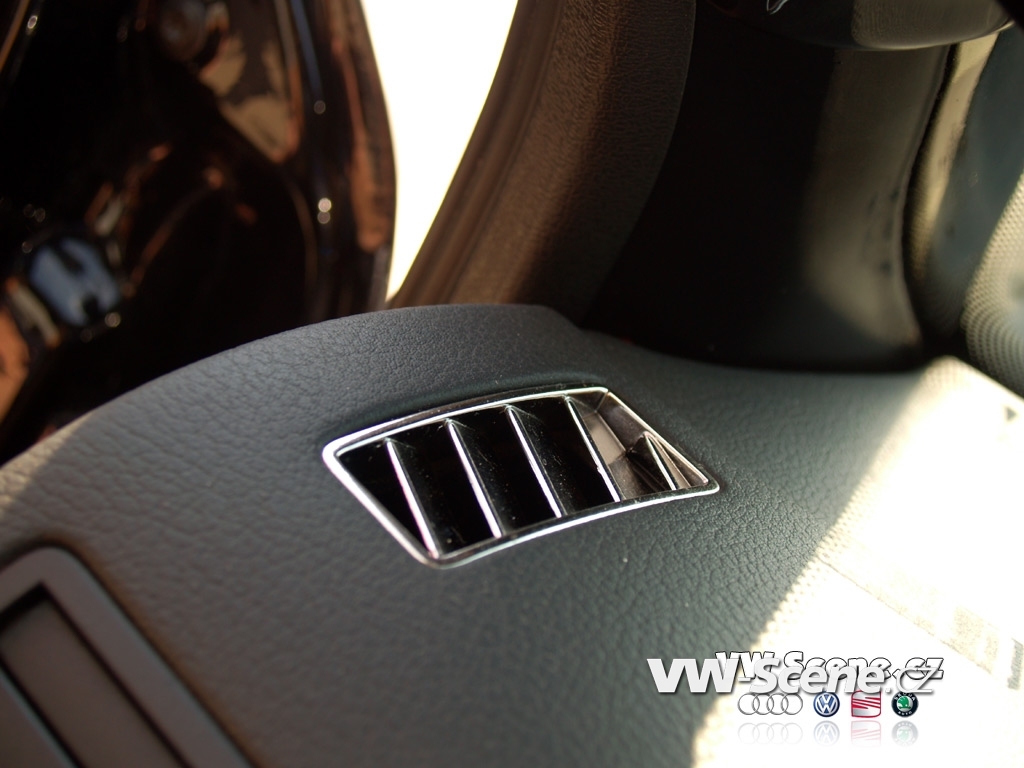 Interiér je minulé přestavbě dosti vzdálený a to nejen svou barvou, ale i materiálem. Bílá koženka šla ven a na její místo nastoupil kompletní černý kožený interiér z Golfu čtvrté generace s výraznějším bočním vedením sedadel. Černočernou kombinaci rozbíjejí chromované a zlacené detaily. Pochvalu získává úpravce za sportovnější tříramenný volant HP Raid, který v sobě skrývá airbag a tak je bezpečnost posádky zaručena. Na levém A-sloupku přibyla trojice přídavných budíků, které signalizují stav v systému vzduchové podvozku. Rozhodně neobvyklá je i výměna ručiček budíků v kapličce přístrojů za model Golf GTI. Audiosestavu sdružuje čelní jednotka Panasonic CQ-VD5005N, doplněná o 10,4 palcový stropní monitor. O audiosignál se starají sériové reproduktory, doplněné o zástavbu 25 cm subwooferu Dragter. Sílu mu dodává dvoukanálový zesilovač Carpower HPB 602. Pro slušný poslech, podpořený vydatnějšími basovými tóny, to rozhodně stačí.