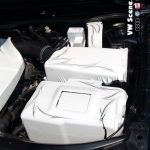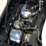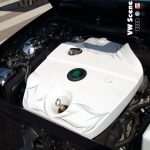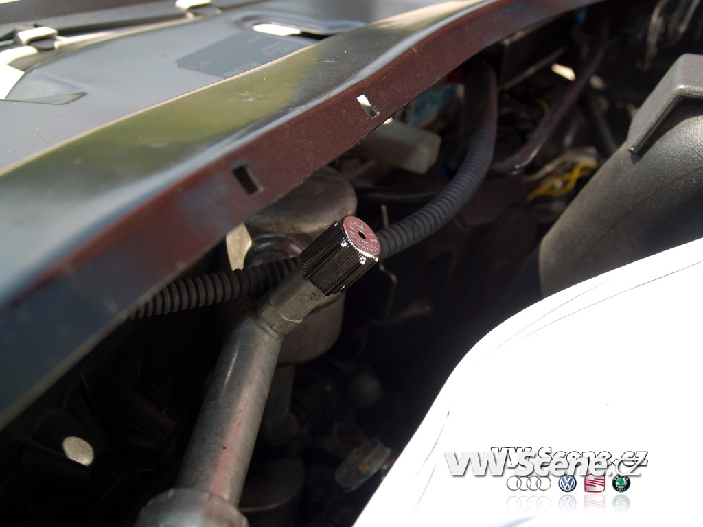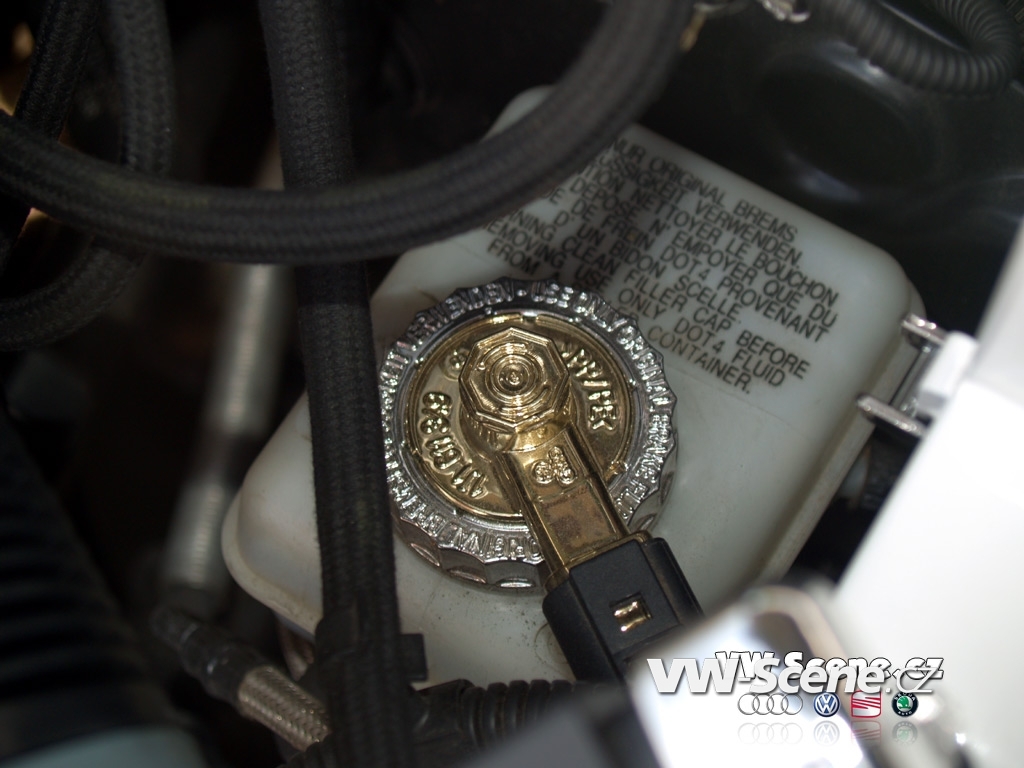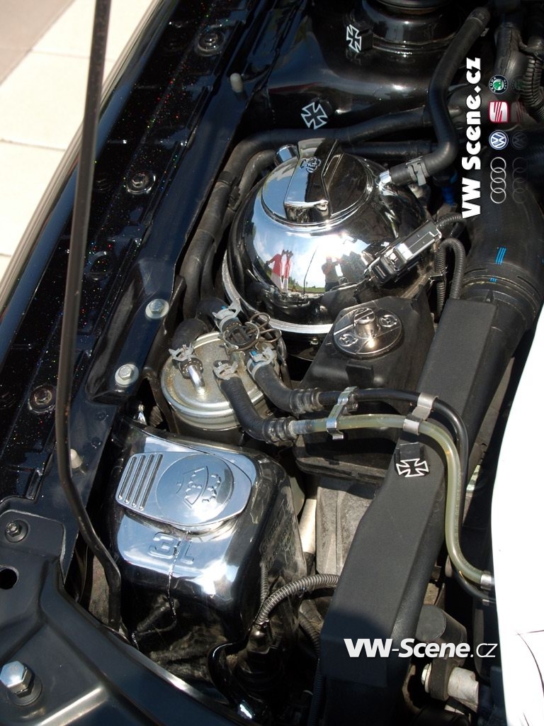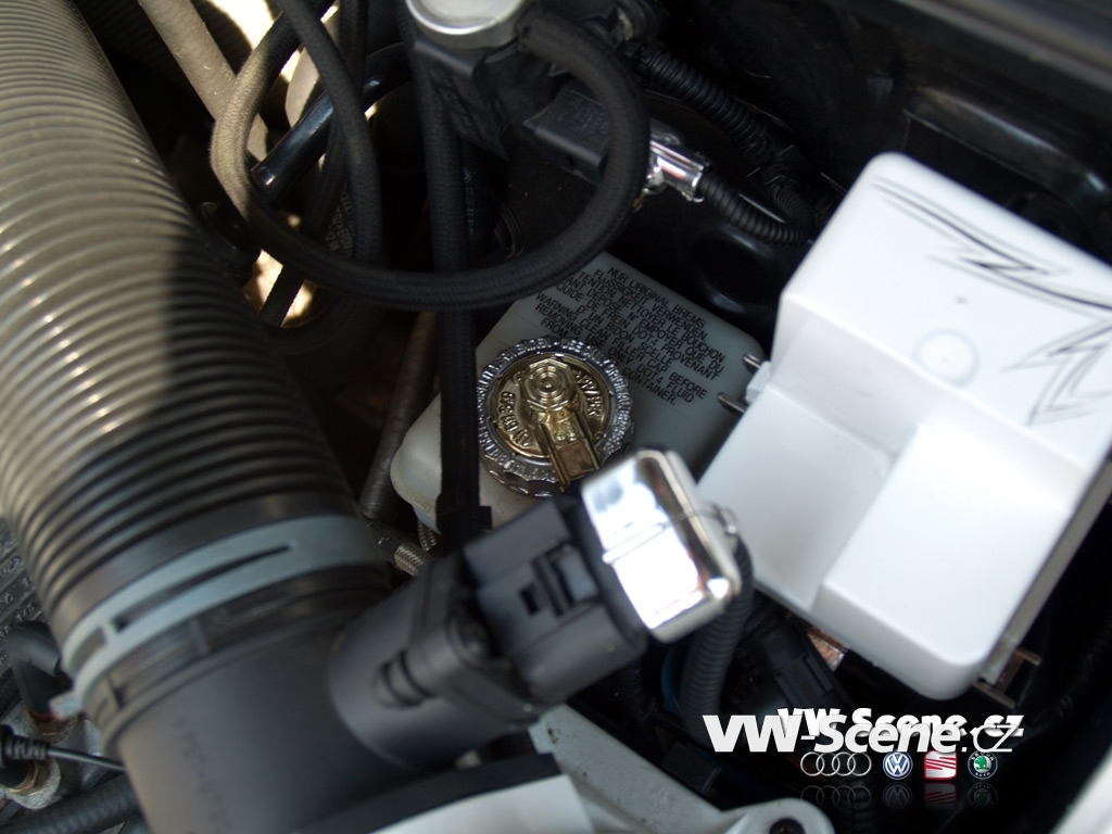 Ještě jsem se nezmínil o motorovém prostoru. V něm tluče dieselové srdce se sériovým výkonem 110 koní, které nabylo trochu koníků díky klasickému chiptuningu. Ostatní změny jsou už jen estetického charakteru. Klasikou je lakovaný plastový kryt motoru, baterie a vzduchového filtru, tentokráte opět v bílé. A i zde, tak jako v interiéru, se objevilo několik prvků pokrytých chromem. Pomyslnou tečku tomu všemu dodávají maltézské kříže a pinstriping.