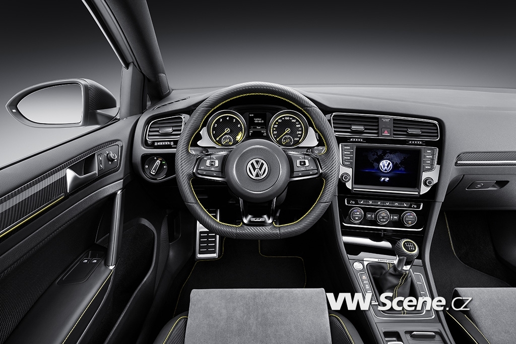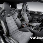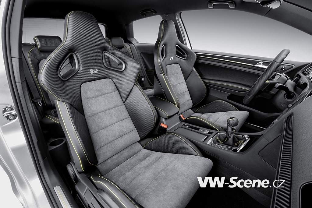 Skořepinová sedadla čalouněná Alcantarou a karbonovou kůží. Golf R 400 byl dalekosáhle individualizován také v interiéru. Pro řidiče a spolujezdce vpředu jsou připravena závodní skořepinová sedadla s integrovanými opěrkami hlavy a otvory pro bezpečnostní pásy. Příčně štepované prostřední části sedacích ploch jsou potaženy Alcantarou (barevný odstín „Antracit“); plochy v úrovni hlavy a vnitřní stěny bočních polštářů jsou čalouněny exkluzivní „karbonovou kůží“. To samé platí pro vnější plochy skořepinových sedadel. Ozdobné stehování na bočních polštářích vytváří kontrast svěžím „citronově žlutým“ barevným odstínem. Na opěradlech předních sedadel se nachází do kůže vyšité logo „R“. Rovněž vnější části samostatných sedadel vzadu jsou potaženy „karbonovou kůží“, zatímco vnitřní plochy jsou z Alcantary. Plocha mezi oběma zadními sedadly je potažena černou „kůží Nappa“.