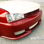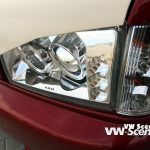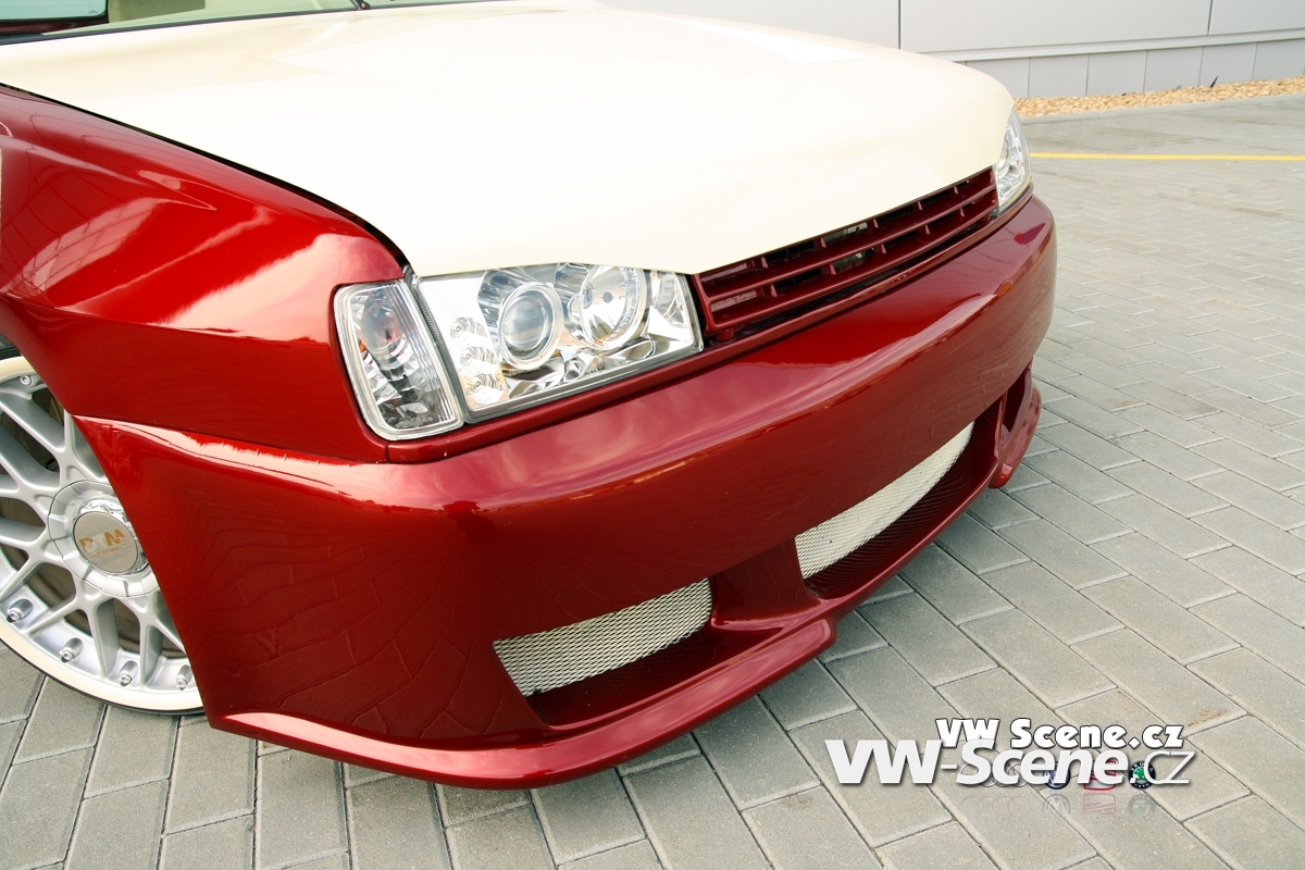 Teď se podíváme na úpravy trochu podrobněji. Oba nárazníky byly výrobcem původně určeny pro úplně jiný model auta, konkrétně Škodu Felicii. Podobným základní rozměry stačily Romanovi k tomu, aby je zcela přepracoval a přizpůsobil tvarům svého Pola. Samotnou kapitolou je změna tvaru všech blatníků. Tato úprava je na celém autě nejpůsobivější. Původní blatníky byly totiž zcela odstraněny a na jejich místo přišel nejdříve tvarovací drát, který označoval hlavní křivky a zakončení zcela nových blatníků. Pak už stačilo vzít do rukou čistý plát plechu a začaly se dít divy. Takto se postupovalo u všech čtyřech kousků. Při takto „na kolenou“ vytvořených panelech karoserie je nejtěžší vytvořit identické, ovšem zrcadlově obrácené díly na druhou stranu auta. Vyměřování a porovnávání je tak skoro nekonečné. Blatníky ovšem tvrdá klempířina rozhodně neskončila. Na řadu přišly nástavce prahů, které jsou rovněž vyrobeny z plechu. V jejich případě se nejen opticky snižovalo, ale také „zvyšovalo“. Roman se totiž rozhodl pro úpravu, která se jen tak mezi tunery nevidí. Inspirací mu přitom byly automobily německého mistrovství DTM. Jedná se o zkrácení výšky dveří. V praxi to vypadalo tak, že dveře zespodu uřízl o nezanedbatelných 10 cm. Musel tedy následně zavařit jejich celou spodní část. O oněch 10 centimetrů jsou tak zvýšeny plechové nástavce prahů. Upozornit také musíme na ukázkovou preciznost napojení jednotlivých dílů. Prodloužení kapoty či zahlazení kufru byly už doslova hračka, stejně tak jako zástavba klik dveří z Audi 80 nebo instalace hliníkového rychlouzávěru nádrže. Mezi zakoupené tuningové díly patří přední chladičová maska JOM bez znaku automobilky, zpětná zrcátka M3 design, žraločí ploutev na střeše, přední světla In.Pro a zadní lampy z verze G40. Volba padla na rudý odstín s vysokým obsahem xiralitu. Celkem bylo položeno 7 vrstev. Dvě podkladu, stejný počet perleti a tři vrstvy bezbarvého laku. Výjimku tvoří kapota, ta je béžová.