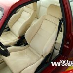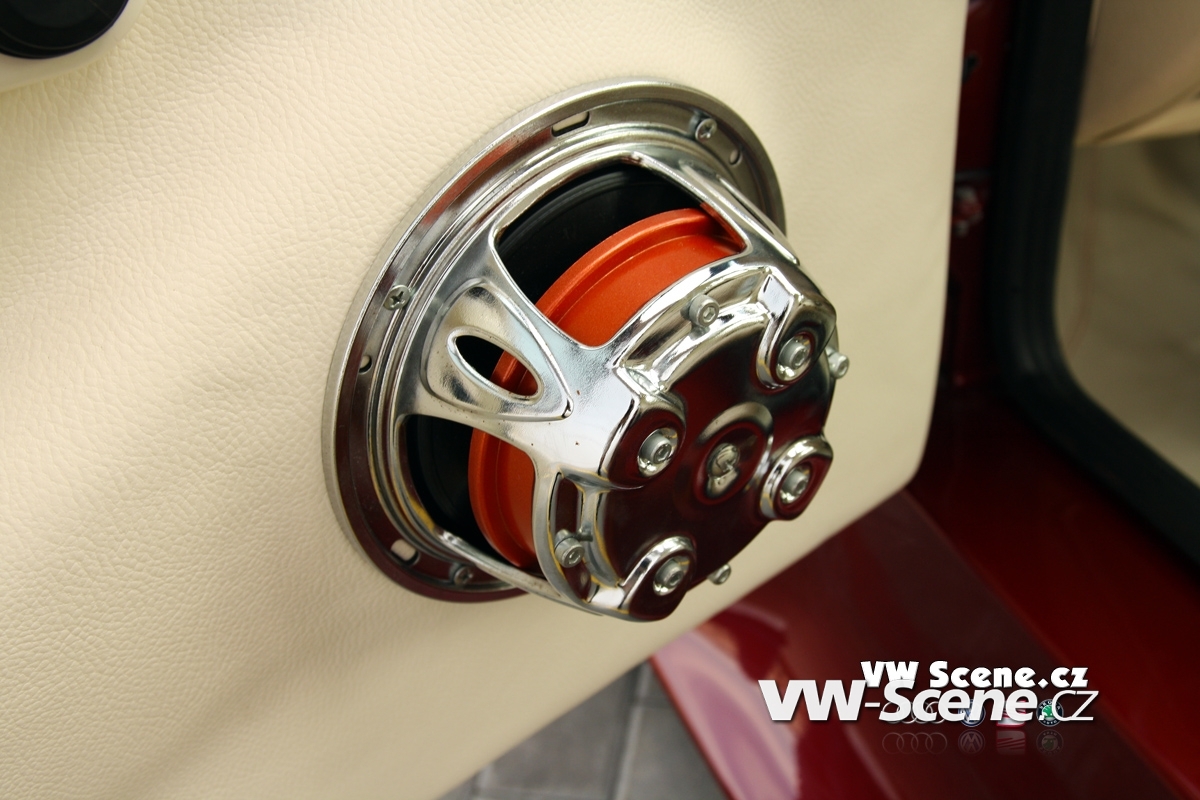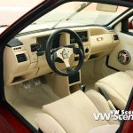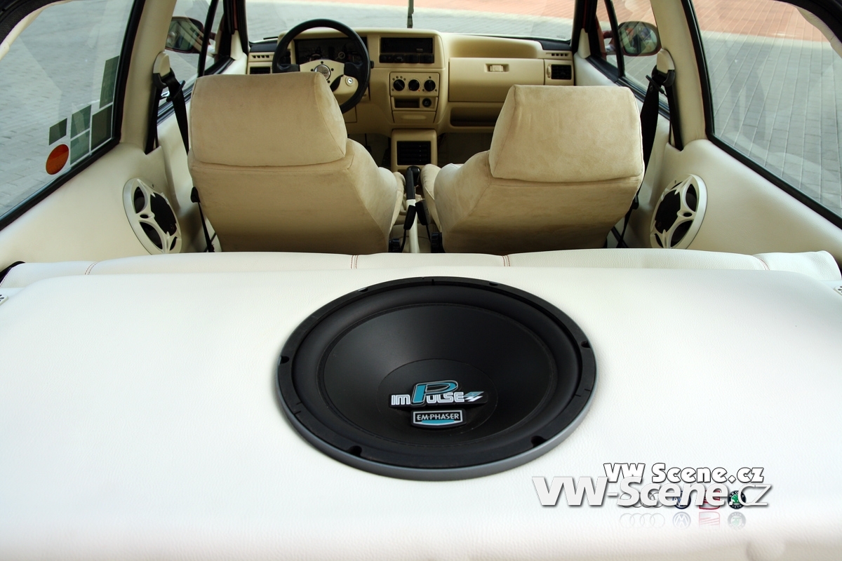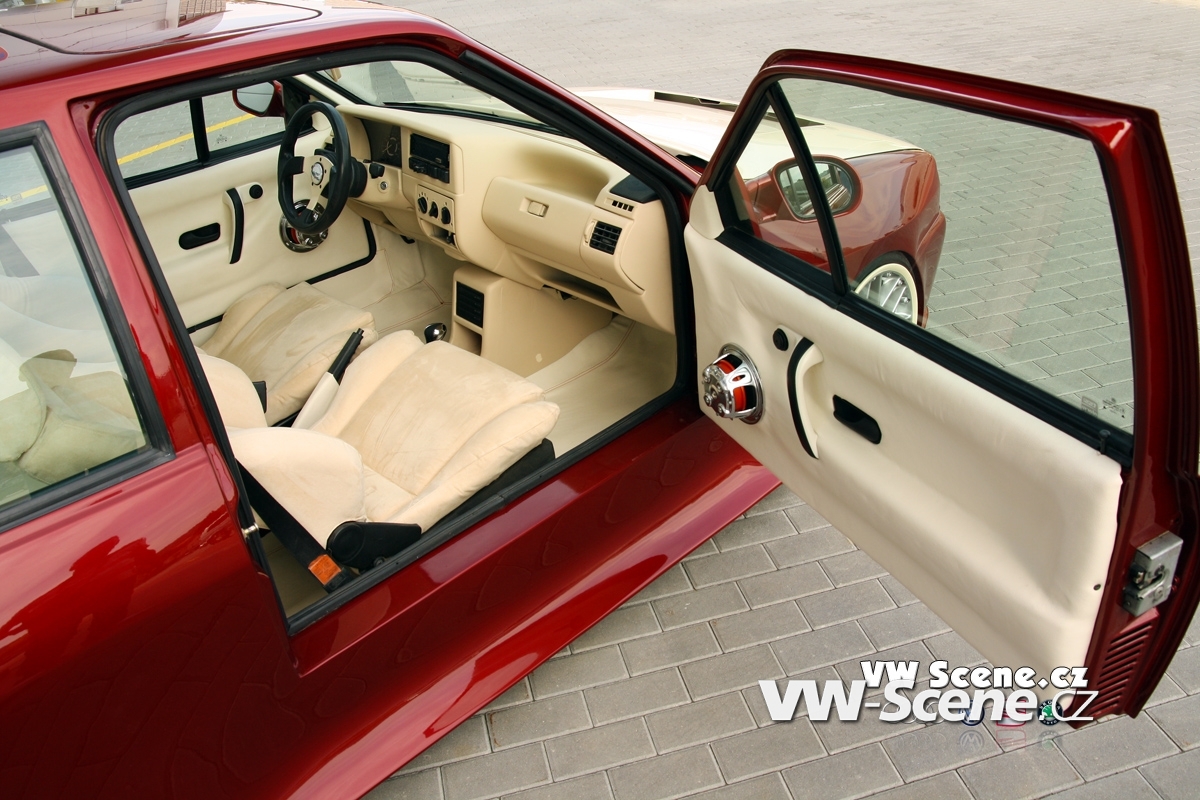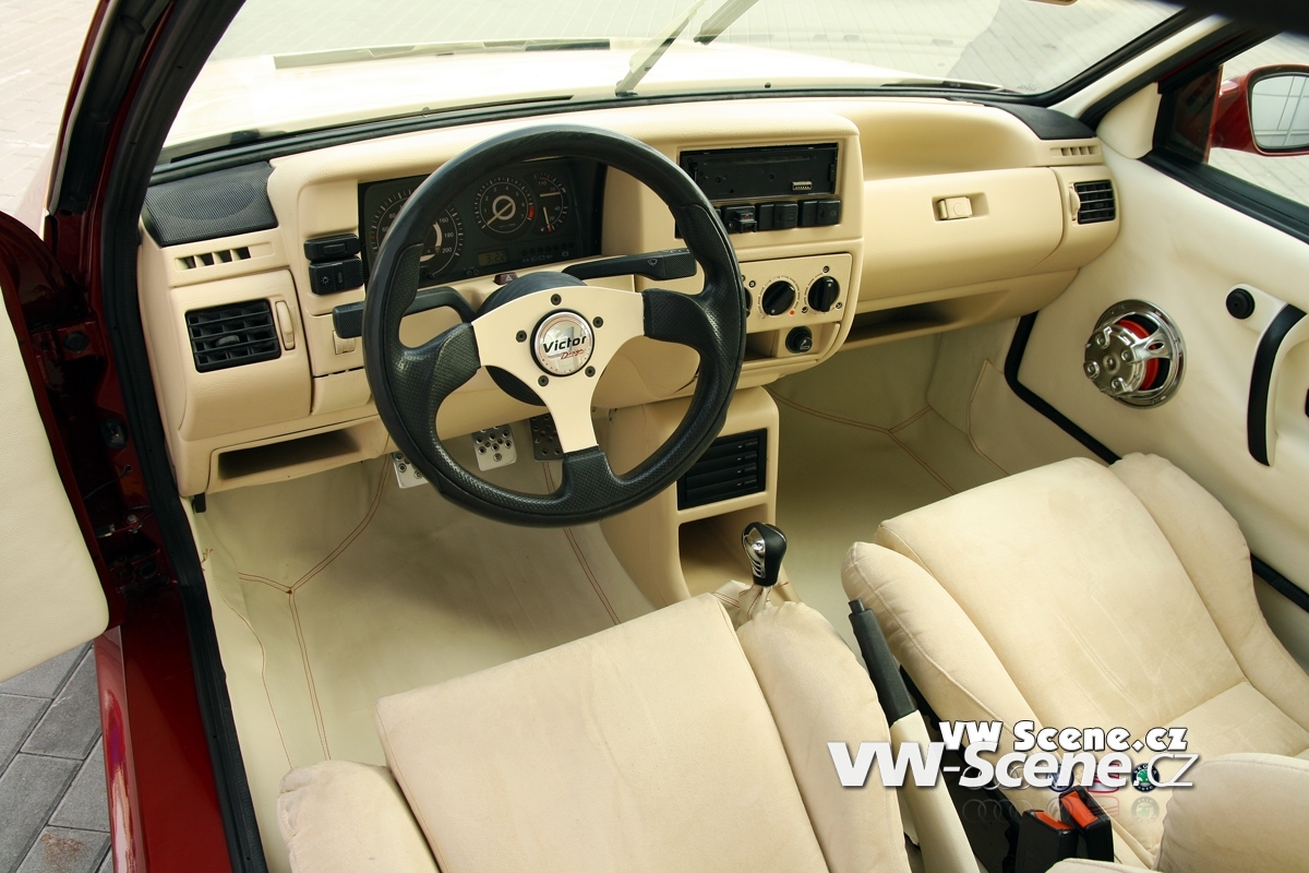V interiéru se zase Roman pořádně rozjel. Přestavba by se dala nazvat „Co není béžové je špatné“ a je celkem jedno jestli to zařídila koženka, alcantara nebo lak. Palubní deska, obklady dveří, elektrická sedadla z Golfu II, strop i podlaha vše má stejný odstín. Vše je doplněno sportovním volantem Victor, zkrácenou řadicí pákou a hliníkovými pedály. Noční jízdu zpříjemňuje indigo podsvícení budíků a ovladačů. Základní hifiaparatura je sestavena z čelní jednotky Blaupunkt, předních koaxiálních reproduktorů, zadních oválů a zesilovače Emphaser.