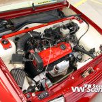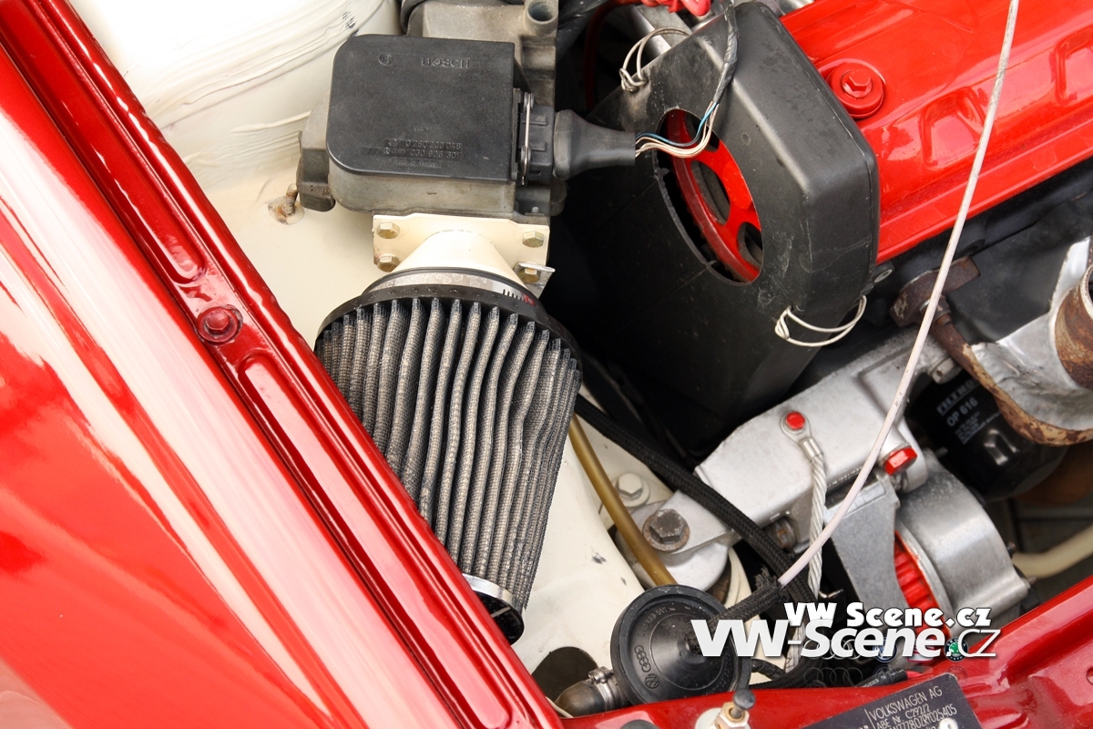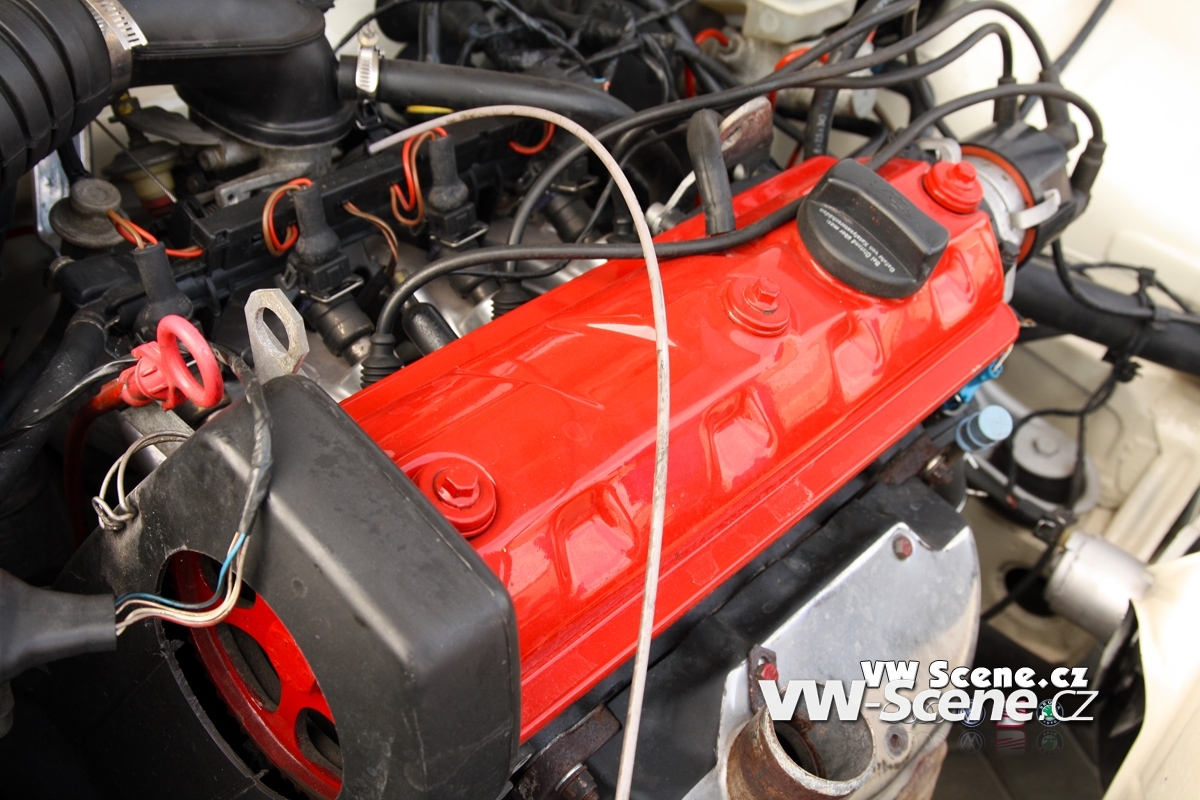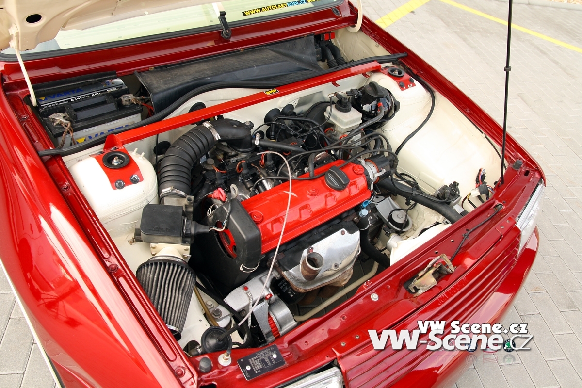 Pod kapotou se již z výroby usídlil motor o objemu 1,3 litru, který dává slušných 75 koní. Úprav sice prodělal mnohem méně, než exteriér vozu, přesto zde narazíte na několik základních, které budou časem ještě rozšiřovat. Rozhodně si všimnete béžového motorového prosotru, který koresponduje s kapotou. Samotný agregát pokryl odstín červený, černý a stříbrná imitace hliníku. Mezi tlumiči narazíte na rozpěrnou tyč OMP. O lehký nárůst koní se stará otevřený vzduchový filtr K&N, laděný koncový díl tlumiče i odstranění středové tlumiče.