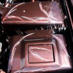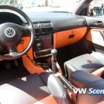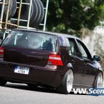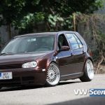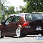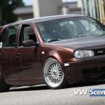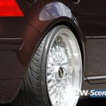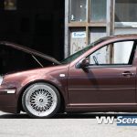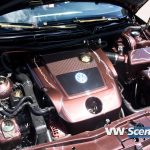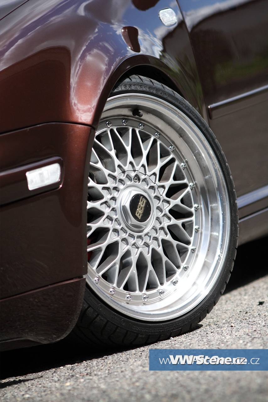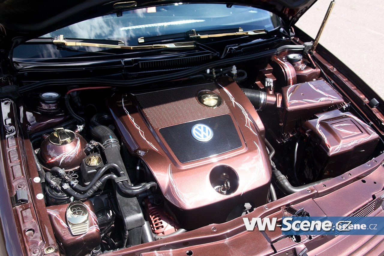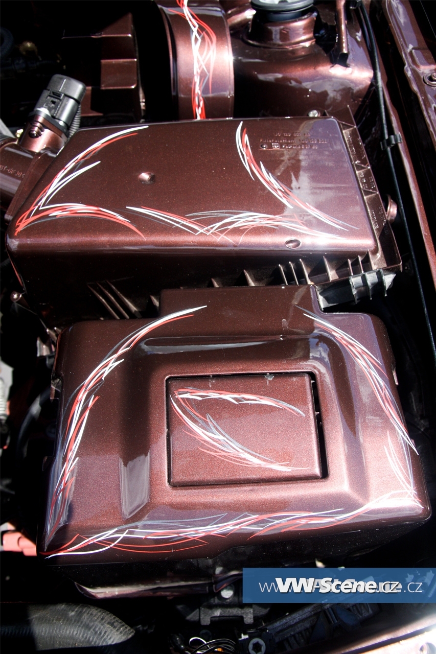 Důležitým prvkem každého natuněného auta jsou i kola. Zde na auto majitel použil osmnáctky DARE RS vpředu osm palců a vzadu devět a půl. Ale jak jsme se dozvěděli, změna je život a na Chokletě se opět objeví „kanály“. K zemi ji MiLič spustil pomocí stavitelného podvozku JOM o jeho maximum a nové dal i přední třmeny s těhlicemi z benzínové verze 1,8T 110kW. Nezapomněl ani na nalakování nápravy, ramen, těhlic či stabilizátoru do červeno hnědé barvy. Podvozek nově ochráněn proti korozi a nalakován do černé lesklé barvy. Motor o výkonu 115 koní byl dokonale očištěn a včetně převodovky nalakován do černého matu. Ostatní drobnosti opět dostaly červenohnědé lakování a vše doplňují plasty v barvě vozu obohaceny pinstriping. Ve vybroušeném a lakovaném prostoru dobře vynikají zlacená víčka nádobek.