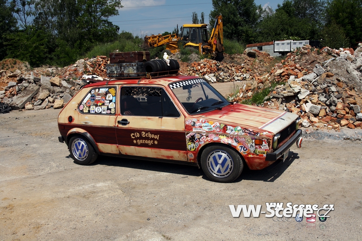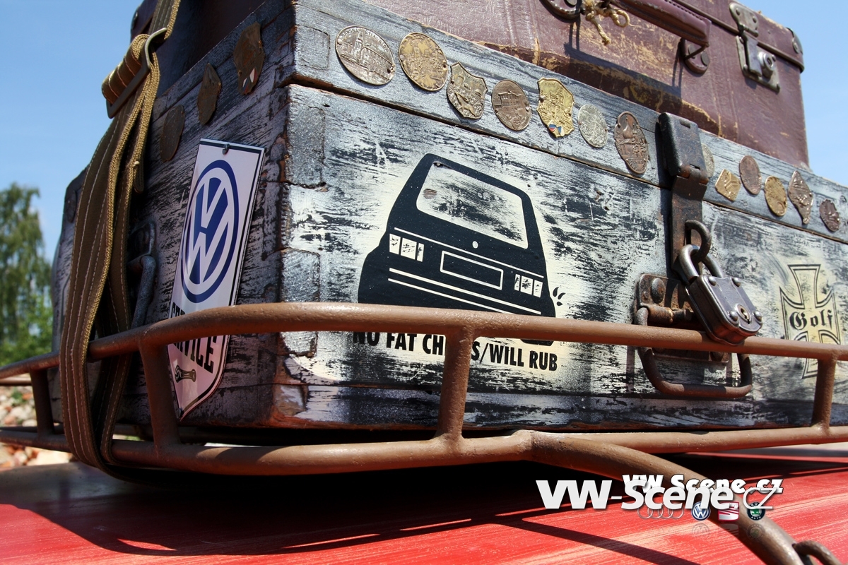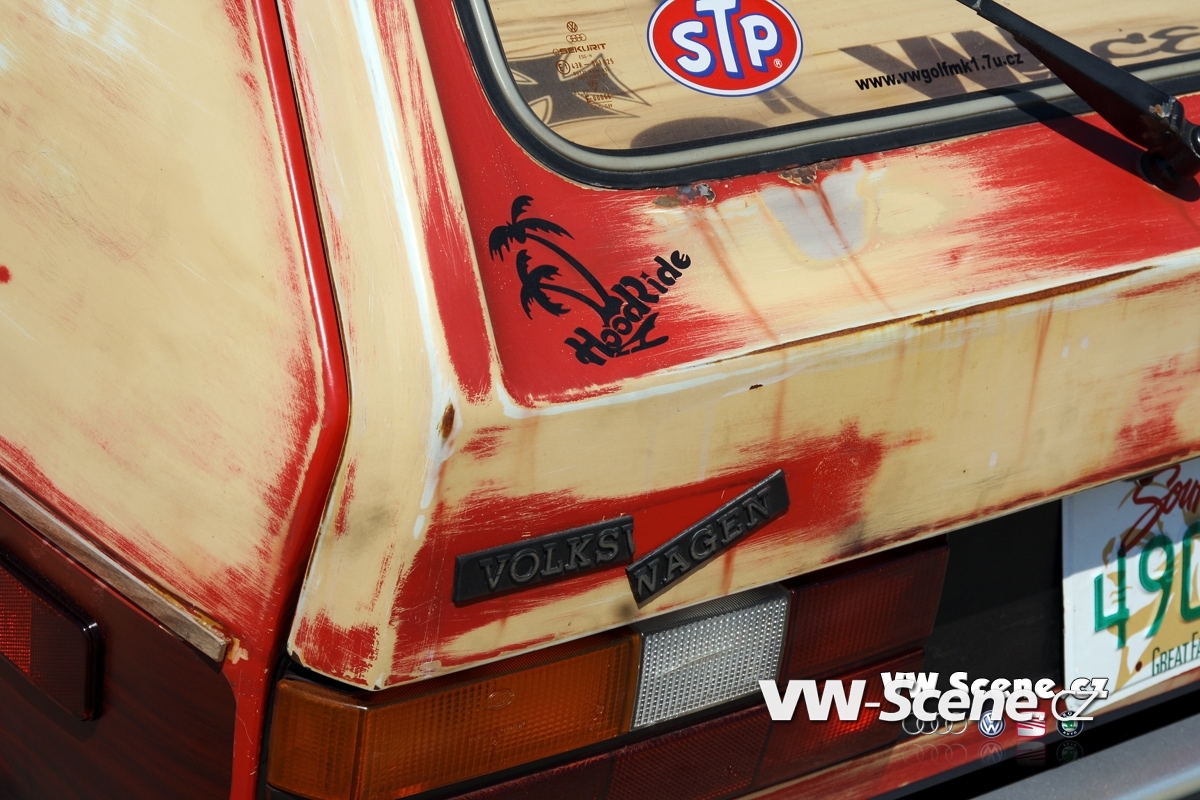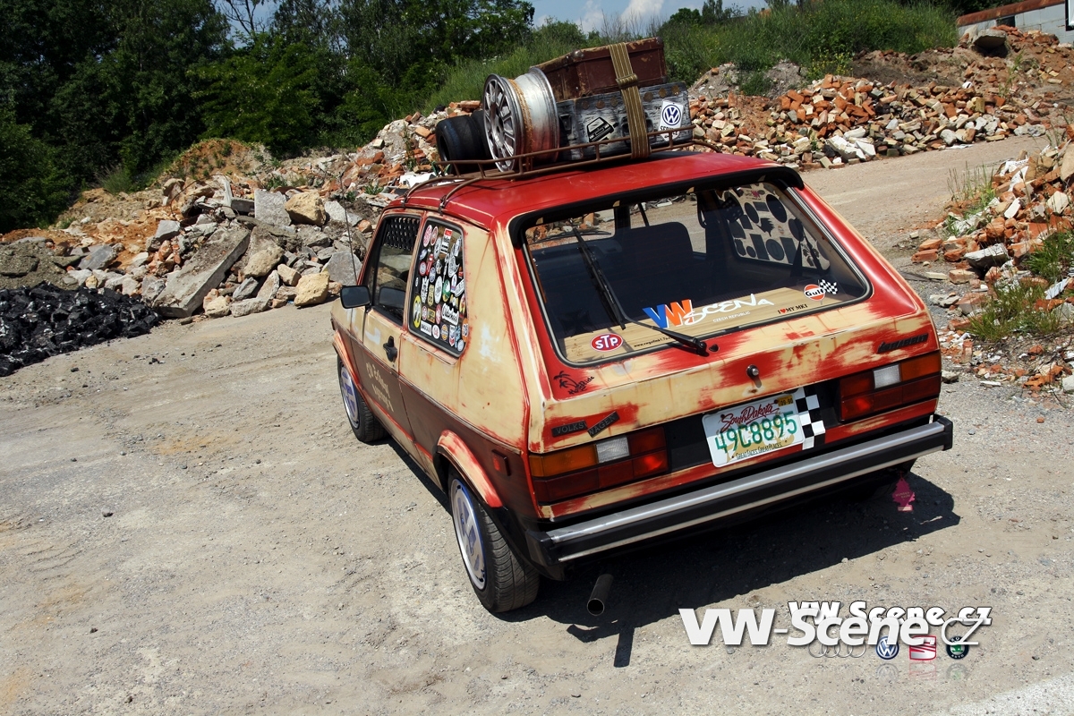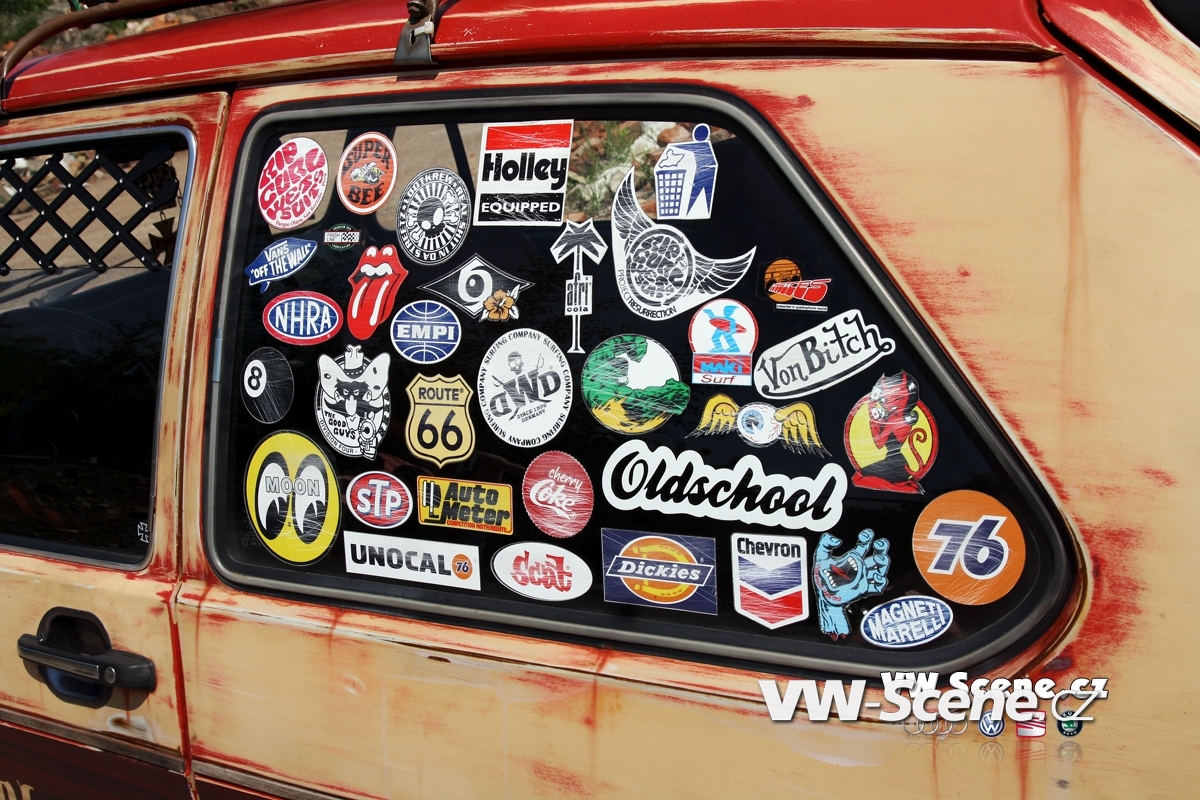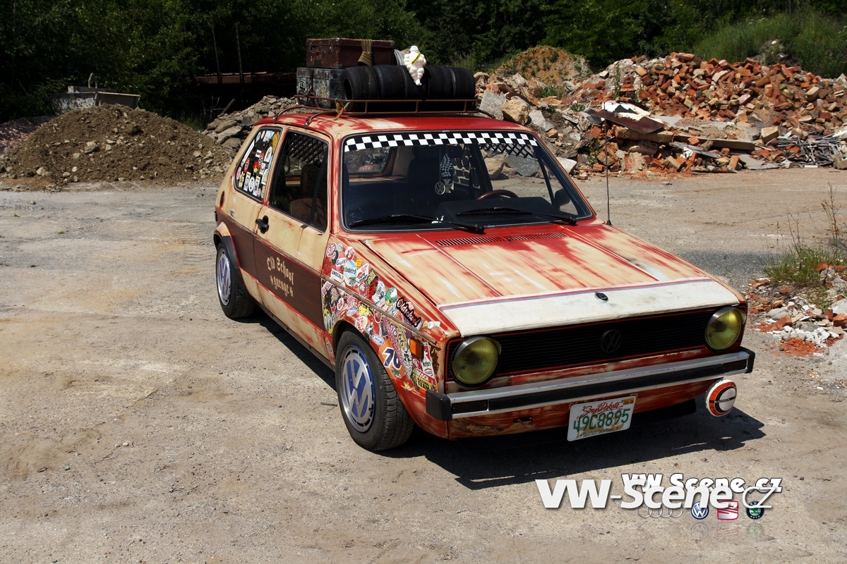 Auto upraveného v tomto stylu potkáte na našich silnicích zatím zřídka. Když se vám to ale poštěstí, určitě si ho všimnete. Bude mít na zahrádce soustu nepotřebného harampádí a olejovou vanu bude tahat po silnici. Tak má totiž správně každá krysa vypadat. Lukasoo koupil Golfíka již v počátečních raťáckých úpravách. Předchozí majitel, rovněž ostřílený úpravce si dal především záležet na laku karoserie. Původní béžový odstín totiž lehce přestříkal červenou základovou a následně velmi efektně obrousil. Někde přitlačil více, až na plech, jinde zase skoro vůbec ne. Tam základovka zůstala. Výsledek je dokonalý. Americký styl je zde zastoupen dřevěnou fólií, evokující obklady starých amerik a odrazky na bocích. Pravý přední blatník a boční okna okupuje množství různých samolepek. Lukasoo vtipně naložil s úpravou kapoty. Ta má na sobě nataženou pytlovinu, která je tak parafrází na oblíbené kožené přetahy leštěnek. Přední žluté světlomety, doplněné o kultíky, jsou zasazeny do nové masky. Úpravce je pyšný na tzv. malé nárazníky, které majitelé Golfů vyvažují zlatem. Pod předním nechybí singl mlhovka. Obsah zahrádky na střeše se většinou trochu mění. V době focení tam byla sratá dřevěná truhla, použité pneumatiky z motokáry, panáček Michelin a starý loďák.