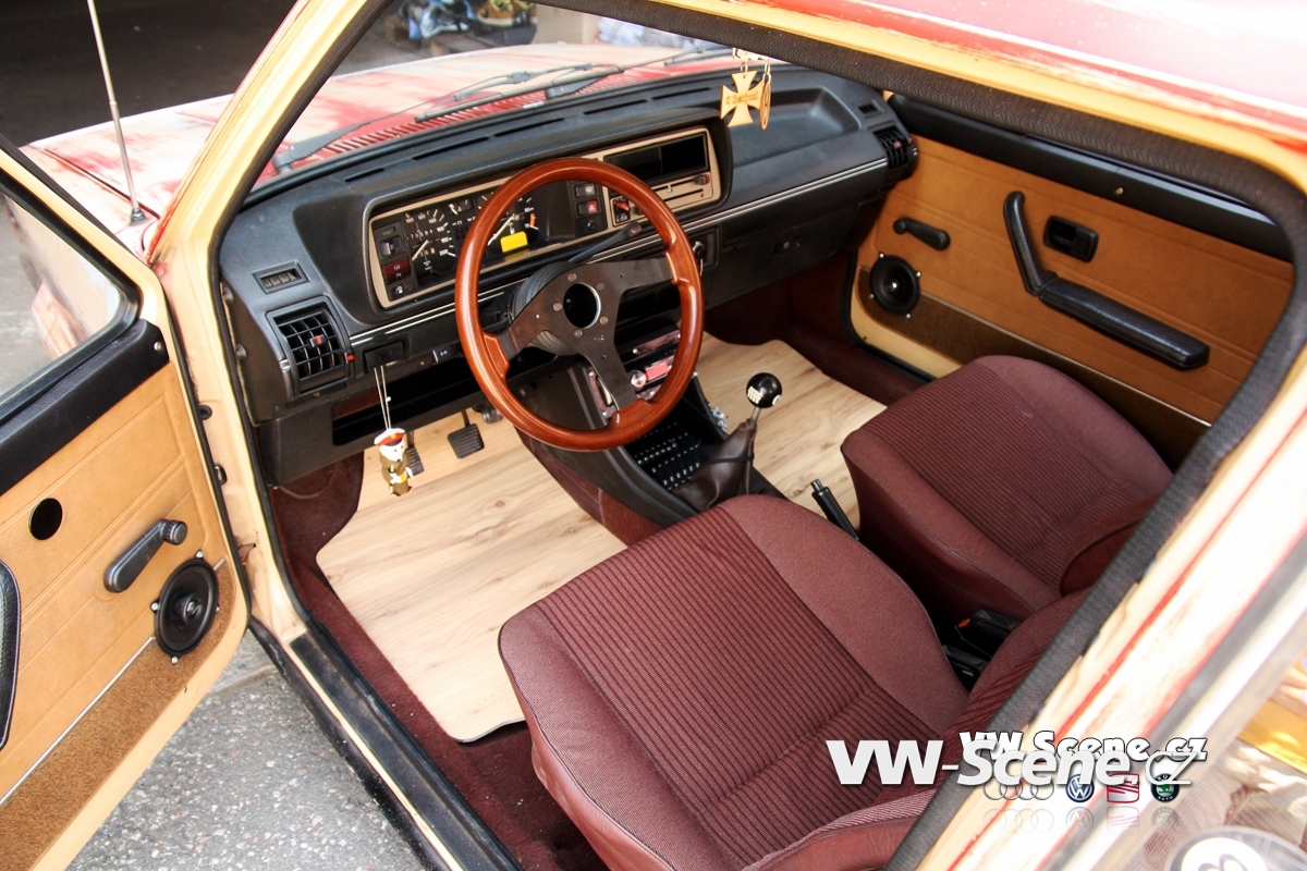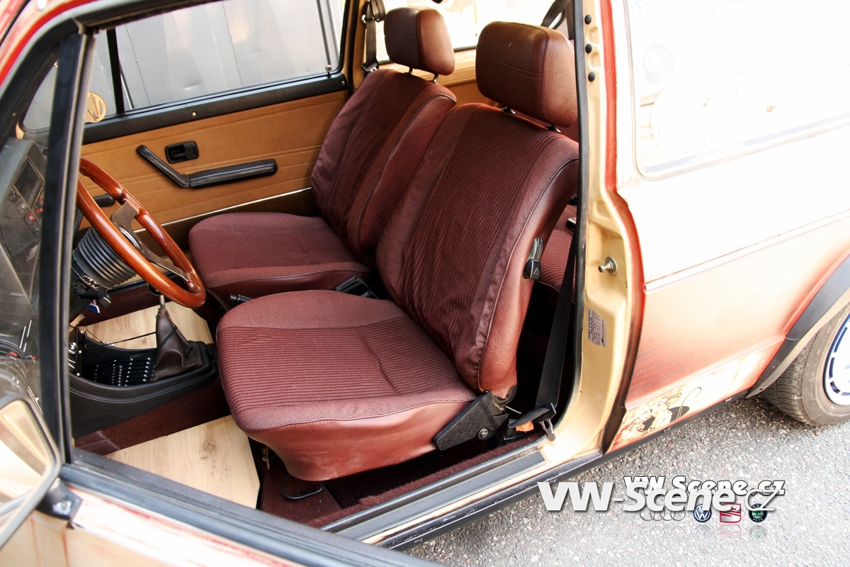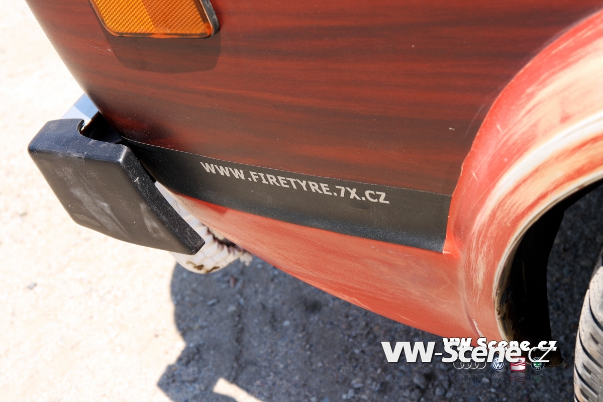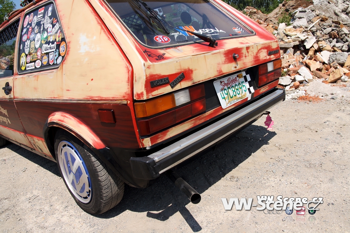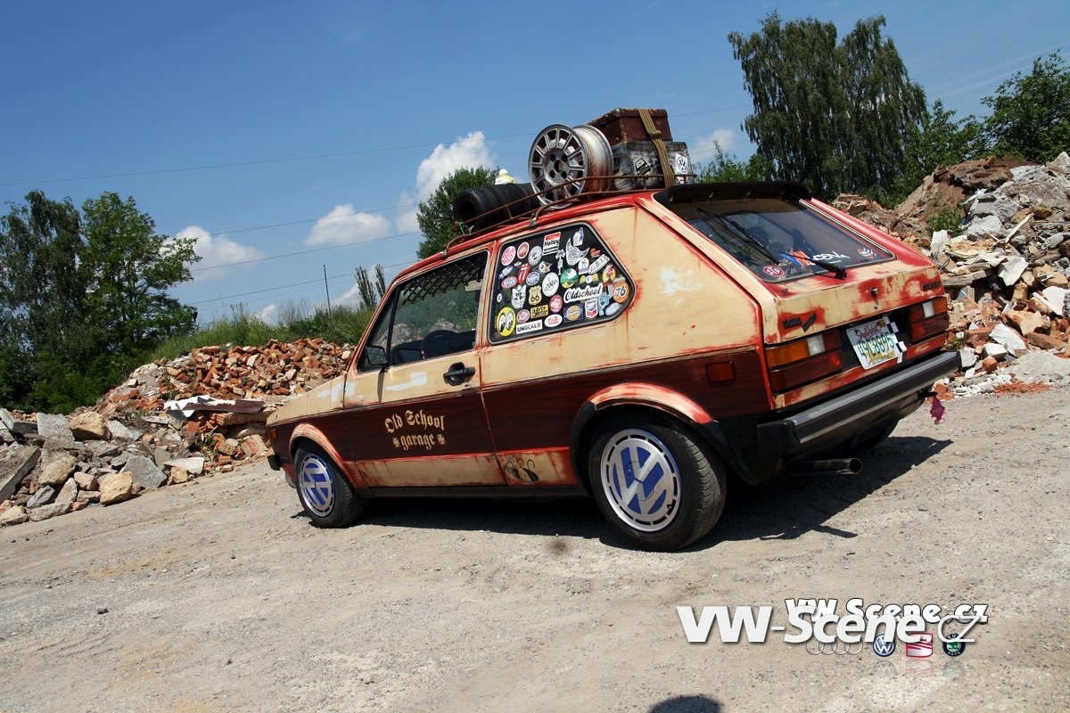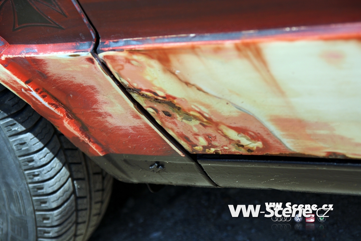 Auto upraveného v tomto stylu potkáte na našich silnicích zatím zřídka. Když se vám to ale poštěstí, určitě si ho všimnete. Bude mít na zahrádce soustu nepotřebného harampádí a olejovou vanu bude tahat po silnici. Tak má totiž správně každá krysa vypadat. Lukasoo koupil Golfíka již v počátečních raťáckých úpravách. Předchozí majitel, rovněž ostřílený úpravce si dal především záležet na laku karoserie. Původní béžový odstín totiž lehce přestříkal červenou základovou a následně velmi efektně obrousil. Někde přitlačil více, až na plech, jinde zase skoro vůbec ne. Tam základovka zůstala. Výsledek je dokonalý. Americký styl je zde zastoupen dřevěnou fólií, evokující obklady starých amerik a odrazky na bocích. Pravý přední blatník a boční okna okupuje množství různých samolepek. Lukasoo vtipně naložil s úpravou kapoty. Ta má na sobě nataženou pytlovinu, která je tak parafrází na oblíbené kožené přetahy leštěnek. Přední žluté světlomety, doplněné o kultíky, jsou zasazeny do nové masky. Úpravce je pyšný na tzv. malé nárazníky, které majitelé Golfů vyvažují zlatem. Pod předním nechybí singl mlhovka. Obsah zahrádky na střeše se většinou trochu mění. V době focení tam byla sratá dřevěná truhla, použité pneumatiky z motokáry, panáček Michelin a starý loďák.