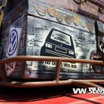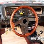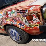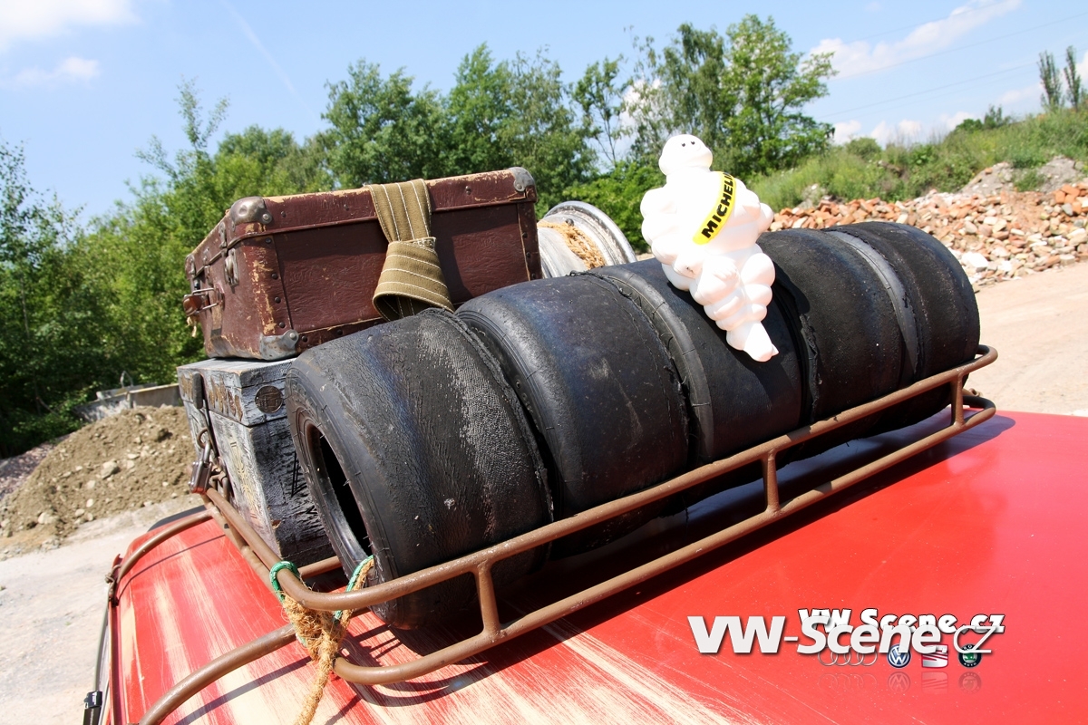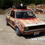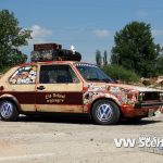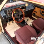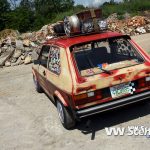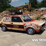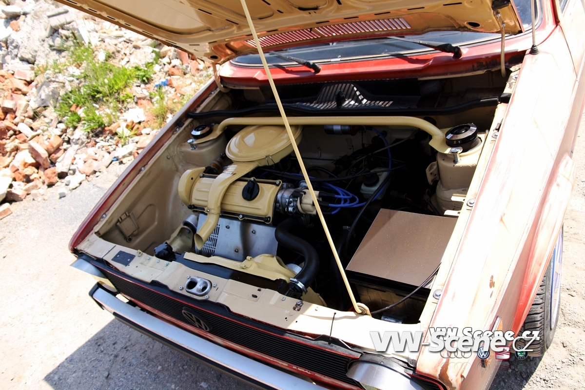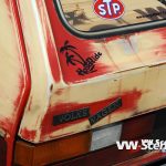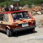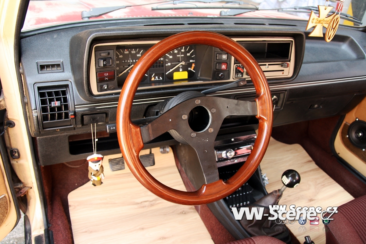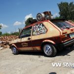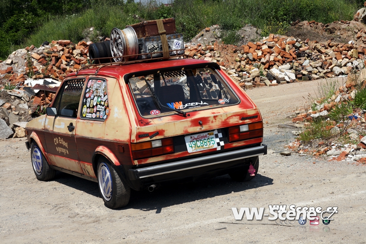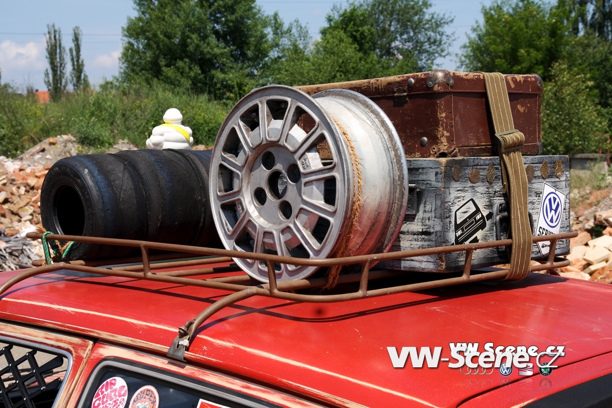 Auto upraveného v tomto stylu potkáte na našich silnicích zatím zřídka. Když se vám to ale poštěstí, určitě si ho všimnete. Bude mít na zahrádce soustu nepotřebného harampádí a olejovou vanu bude tahat po silnici. Tak má totiž správně každá krysa vypadat. Lukasoo koupil Golfíka již v počátečních raťáckých úpravách. Předchozí majitel, rovněž ostřílený úpravce si dal především záležet na laku karoserie. Původní béžový odstín totiž lehce přestříkal červenou základovou a následně velmi efektně obrousil. Někde přitlačil více, až na plech, jinde zase skoro vůbec ne. Tam základovka zůstala. Výsledek je dokonalý. Americký styl je zde zastoupen dřevěnou fólií, evokující obklady starých amerik a odrazky na bocích. Pravý přední blatník a boční okna okupuje množství různých samolepek. Lukasoo vtipně naložil s úpravou kapoty. Ta má na sobě nataženou pytlovinu, která je tak parafrází na oblíbené kožené přetahy leštěnek. Přední žluté světlomety, doplněné o kultíky, jsou zasazeny do nové masky. Úpravce je pyšný na tzv. malé nárazníky, které majitelé Golfů vyvažují zlatem. Pod předním nechybí singl mlhovka. Obsah zahrádky na střeše se většinou trochu mění. V době focení tam byla sratá dřevěná truhla, použité pneumatiky z motokáry, panáček Michelin a starý loďák.