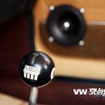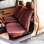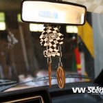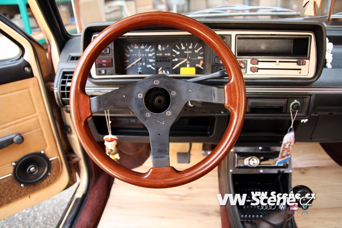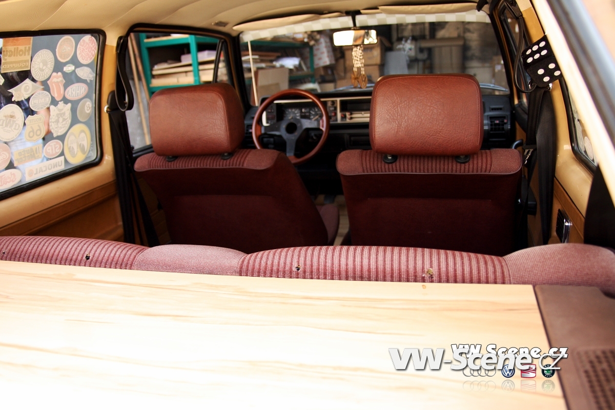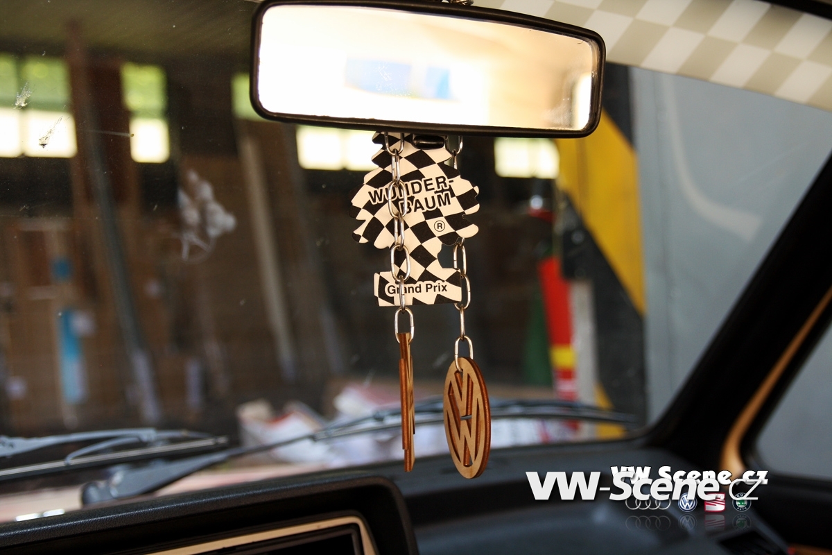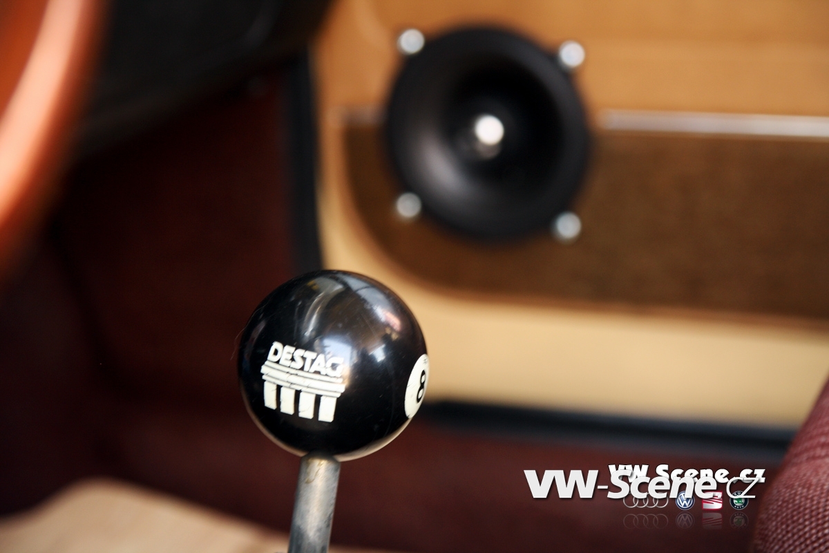 Interiér je především o detailech. Řidič udává směr přes dřevěný volant Victor a volbu rychlostních stupňů přes hlavici řadicí páky v podobě černé kulečníkové koule s číslem 8. Místo klasických vyšívaných koberečků zde narazíte na plovoucí laminátovou podlahu. S čím se rozhodně nešetřilo, jsou talismani. Jednak je to figurka zeleného mužíčka v podobě příslušníka SNB, vonný stromeček, plyšové kostky a dřevěný znak VW.