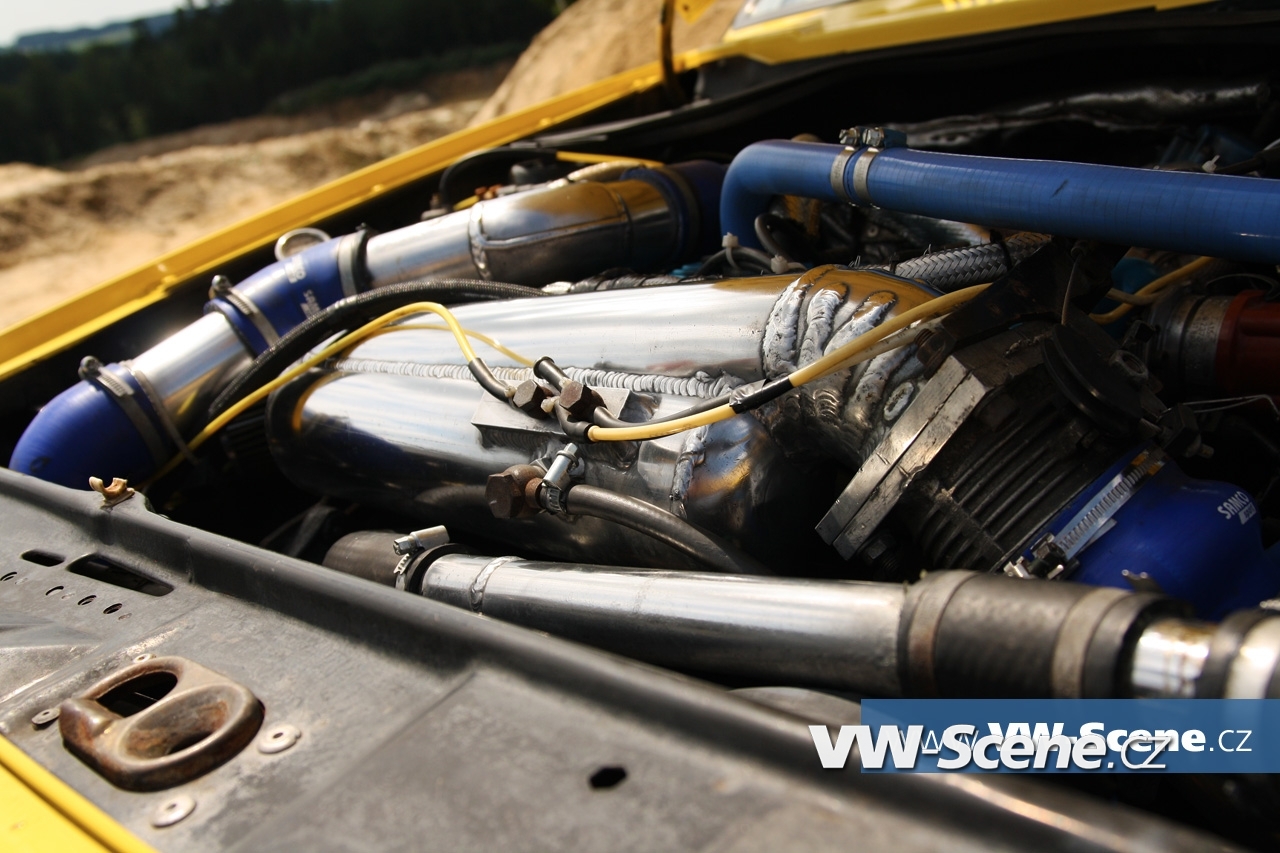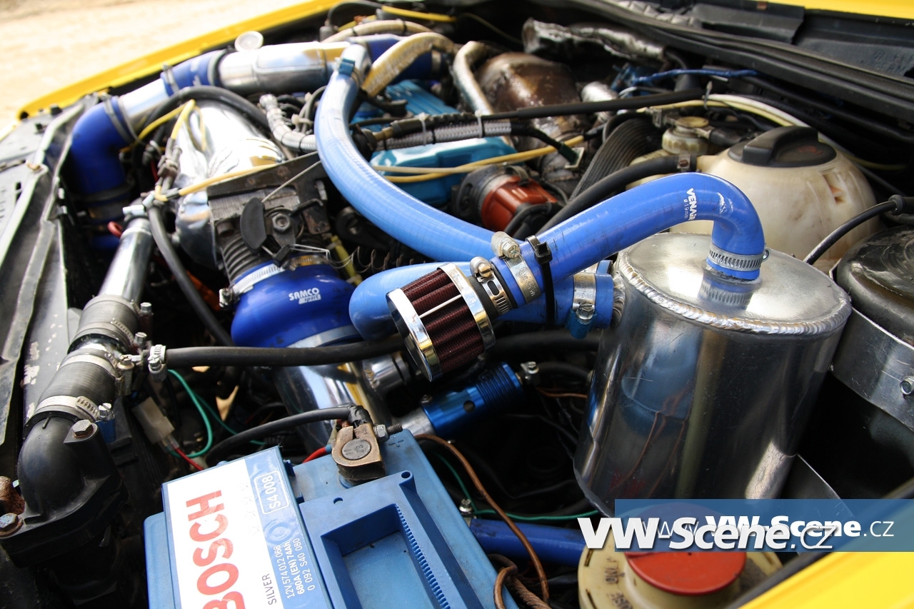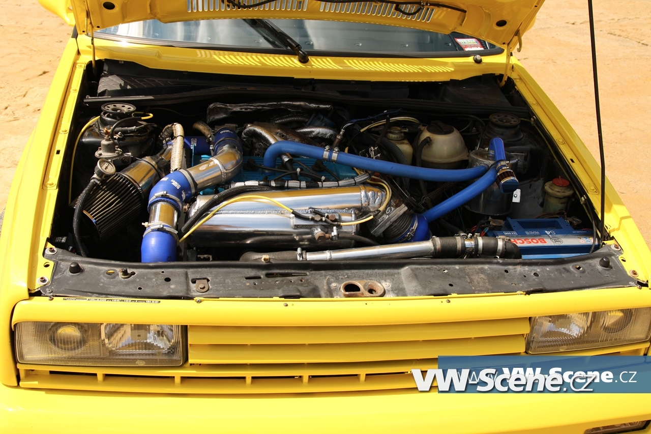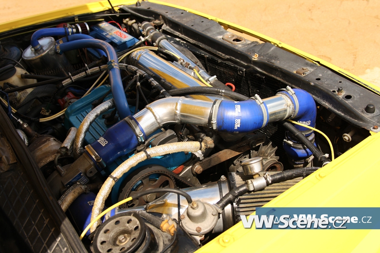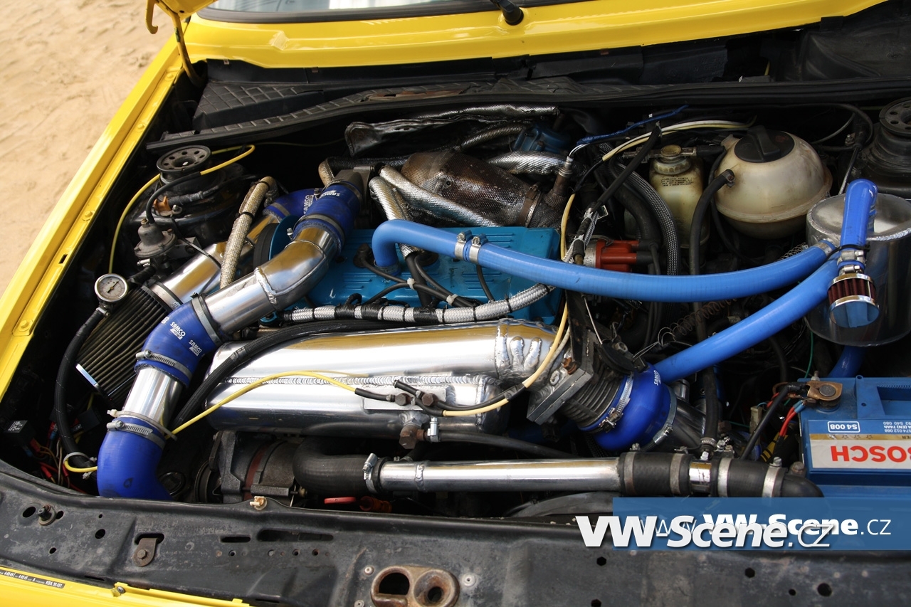 Výfukem proudí spaliny, které produkuje agregát uschovaný pod kapotou. Původní G60ka byla na konci své existence a tak nastalo váhání, kterým motorem jí nahradit. Do úvahy připadaly dvě varianty. Buď oblíbená 1.8T nebo atmosférický 2.0 16V z modelu GTI, oba jsou si co do počtu koní vyrovnaní. Úpravce se, spolu se svým kamarádem Františkem Marchalou, rozhodl pro dvoulitr. Ten totiž hrál velkou roli při naplánované přestavbě s dosazeným turbodmychadlem. Osadili ho totiž typem KKK26 s tlakem nastaveným na 1,2 baru. Museli ovšem provést mnoho změn, aby byl agregát vůbec schopný vyprodukovat nějaký ten výkon. Předně snížili kompresní poměr tím, že osoustružili písty o 2 mm a ke slovu přišly i vyleštěné ojnice, intercooler, svody, nové hadice, trubky a vstřiky z Audi S2. Nutností byl otevřený vzduchový filtr KN. Zajímavostí je, že zde ponechali původní řídící jednotku, která se dočkala pouze přeprogramování. Možná to na první pohled vypadá jako náhodné poskládání součástek z různých aut, ovšem opak je pravdou. Za touto kombinací stojí stovky odzkoušených kilometrů nadšenců do motosportu. Výkon takto upraveného motoru atakuje v současné době hranici 260 koní. Naplánována je i spolupráce s panem Martinem Heřmánkem, který pomůže majiteli zrealizovat navýšení tlaku na 1,6 až 1,8 baru a tím pádem dosažení vytouženého výkonu 300 koní.