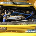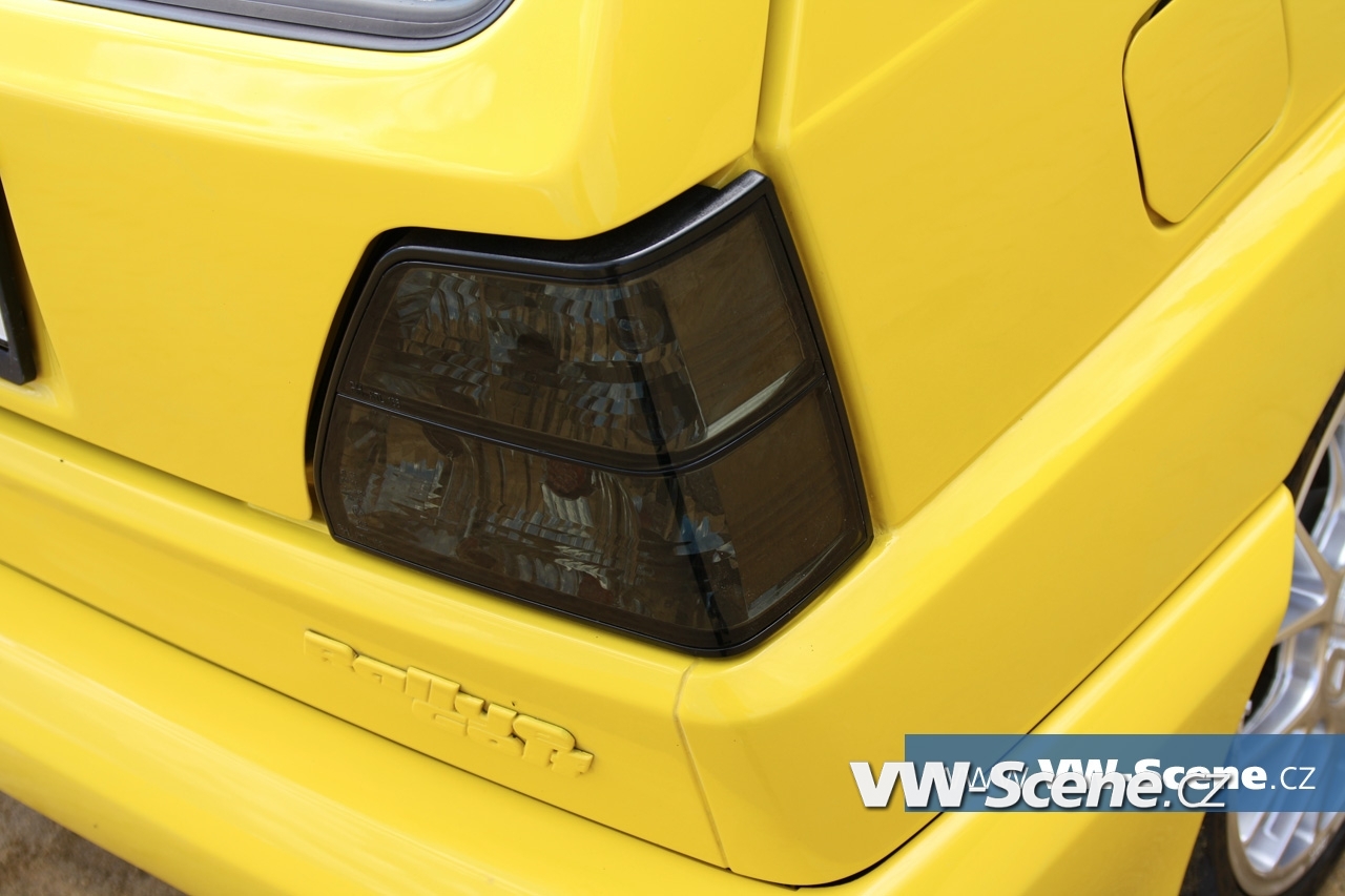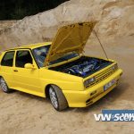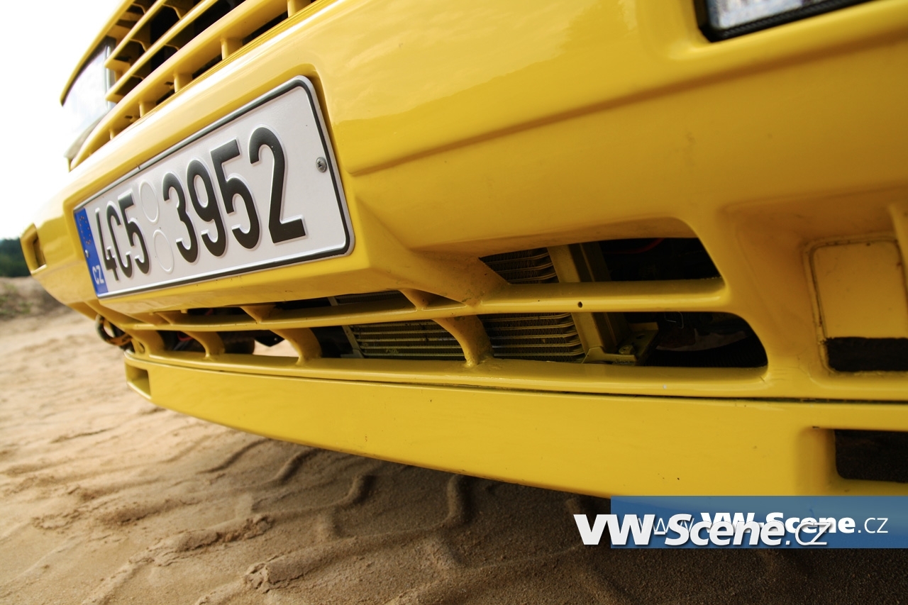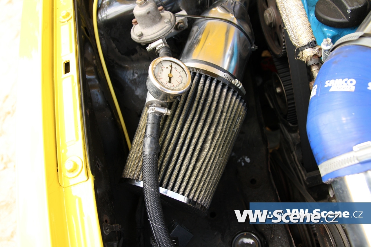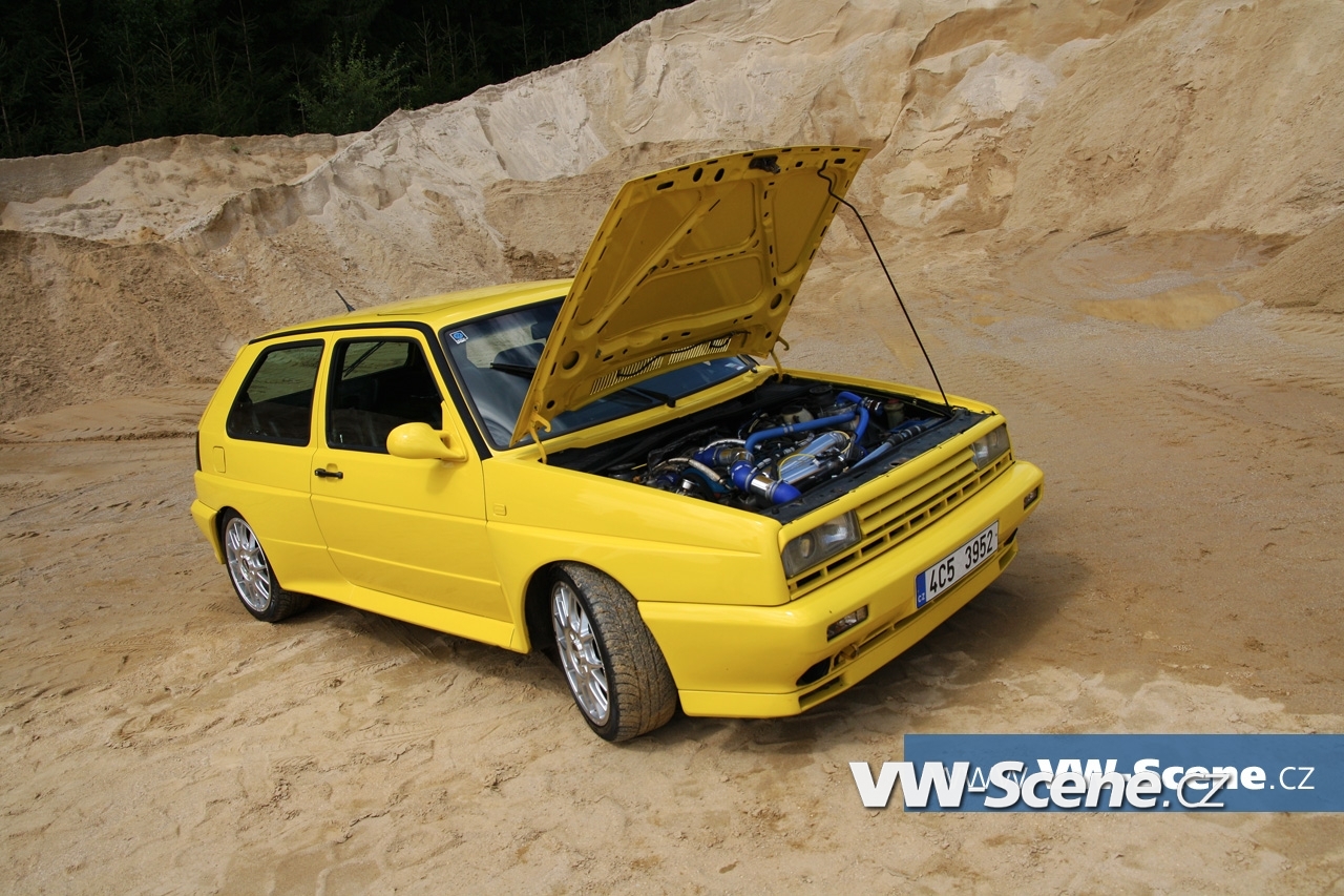 Výfukem proudí spaliny, které produkuje agregát uschovaný pod kapotou. Původní G60ka byla na konci své existence a tak nastalo váhání, kterým motorem jí nahradit. Do úvahy připadaly dvě varianty. Buď oblíbená 1.8T nebo atmosférický 2.0 16V z modelu GTI, oba jsou si co do počtu koní vyrovnaní. Úpravce se, spolu se svým kamarádem Františkem Marchalou, rozhodl pro dvoulitr. Ten totiž hrál velkou roli při naplánované přestavbě s dosazeným turbodmychadlem. Osadili ho totiž typem KKK26 s tlakem nastaveným na 1,2 baru. Museli ovšem provést mnoho změn, aby byl agregát vůbec schopný vyprodukovat nějaký ten výkon. Předně snížili kompresní poměr tím, že osoustružili písty o 2 mm a ke slovu přišly i vyleštěné ojnice, intercooler, svody, nové hadice, trubky a vstřiky z Audi S2. Nutností byl otevřený vzduchový filtr KN. Zajímavostí je, že zde ponechali původní řídící jednotku, která se dočkala pouze přeprogramování. Možná to na první pohled vypadá jako náhodné poskládání součástek z různých aut, ovšem opak je pravdou. Za touto kombinací stojí stovky odzkoušených kilometrů nadšenců do motosportu. Výkon takto upraveného motoru atakuje v současné době hranici 260 koní. Naplánována je i spolupráce s panem Martinem Heřmánkem, který pomůže majiteli zrealizovat navýšení tlaku na 1,6 až 1,8 baru a tím pádem dosažení vytouženého výkonu 300 koní.