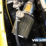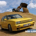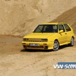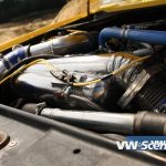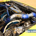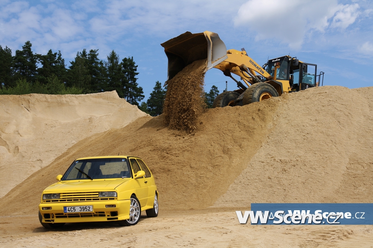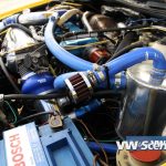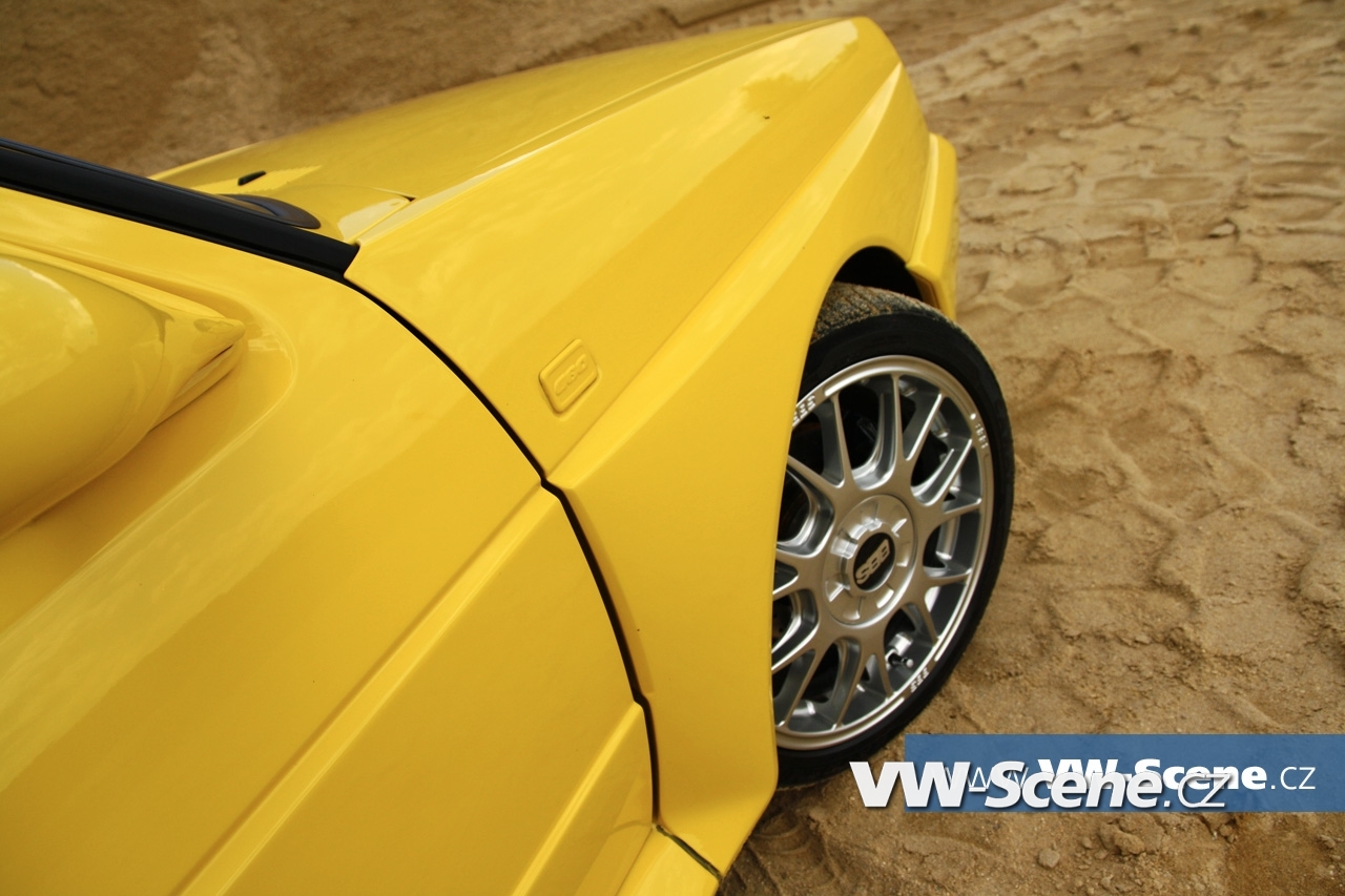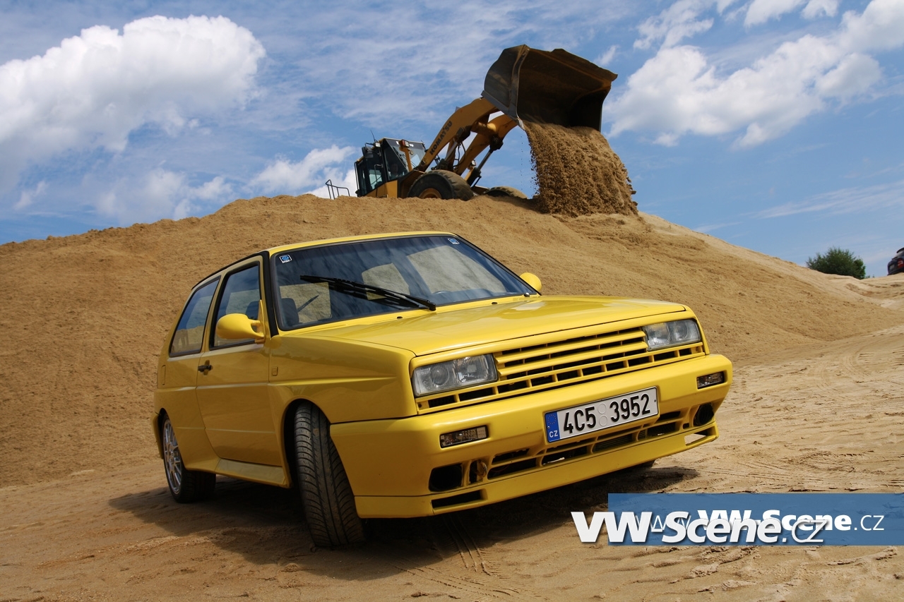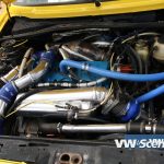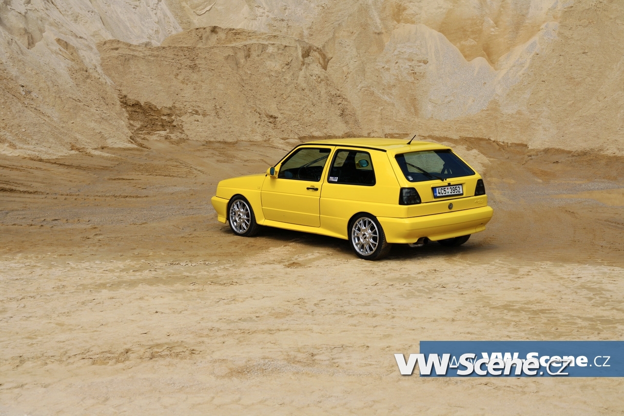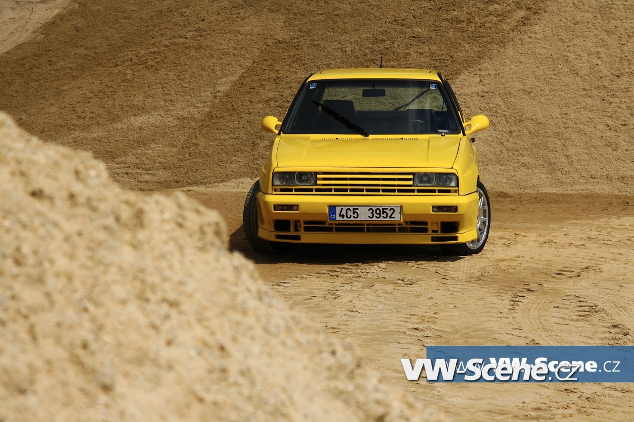 Výfukem proudí spaliny, které produkuje agregát uschovaný pod kapotou. Původní G60ka byla na konci své existence a tak nastalo váhání, kterým motorem jí nahradit. Do úvahy připadaly dvě varianty. Buď oblíbená 1.8T nebo atmosférický 2.0 16V z modelu GTI, oba jsou si co do počtu koní vyrovnaní. Úpravce se, spolu se svým kamarádem Františkem Marchalou, rozhodl pro dvoulitr. Ten totiž hrál velkou roli při naplánované přestavbě s dosazeným turbodmychadlem. Osadili ho totiž typem KKK26 s tlakem nastaveným na 1,2 baru. Museli ovšem provést mnoho změn, aby byl agregát vůbec schopný vyprodukovat nějaký ten výkon. Předně snížili kompresní poměr tím, že osoustružili písty o 2 mm a ke slovu přišly i vyleštěné ojnice, intercooler, svody, nové hadice, trubky a vstřiky z Audi S2. Nutností byl otevřený vzduchový filtr KN. Zajímavostí je, že zde ponechali původní řídící jednotku, která se dočkala pouze přeprogramování. Možná to na první pohled vypadá jako náhodné poskládání součástek z různých aut, ovšem opak je pravdou. Za touto kombinací stojí stovky odzkoušených kilometrů nadšenců do motosportu. Výkon takto upraveného motoru atakuje v současné době hranici 260 koní. Naplánována je i spolupráce s panem Martinem Heřmánkem, který pomůže majiteli zrealizovat navýšení tlaku na 1,6 až 1,8 baru a tím pádem dosažení vytouženého výkonu 300 koní.