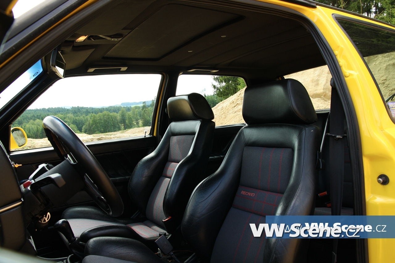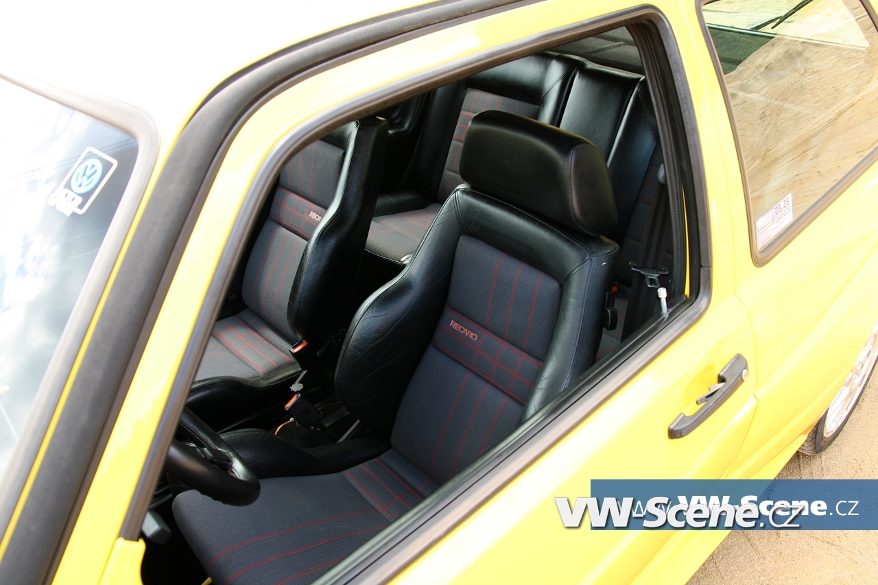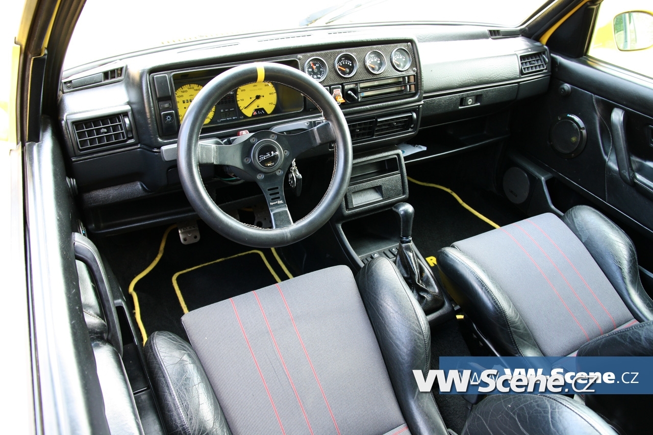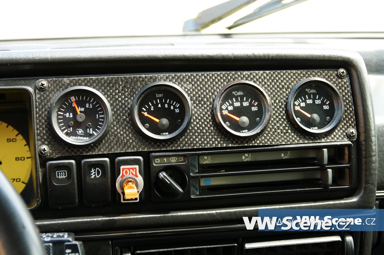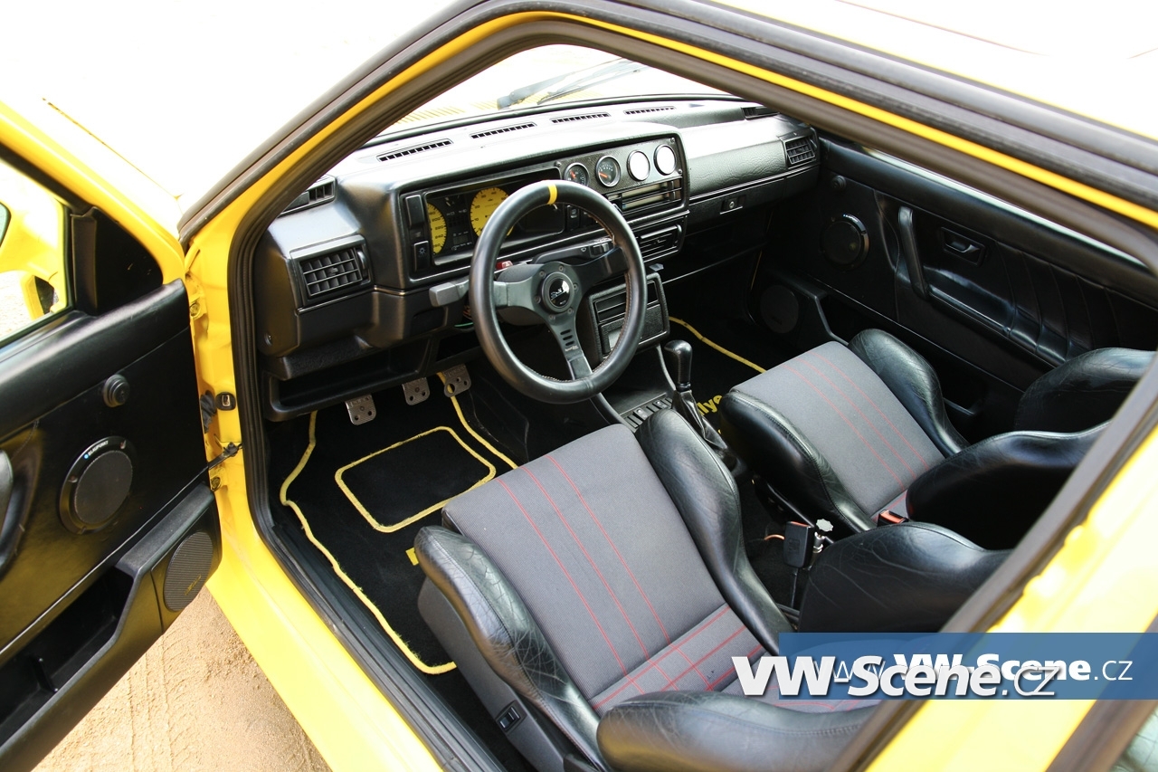 Vrcholový model Golfu druhé generace má interiér vybaven královsky. Zejména polokožená sedadla Recaro potěší všechny cestující. Michal přidal už jen funkční doplňky, jako například čtveřici přídavných budíků okupující místo původně určené pro autorádio a ventil redukce brzdného účinku na nápravách. Ten bude navíc doplněn i hydraulickou ruční brzdou. Nezapomnělo se ani na kožený tříramenný volant, hliníkové pedály Sparco, žluté polepy budíků v kapličce a vkládané koberečky.