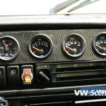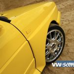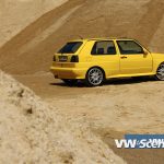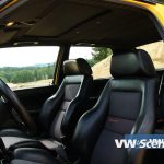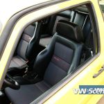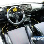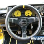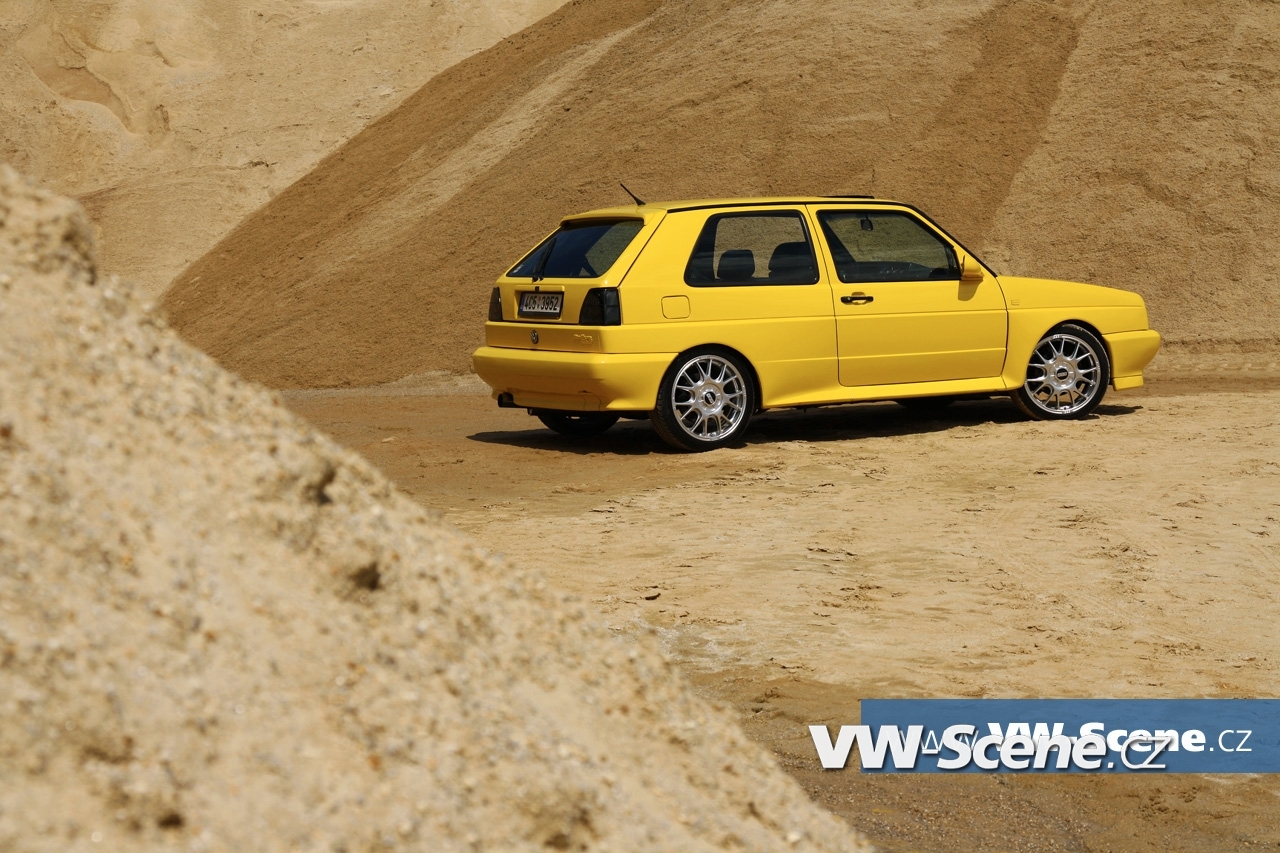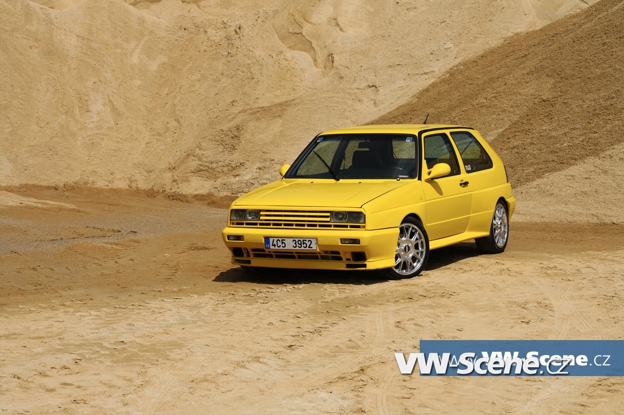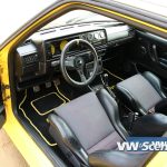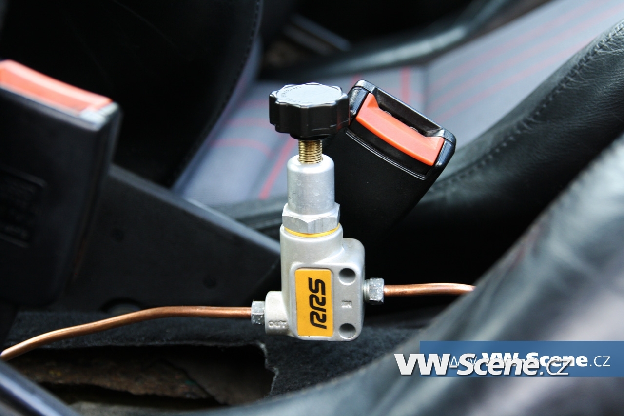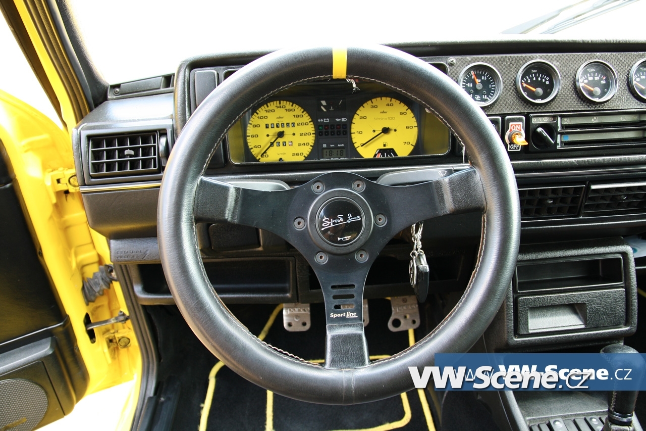 Vrcholový model Golfu druhé generace má interiér vybaven královsky. Zejména polokožená sedadla Recaro potěší všechny cestující. Michal přidal už jen funkční doplňky, jako například čtveřici přídavných budíků okupující místo původně určené pro autorádio a ventil redukce brzdného účinku na nápravách. Ten bude navíc doplněn i hydraulickou ruční brzdou. Nezapomnělo se ani na kožený tříramenný volant, hliníkové pedály Sparco, žluté polepy budíků v kapličce a vkládané koberečky.