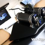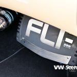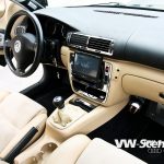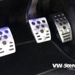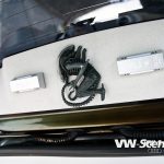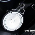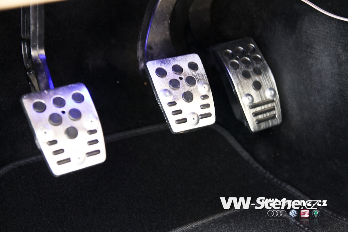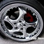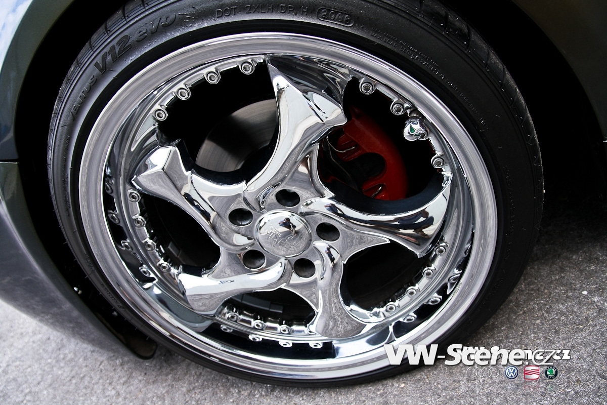 Aby toho chromu nebylo na autě málo, úpravce se rozhodl pro kola od výrobce Keskin. Ten je pojmenoval KT7 a David si vybral rozměr 8,5×18 a 9,5×18. Ráfky jsou zabaleny do černé pryže o velikostech 215/40 a 245/35 od Hankooku. O dodatečné rozšíření stopy se starají 20 mm podložky na všech kolech a se světlou výškou si pohrál stavitelný set značky H&R. Auto poslal k zemi o slušných 65 mm vpředu a 60 mm vzadu. Díky hmotnosti hifiaparatury v kufru to ale nakonec vydalo na 65 mm. Brzdové komponenty dostaly červené lakování a kotouče od ATE.