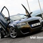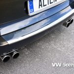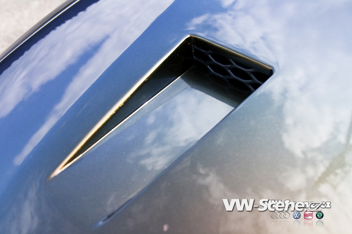 Přední část vozu se musela díky instalaci nárazníku výrazně pozměnit. Nejvíce asi kapota, která je hned o několik centimetrů delší. Ta překrývá přední světlomety Sonar s parkovačkami Angel Eyes a xenonovými výbojkami. Přední nárazník dostal ještě další dva otvory pro nasávání vzduchu k intercooleru a brzdám. Boky auta vypadají na první pohled sériově, ale opak je pravdou. Vnějších zpětných zrcátek ze Škody Superb si všimne jen zasvěcenec, ale vzhůru otevřené dveře Lambodoors už nepřehlédne nikdo. Povrch zrcátek vhodně koresponduje s chromovým paketem na oknech. Stejný materiál se dokonce usadil i na střešních hagusech. Mezi nimi vyčuhuje místo antény hlava vetřelce, který se nedopatřením dostal z uzavřeného prostoru kufru. Zadní část vozu prošla zahlazovacím procesem. Prostor pro RZ byl výrazně zmenšen a o úklid zadního okna se už nikdo nestará. Nákladovou hranu chrání lišta od firmy Kamei a ze spodu nárazníku vystrkuje hlavy čtveřice koncovek výfuku.