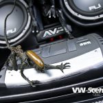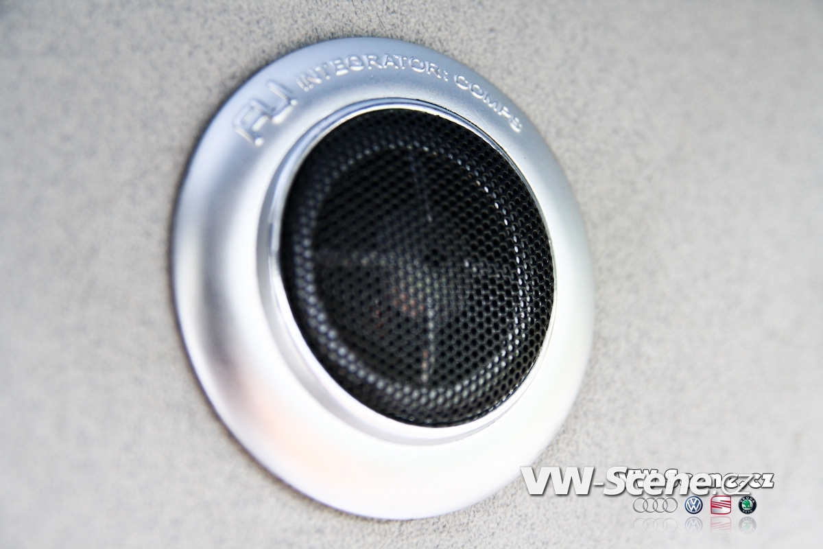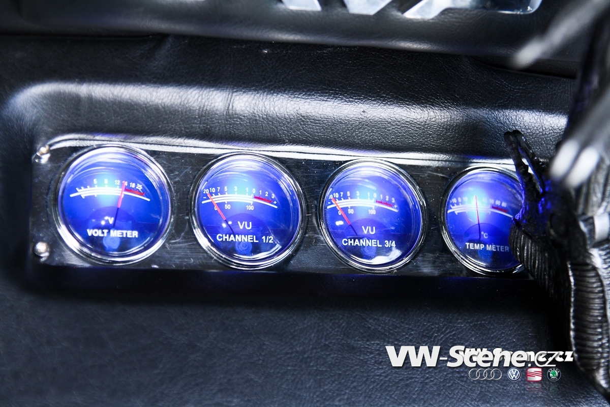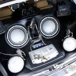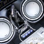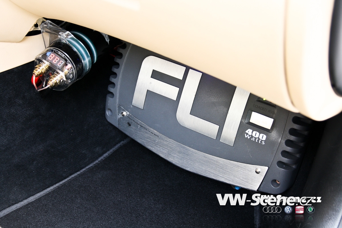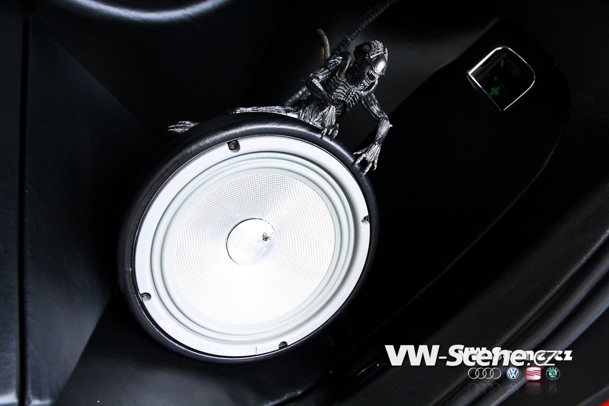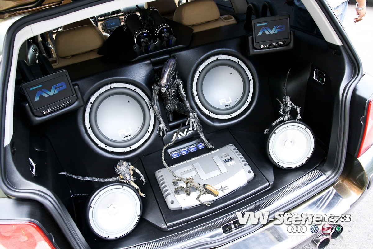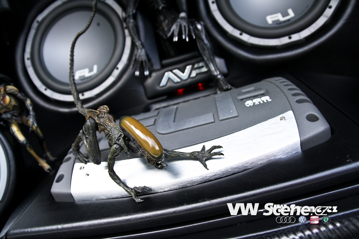 Zavazadlový prostor je samostatnou kapitolou. I přesto, že měl David k dispozici obrovský prostor, měl co dělat, aby se mu sem jeho vysněná hifiaparatura vůbec vešla. Nákupní tašku sem prostě už nedáte. Celá zástavba je velmi zajímavě řešena a postavičkami vetřelců je to zde jen hemží. Opravdu originální je umístění 20 centimetrových komponentů. Jejich jakoby letmé položení na dně kufru spolu s kapkovitou ozvučnicí jsou opravdu geniální. 30 cm woofery FLI více než dostatečně tvrdí muziku. Prostor vpředu mají na starosti 16,5 cm komponenty. Je jasné, že tolik dílů by samotné autorádio nikdy neutáhlo a tak na řadu přišly i zesilovače. Jednak je to dvojice dvoukanálů FLI Loaded 400S, jež jsou umístěny po kousku před spolujezdcem a v kufru a také skrytý čtyřkanál, z kterého vyčnívají jen kontrolní budíky. Celou sestavu hlídá trojice 1F kapacitorů. Davidova zástavba ovšem nedodává jen hudbu, ale také obraz. Vizuální vjemy zprostředkovává centrální DVD přehrávač s navigací a vyjížděcím 7“ monitorem, dále 17“ stropní monitor, dvojice 7“ monitorů v kufru a dokonce i 3,5“ monitor skrytý ve zpětném zrcátku. Druhé přenosné DVD je k dispozici pasažérům na zadních sedadlech. Posádka si může zvolit, co chce právě sledovat. Signály z DVD, herní konzole, nebo kamery se dají poslat na jakýkoliv LCD monitor. V praxi to tedy může vypadat takto. Lze pustit dva různé filmy najednou, hrát hry na Xboxu 360 a přitom sledovat dění za vozem a to vše současně.